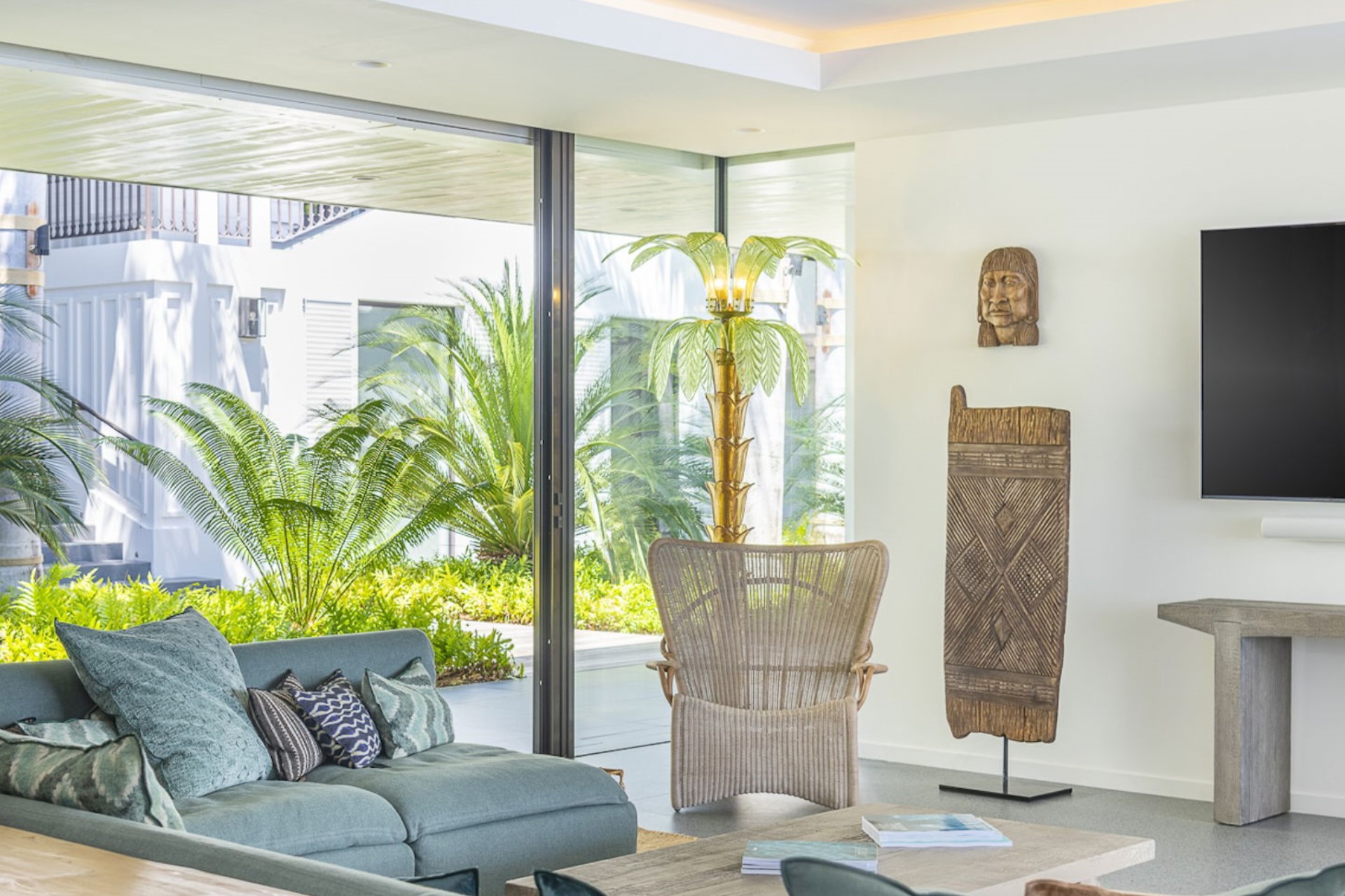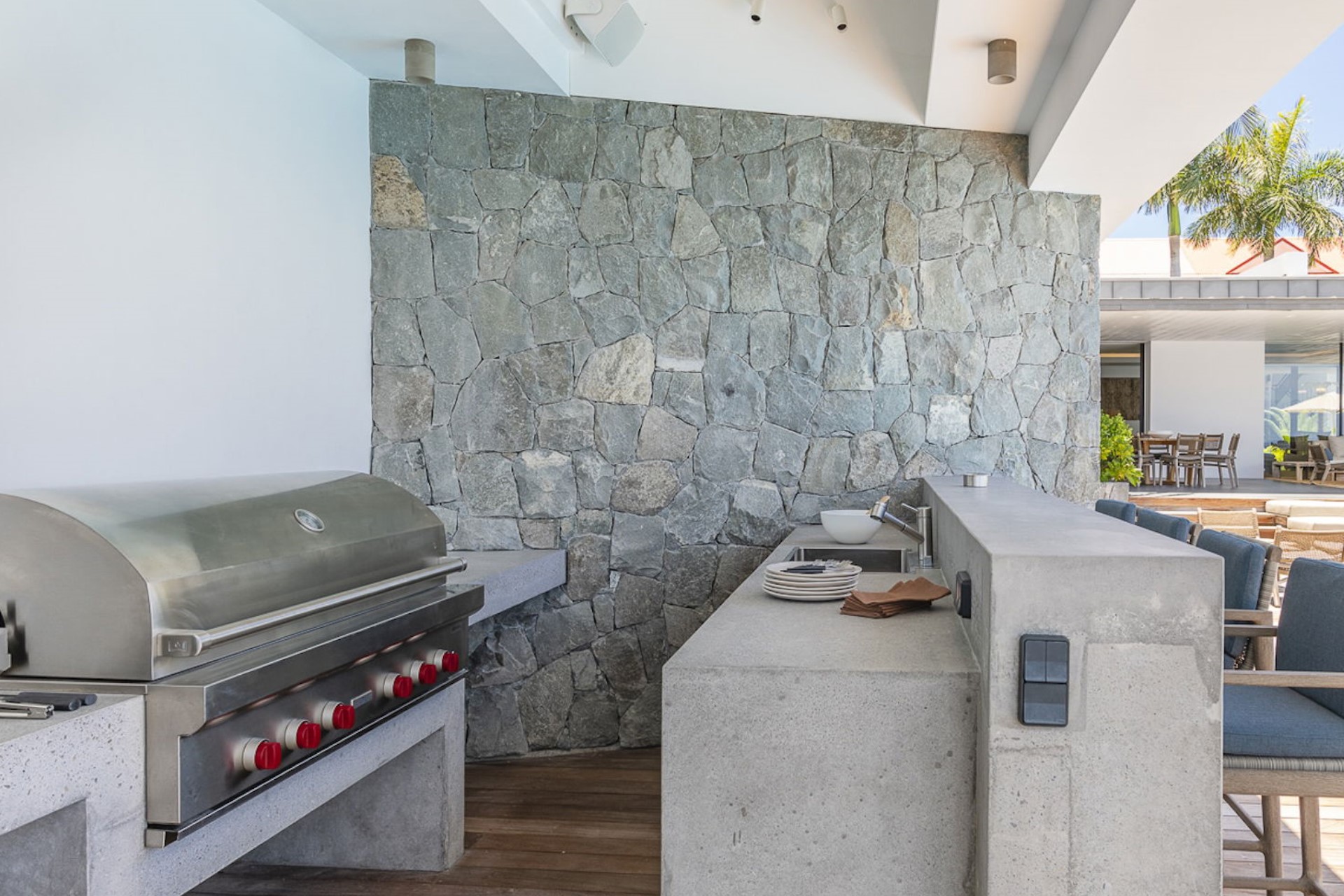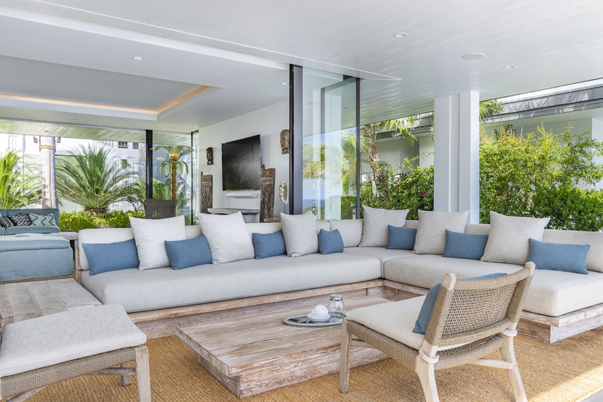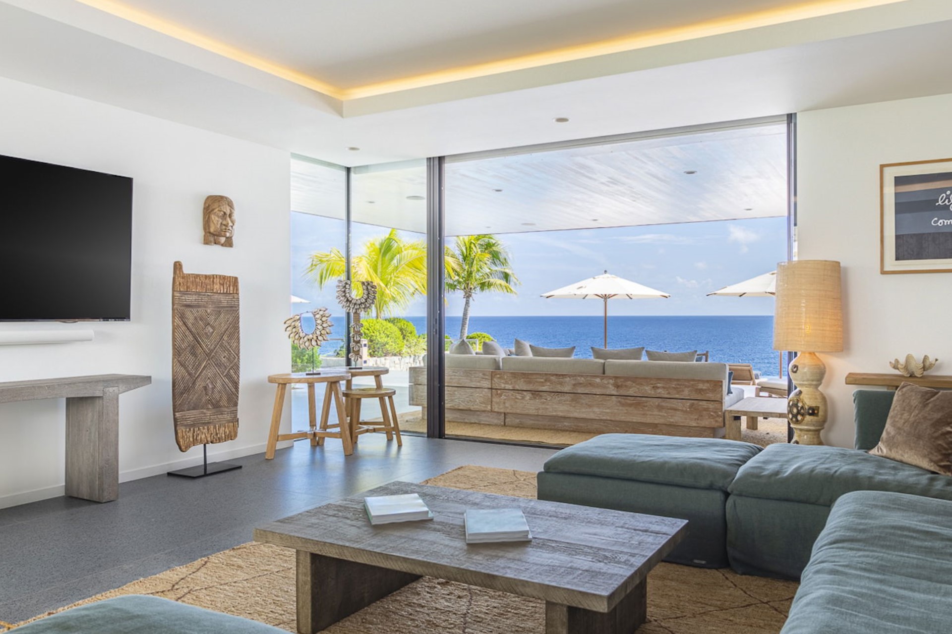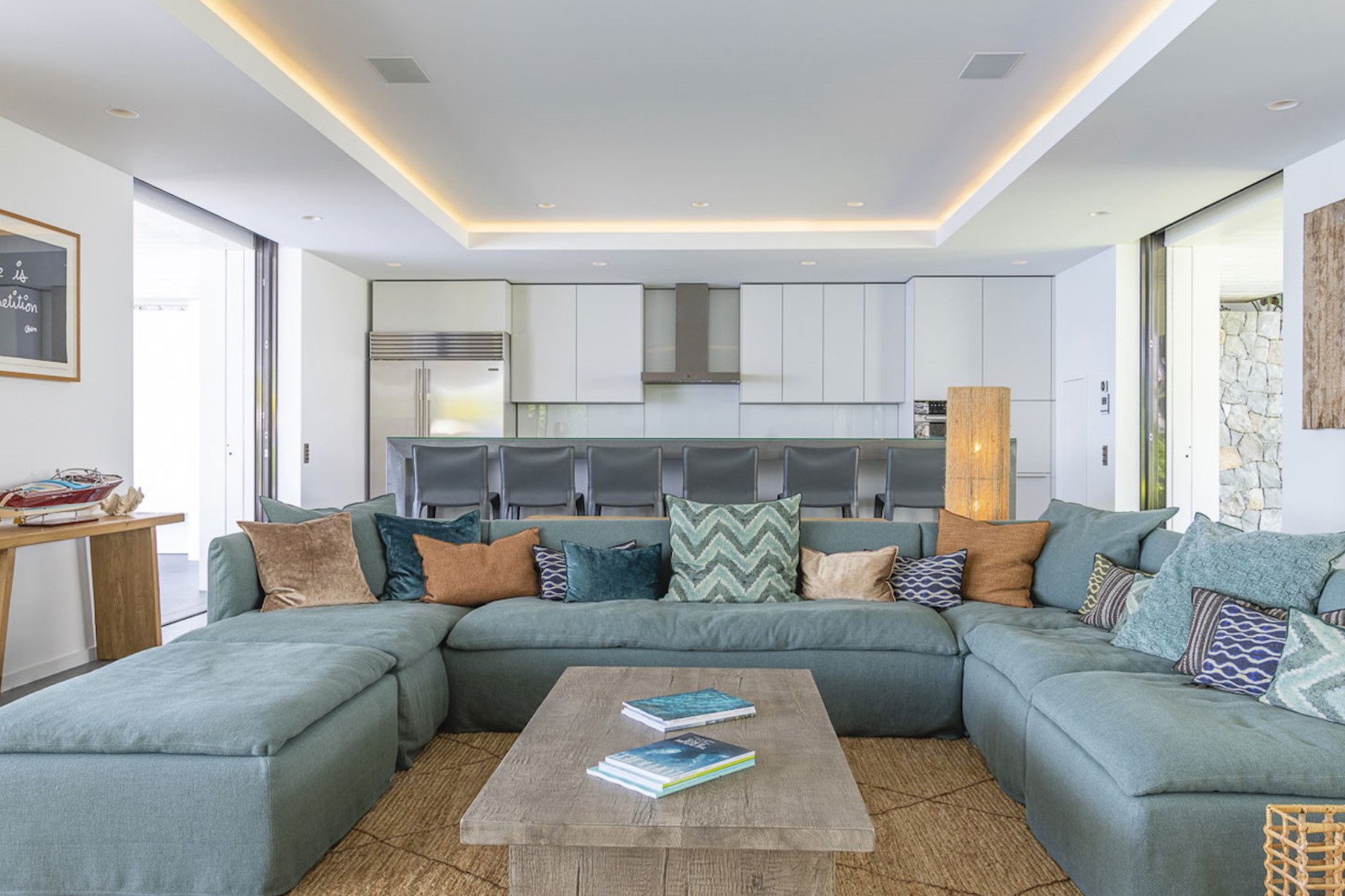 The villa’s interior exudes sophistication, featuring spacious and bright living spaces adorned with high ceilings and expansive bay windows. The air-conditioned living room opens onto the covered terrace, furnished with comfortable seating, providing an ideal spot to relax while enjoying the panoramic ocean vistas. Adjacent to the living area is a fully equipped kitchen, perfect for preparing gourmet meals, alongside a secondary professional kitchen designed for larger gatherings.