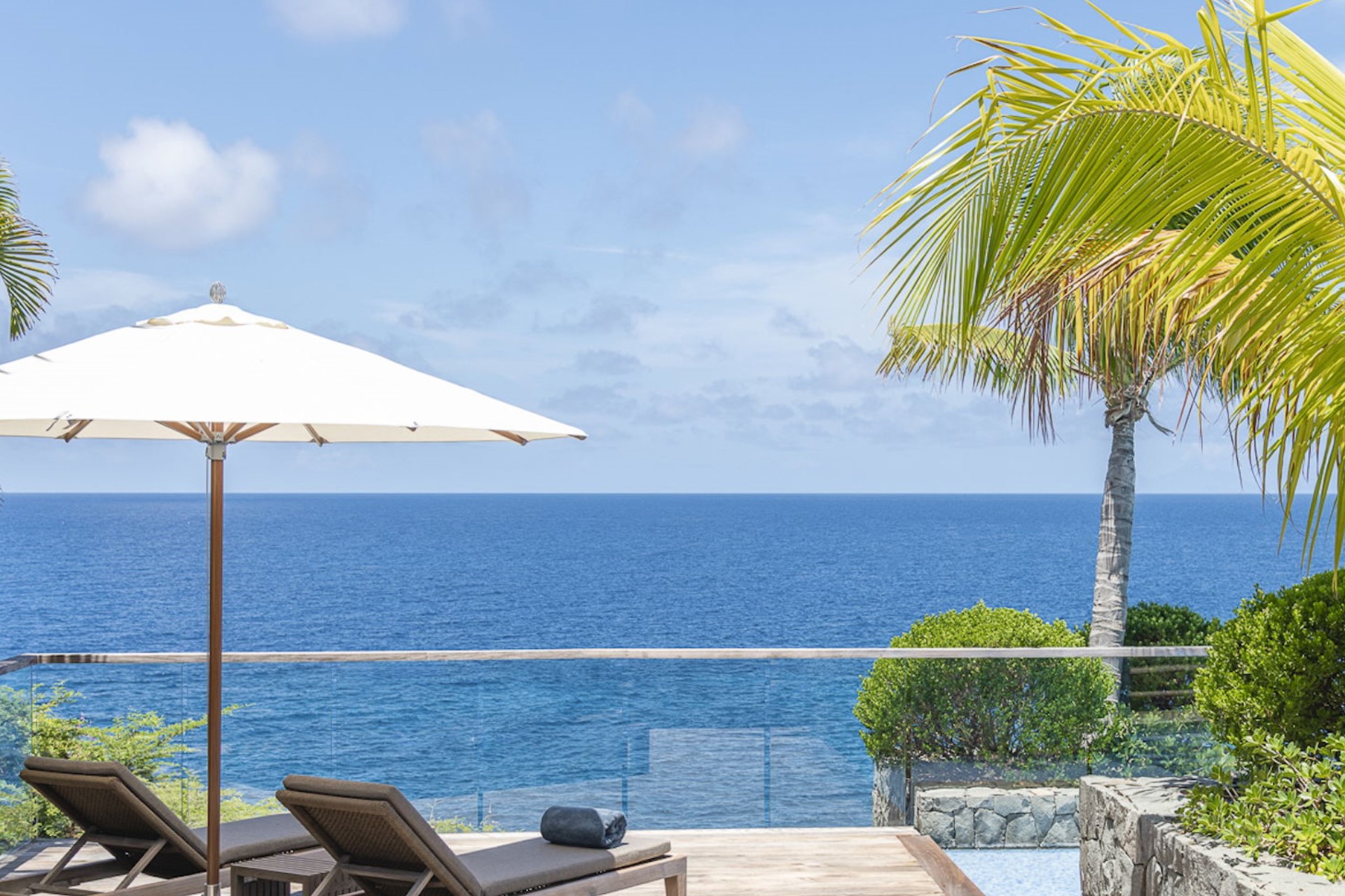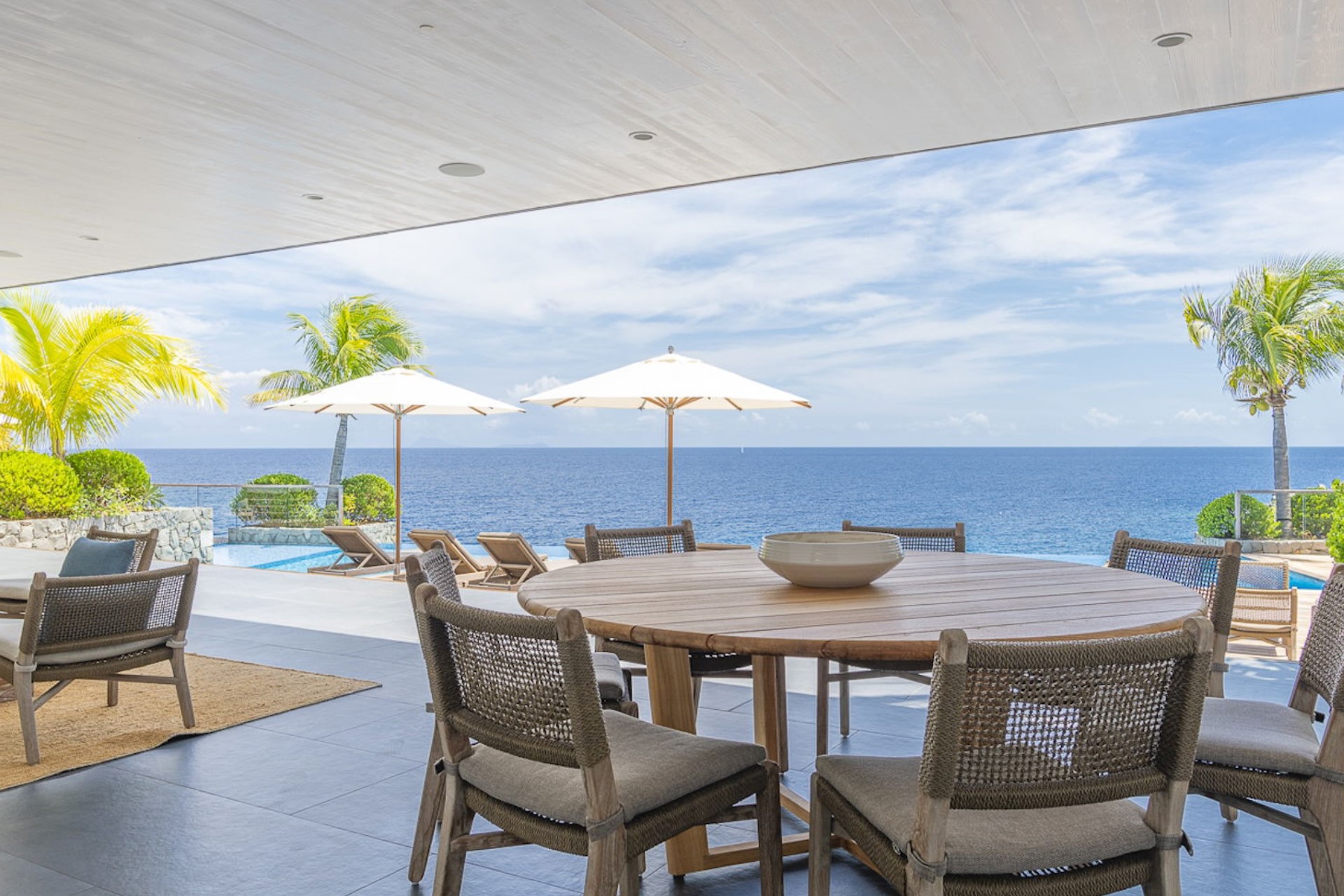The outdoor area is designed for relaxation and enjoyment, boasting a heated infinity swimming pool surrounded by a wooden deck furnished with sun loungers and parasols. This serene environment is perfect for soaking up the Caribbean sun. A shaded alfresco dining area under the covered terrace offers a delightful setting for meals with a view, while the lush tropical garden enhances the villa’s tranquil ambience. Guests can also enjoy shaded lounge areas and landscaped pathways that add to the villa’s serene appeal.