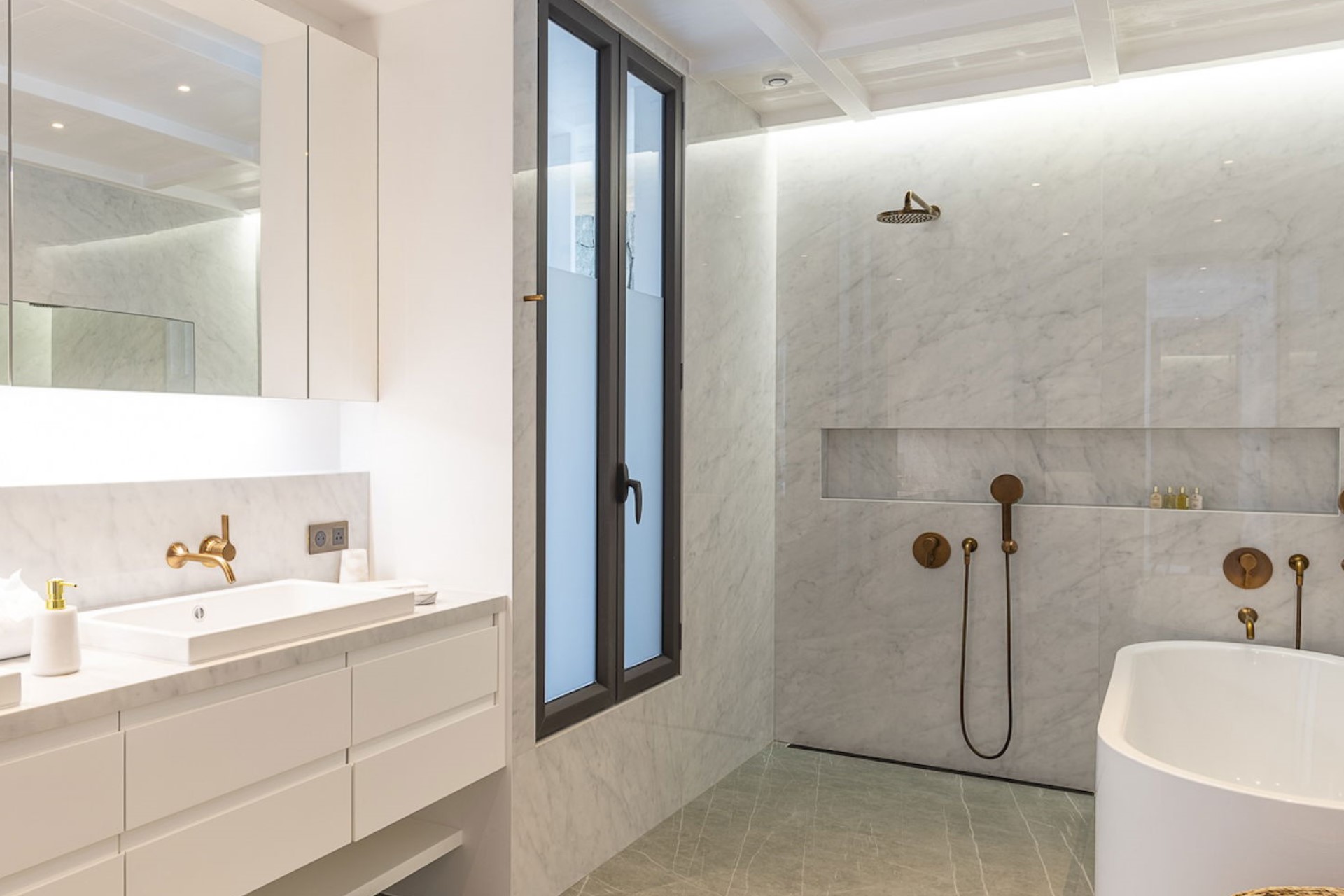 Bedroom 1 – king-size bed, en-suite bathroom with dual vanity, shower and bathtub + outdoor shower, private terrace with ocean views