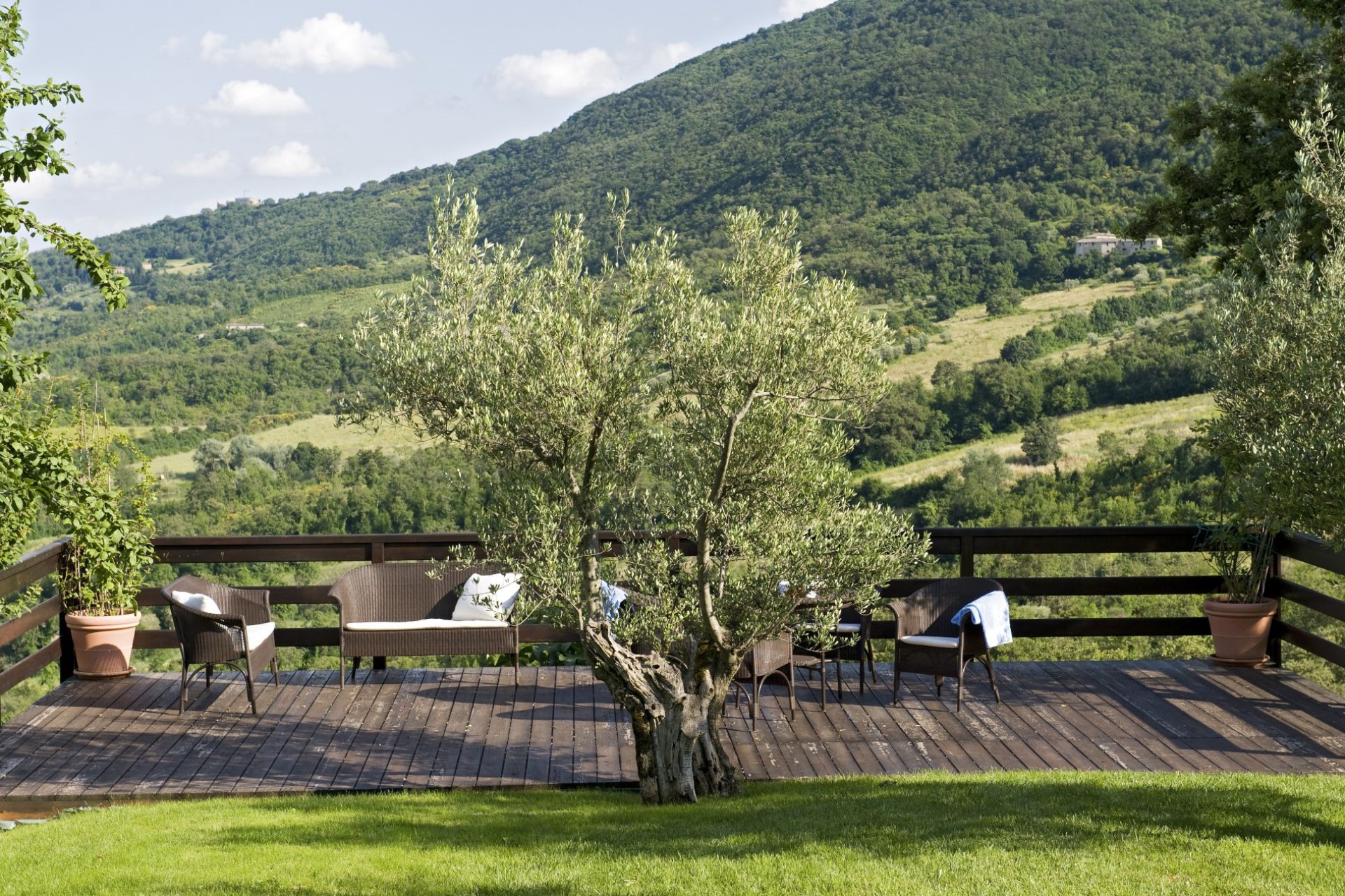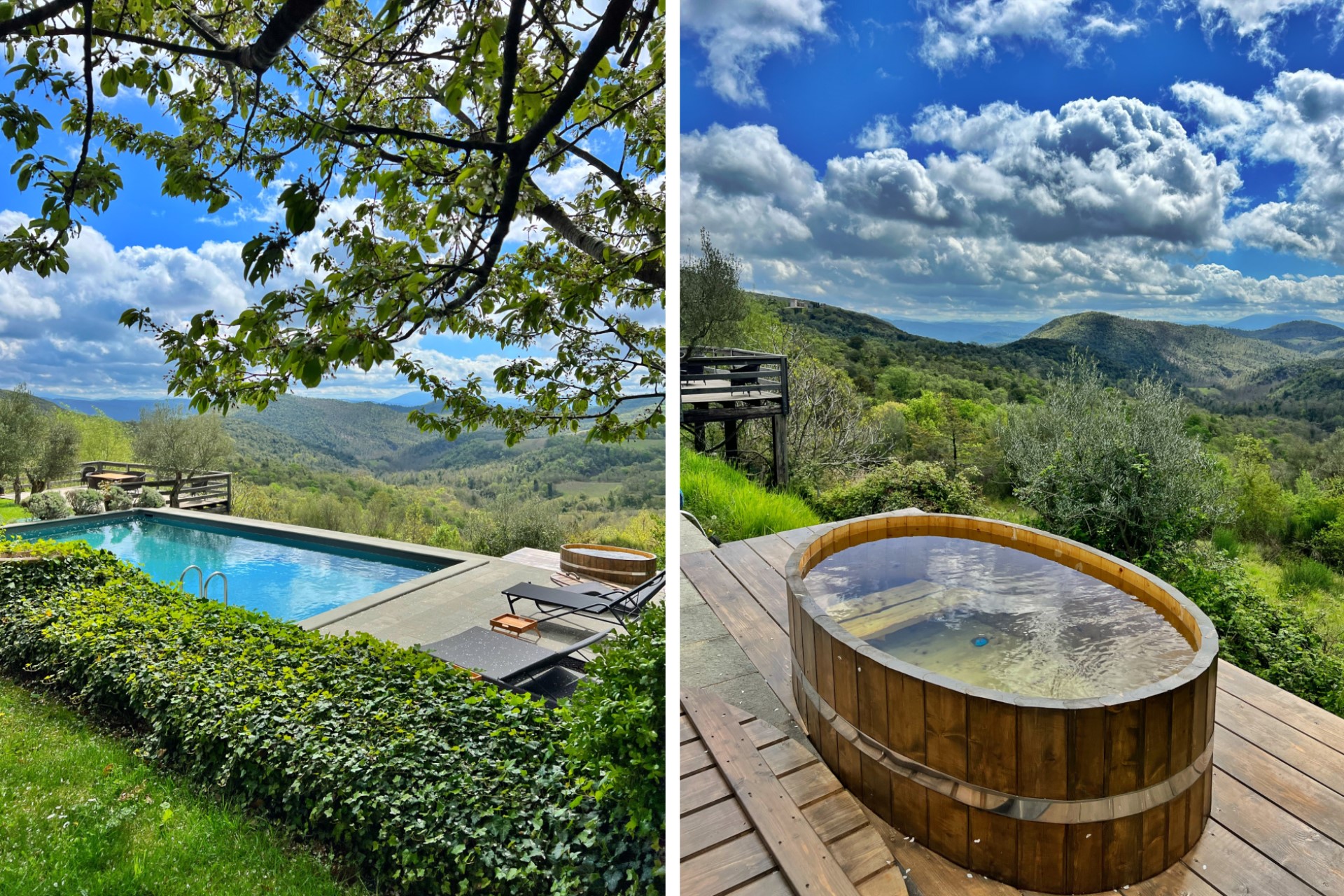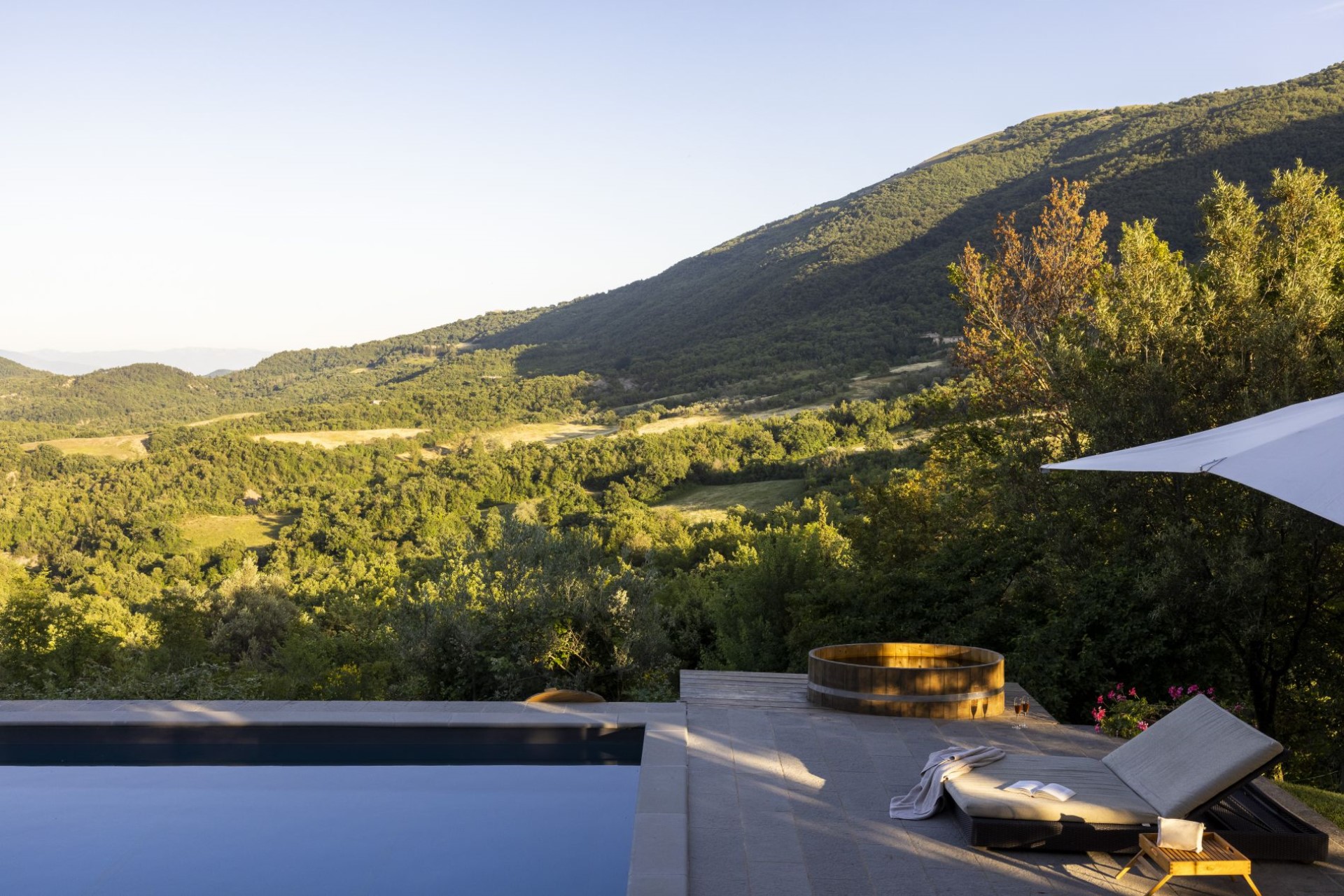 The villa’s exterior is covered in colourful ivy, helping it to blend in with its natural surroundings. A large, heated swimming pool overlooks the rolling hills of Umbria, and is surrounded by sun loungers ideal for catching the rays. There is a spacious garden with various al fresco living and dining areas to relax in including furnished terraces and verdant lawns. A wooden terrace jutting out over the valley below is the perfect place to watch the sun set whilst sipping a glass of local wine.