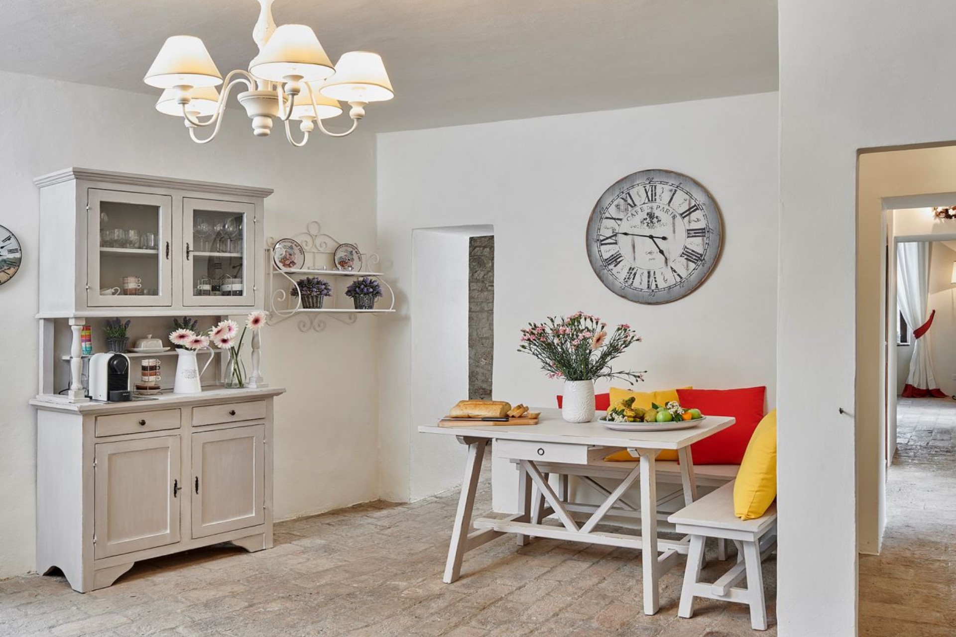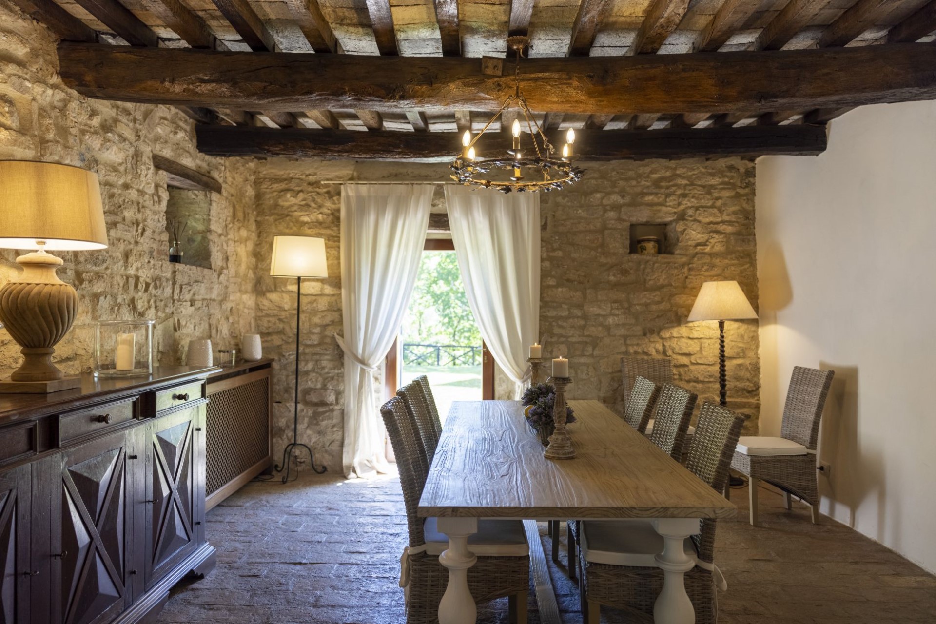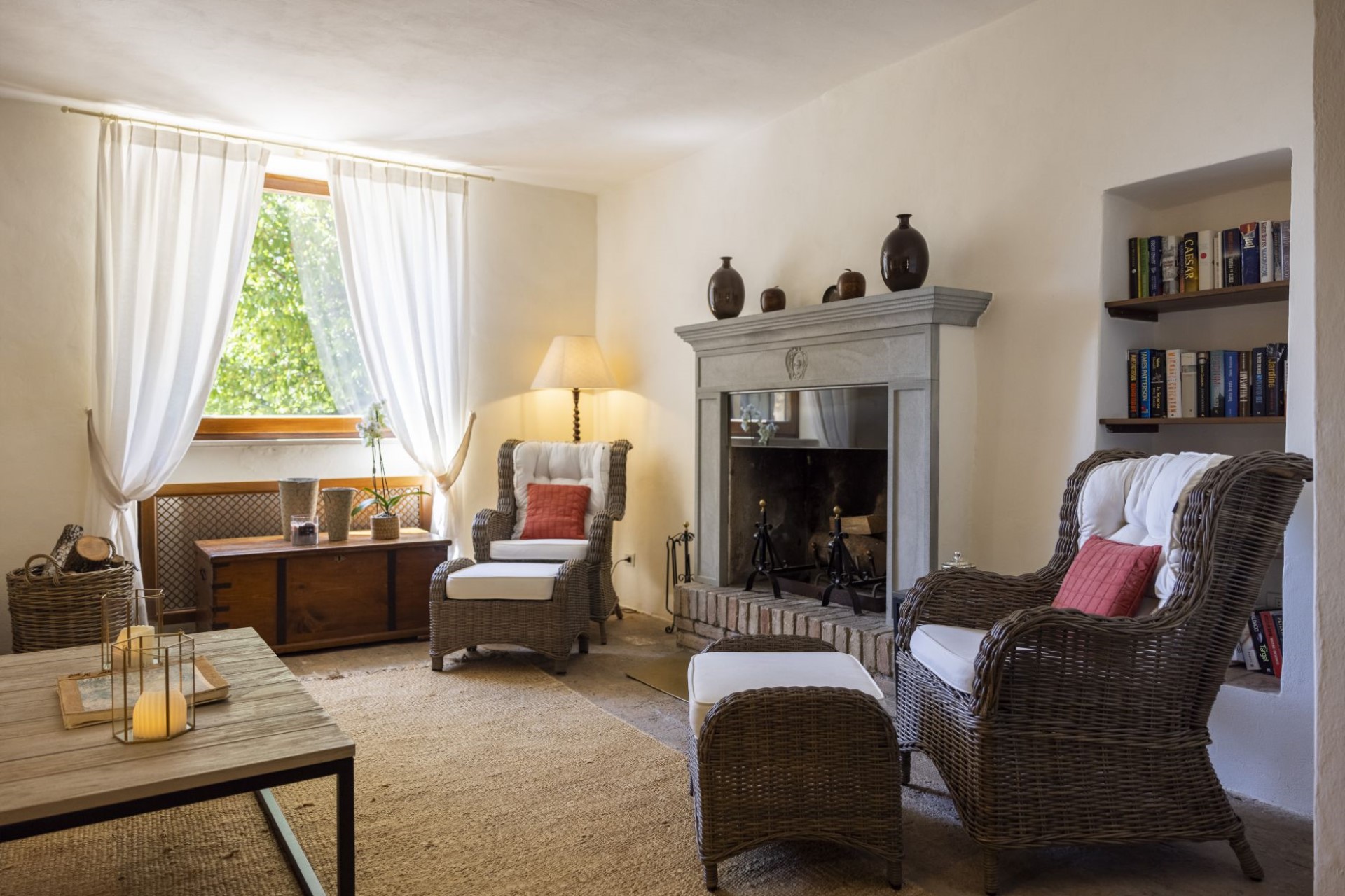 Indoors, the villa is stylishly decorated and exudes an inviting atmosphere where guests can completely relax and slow down. The main living and dining room is a former chapel, which adds to its atmosphere. There is also a second cosy living space with sofas and a fireplace, perfect for catching up with a holiday read or relaxing of an evening.