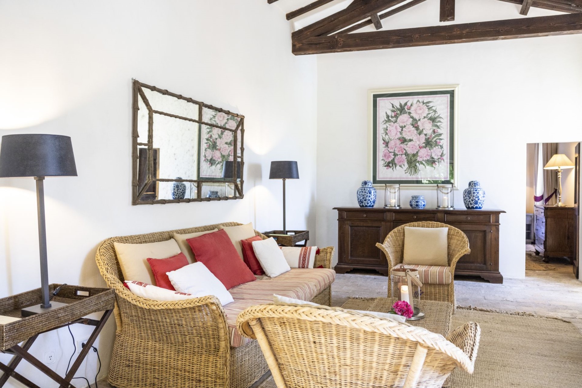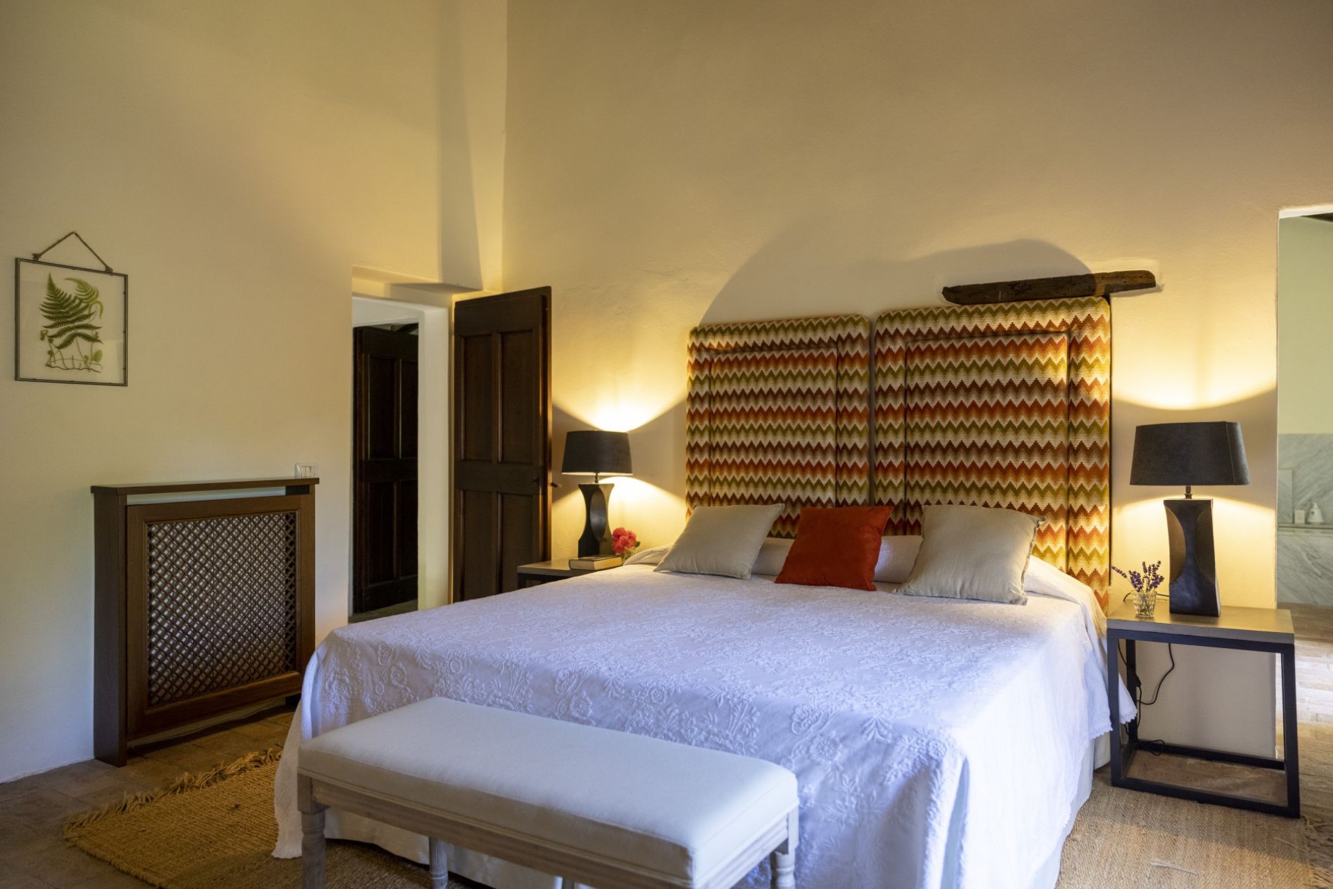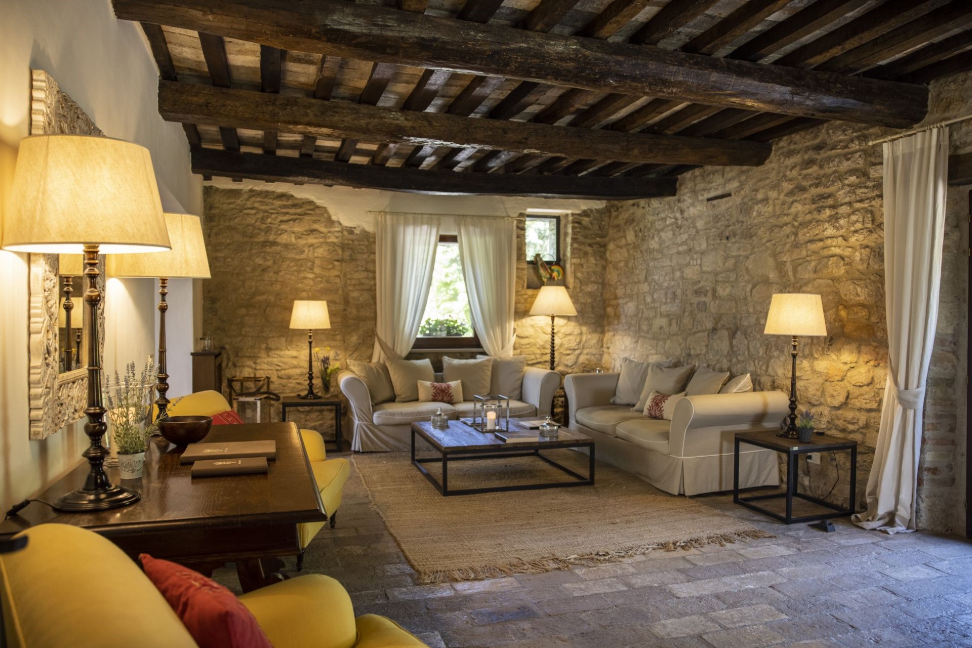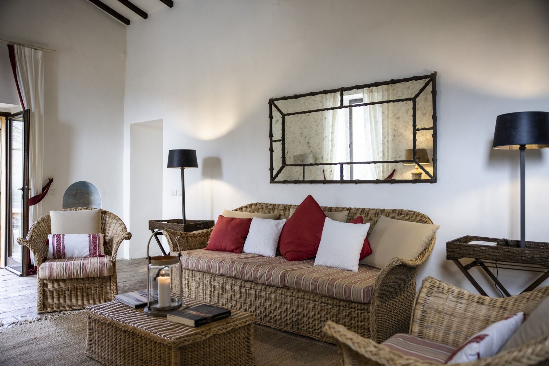 Indoors, the villa is stylishly decorated and exudes an inviting atmosphere where guests can completely relax and slow down. The main living and dining room is a former chapel, which adds to its atmosphere. There is also a second cosy living space with sofas and a fireplace, perfect for catching up with a holiday read or relaxing of an evening.