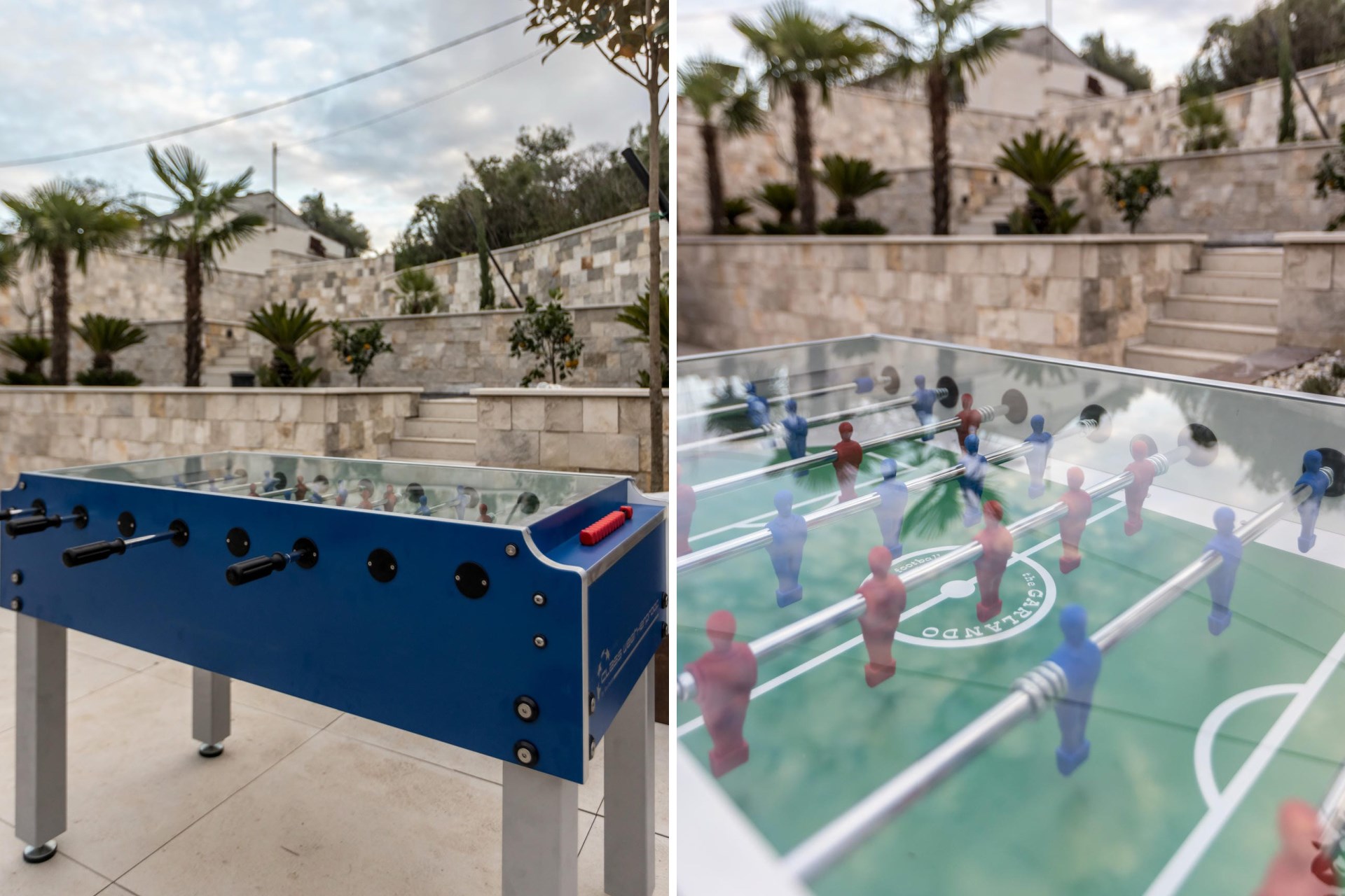 At the rear of the villa, a large courtyard is dedicated to relaxation and entertainment, with Mediterranean landscaping providing a tranquil setting. Guests can enjoy al fresco living at its finest with a fully equipped outdoor kitchen, a barbecue station, and a shaded dining area ideal for sunset meals. The courtyard also offers table tennis and table football sets, perfect for family fun.