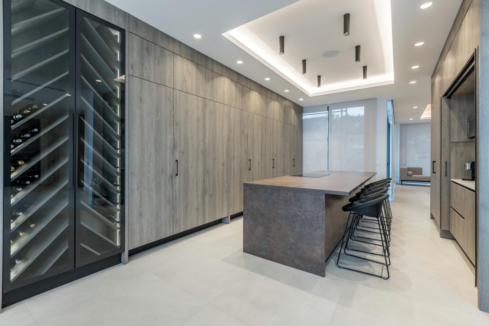 The ground floor features the main living space with an elegant lounge area and dining area, plus a cosy TV corner, all boasting sea views. A sleek kitchen is fully equipped with modern appliances, a wine fridge, and a central island, offering the perfect space to craft delicious meals.