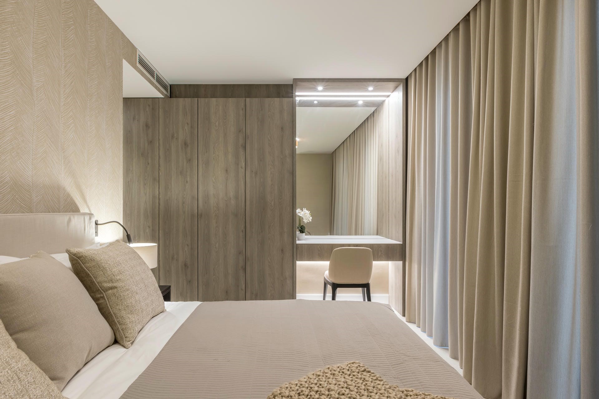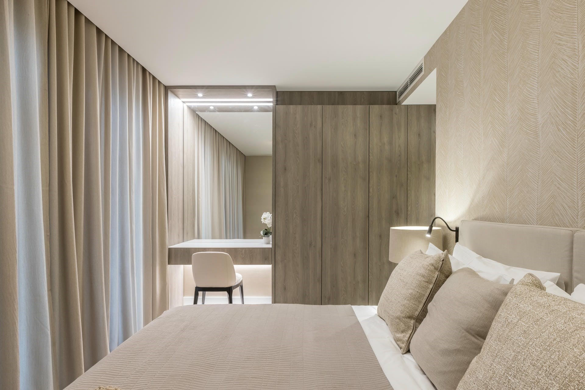 Master Bedroom 1 – king-size bed, dressing room, minifridge, en-suite bathroom with dual vanity, bathtub & separate shower, private roof terrace, and sea views