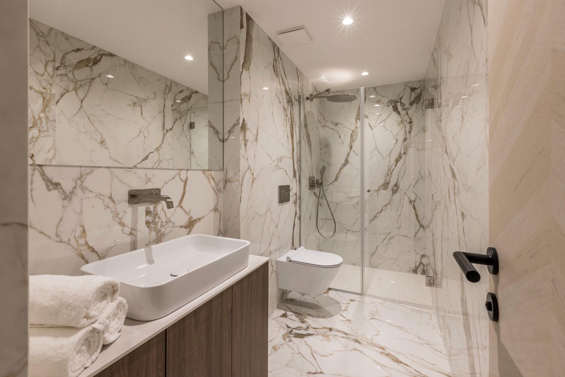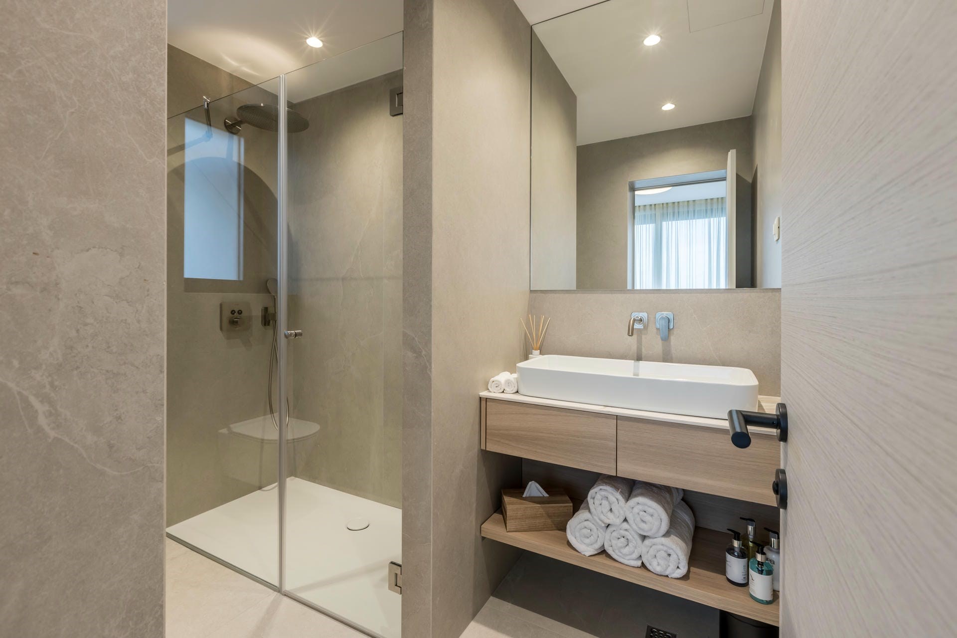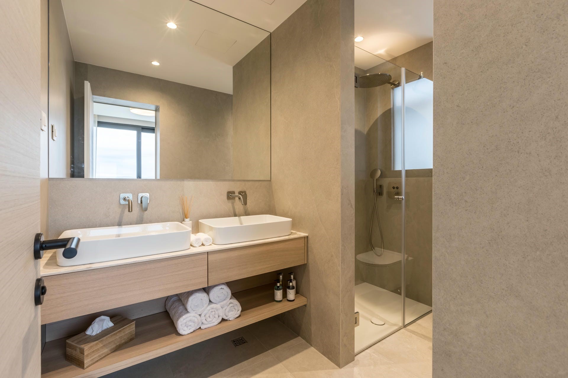 Bedroom 2 – double bed, en-suite bathroom with dual vanity & shower, private balcony, and sea views