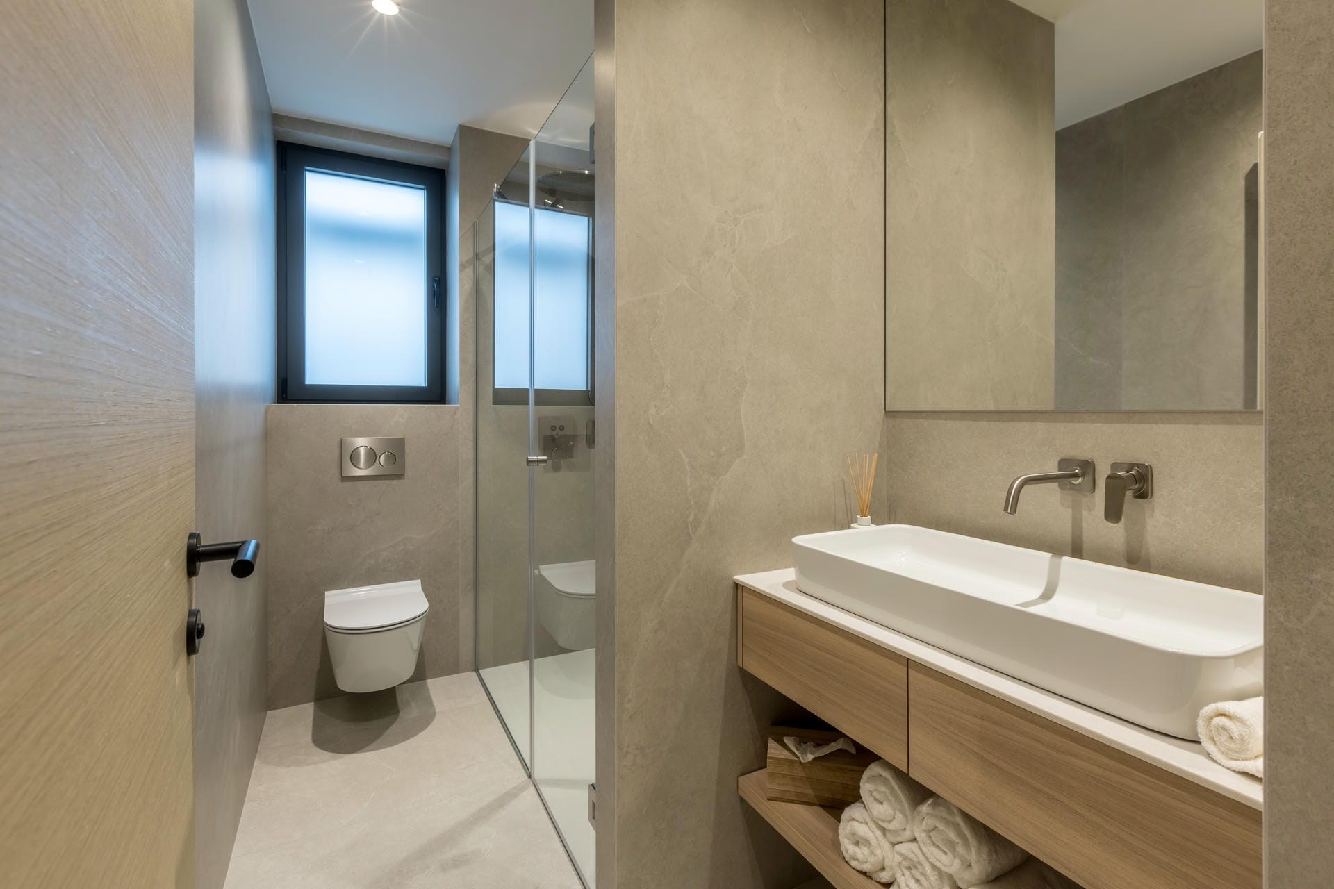 Spanning an impressive 580 square metres of interior space, the villa’s design maximises the connection between indoors and out. The architecture features clean lines, expansive glass facades, and an open-plan layout that floods the living spaces with natural light. The interior features a neutral colour palette and local stone materials, which create an atmosphere of relaxed elegance. High ceilings and floor-to-ceiling sliding doors ensure panoramic sea views from almost every corner.
