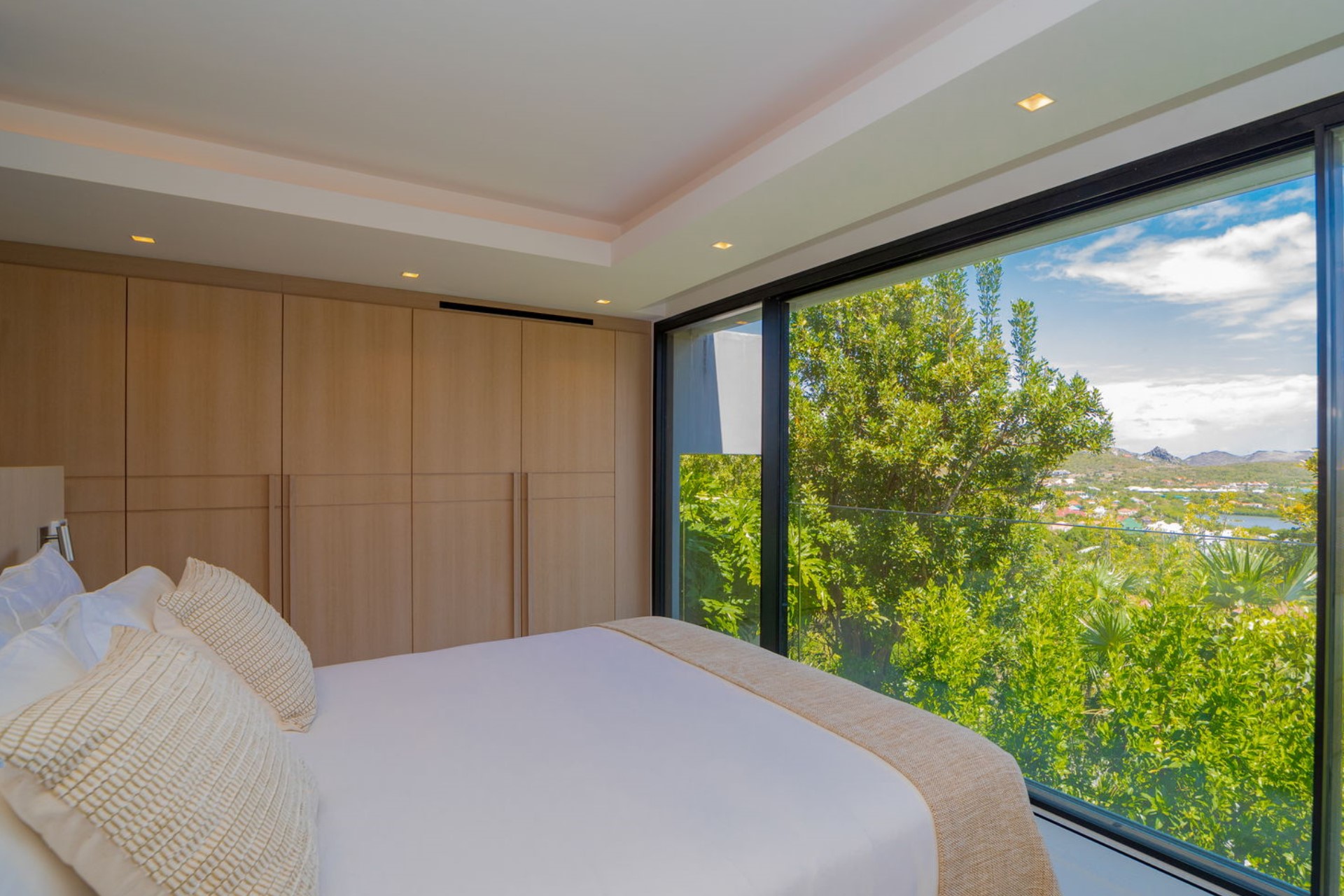 The outdoor area is designed for relaxation and enjoyment, featuring a heated infinity swimming pool with a shallow end and underwater loungers, providing a serene spot to unwind while admiring the stunning views. The expansive sun terrace is furnished with sun loungers and a covered alfresco dining area equipped with a barbecue, perfect for enjoying meals against the backdrop of the azure bay. The surrounding tropical garden enhances the villa’s tranquil ambience, creating a peaceful retreat for guests.