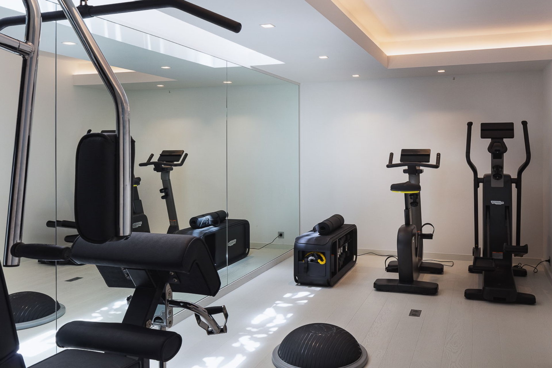 For those who wish to maintain their fitness routine, a well-equipped fitness room is situated on the lower level, offering modern exercise equipment and entertainment options.