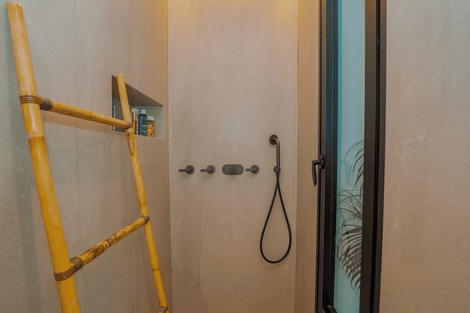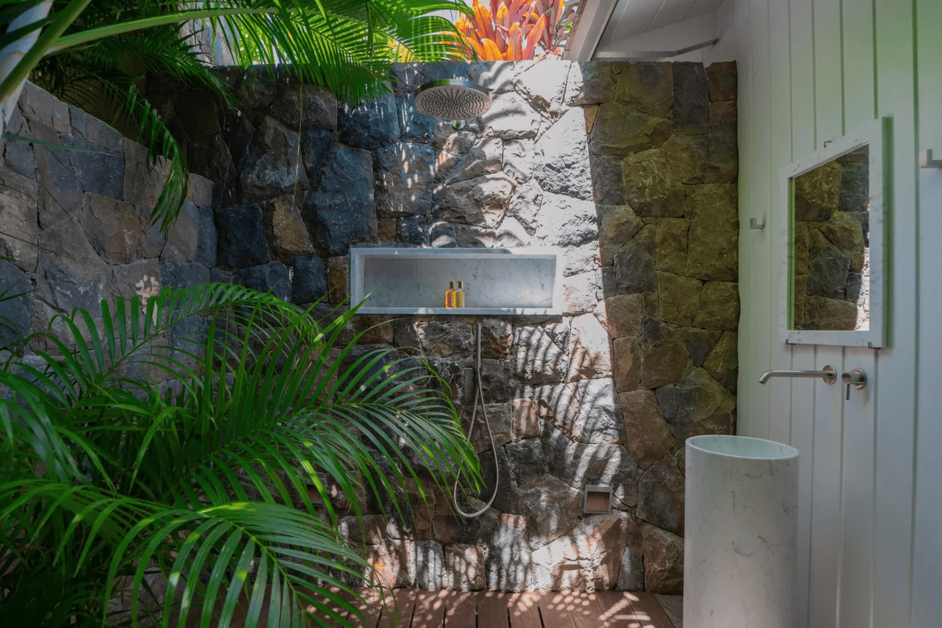 Bedroom 3 – queen-size bed, en-suite bathroom with dual vanity and shower + outdoor shower, terrace access