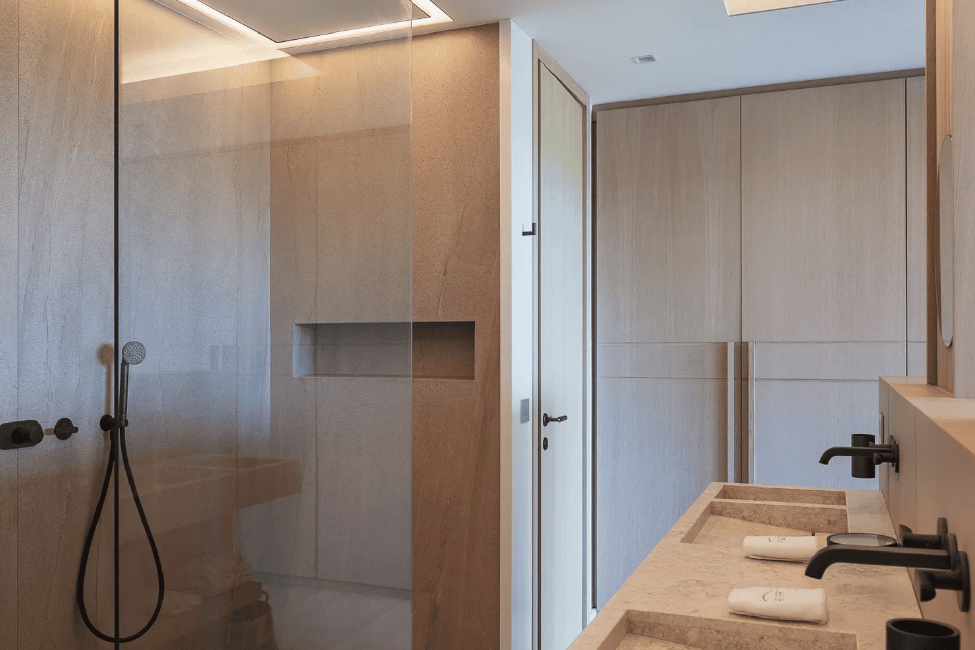 Bedroom 1 – queen-size bed, en-suite bathroom with dual vanity and shower + outdoor shower, pool terrace access