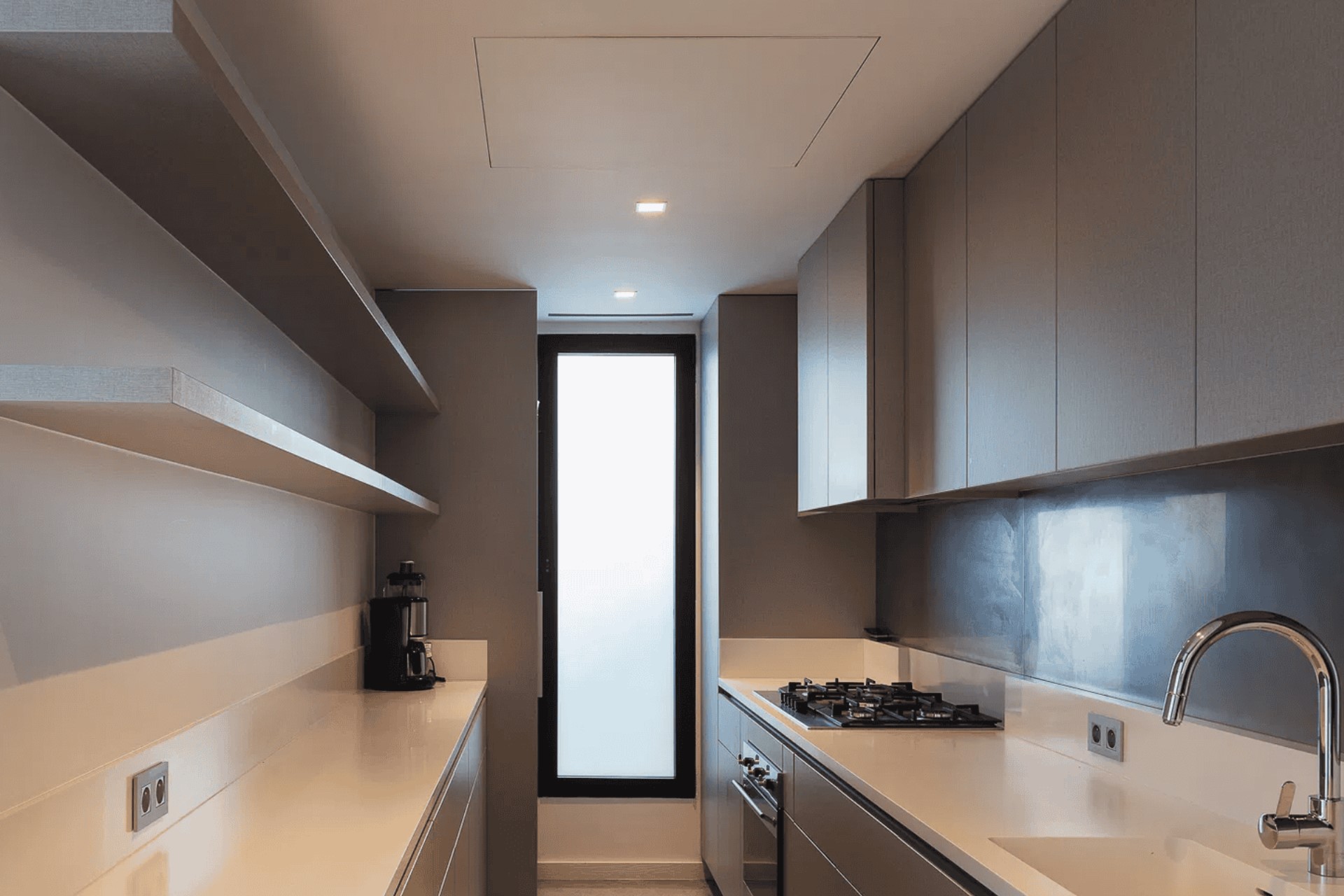 The villa’s interior is both spacious and elegant, featuring high ceilings and large windows that open onto a covered terrace, allowing natural light to flood the living spaces. The stylish living area is furnished with comfortable sofas and a flat-screen TV, providing a cosy setting for relaxation. Adjacent to the living room is a fully equipped kitchen with a breakfast bar and central island, ideal for preparing meals. A second professional kitchen is also available, ensuring a seamless culinary experience for larger gatherings.