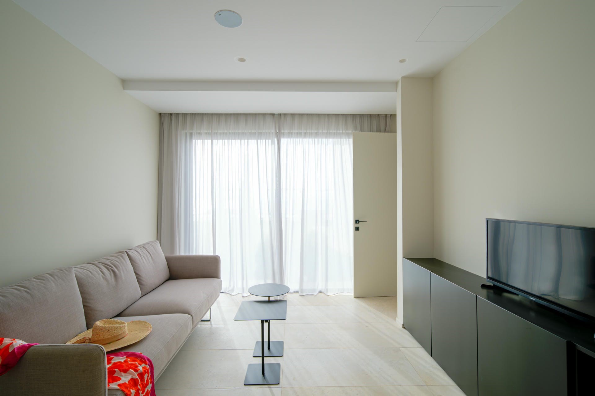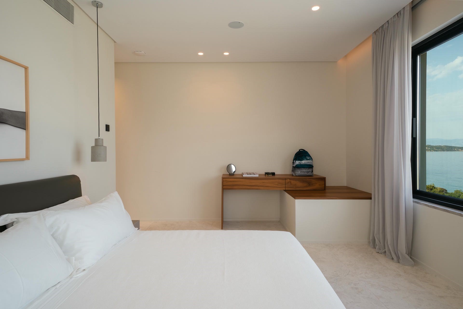 Master Suite – super-king-size bed, private living room, walk-through wardrobe, en-suite bathroom with dual vanity & shower, private terrace, and sea views