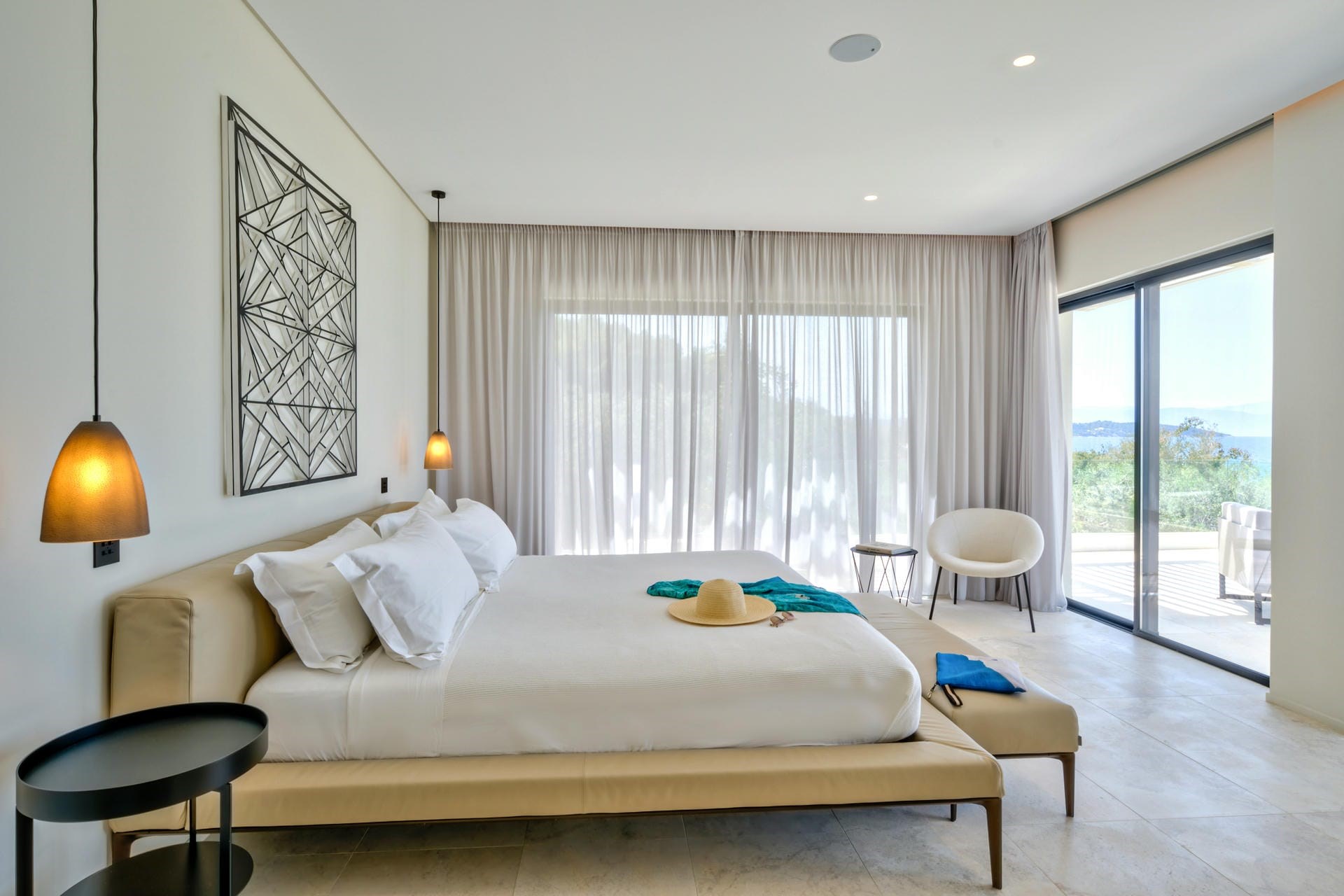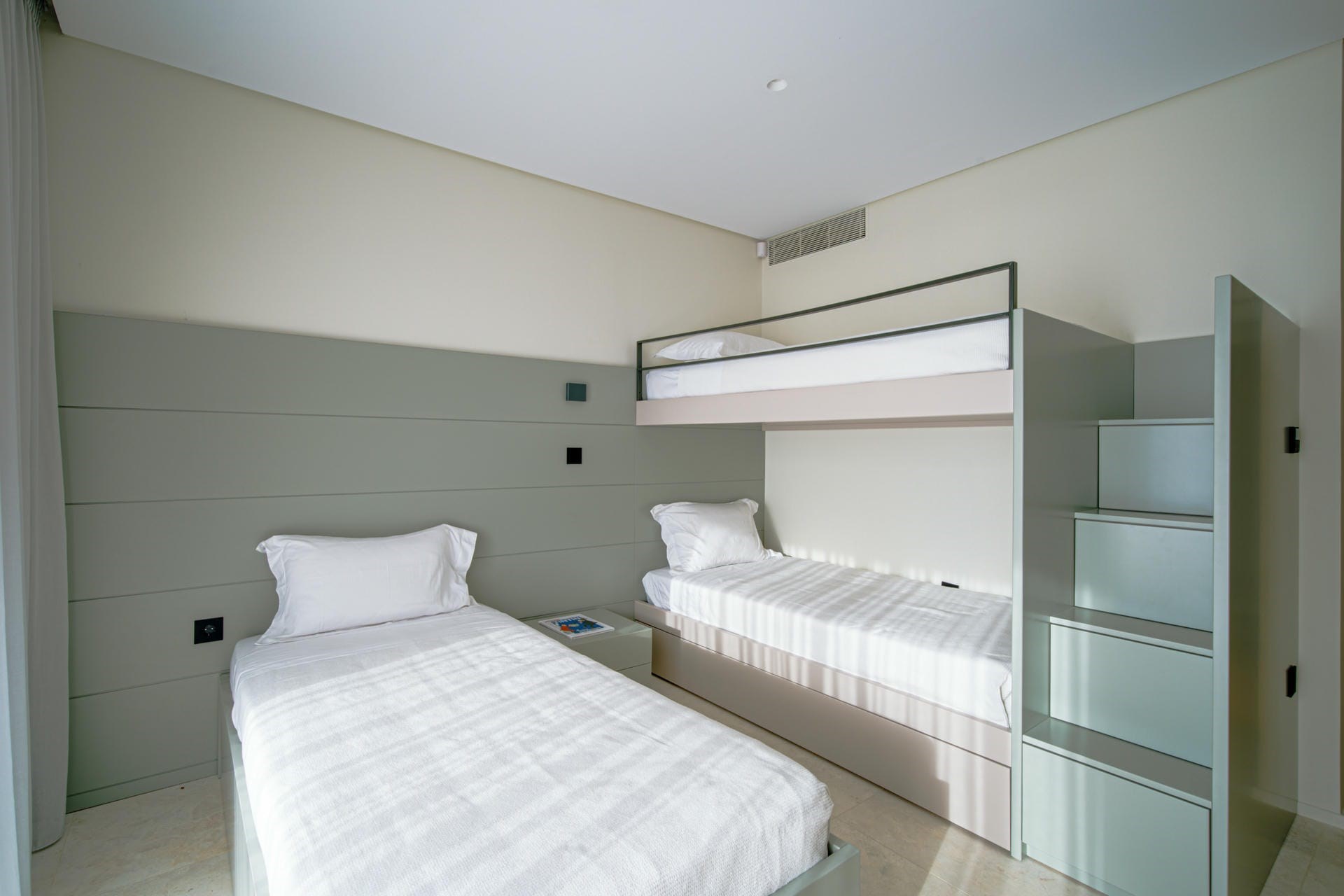 The villa’s six bedrooms are spread across three levels. Two master suites feature private terraces and walk-in wardrobes—one located on the pool level and another on the ground floor—while additional rooms offer king-size, twin, or bunk bed layouts, with several boasting sea views and direct access to the outdoors. An extra single room is available on request for those travelling with personal staff.