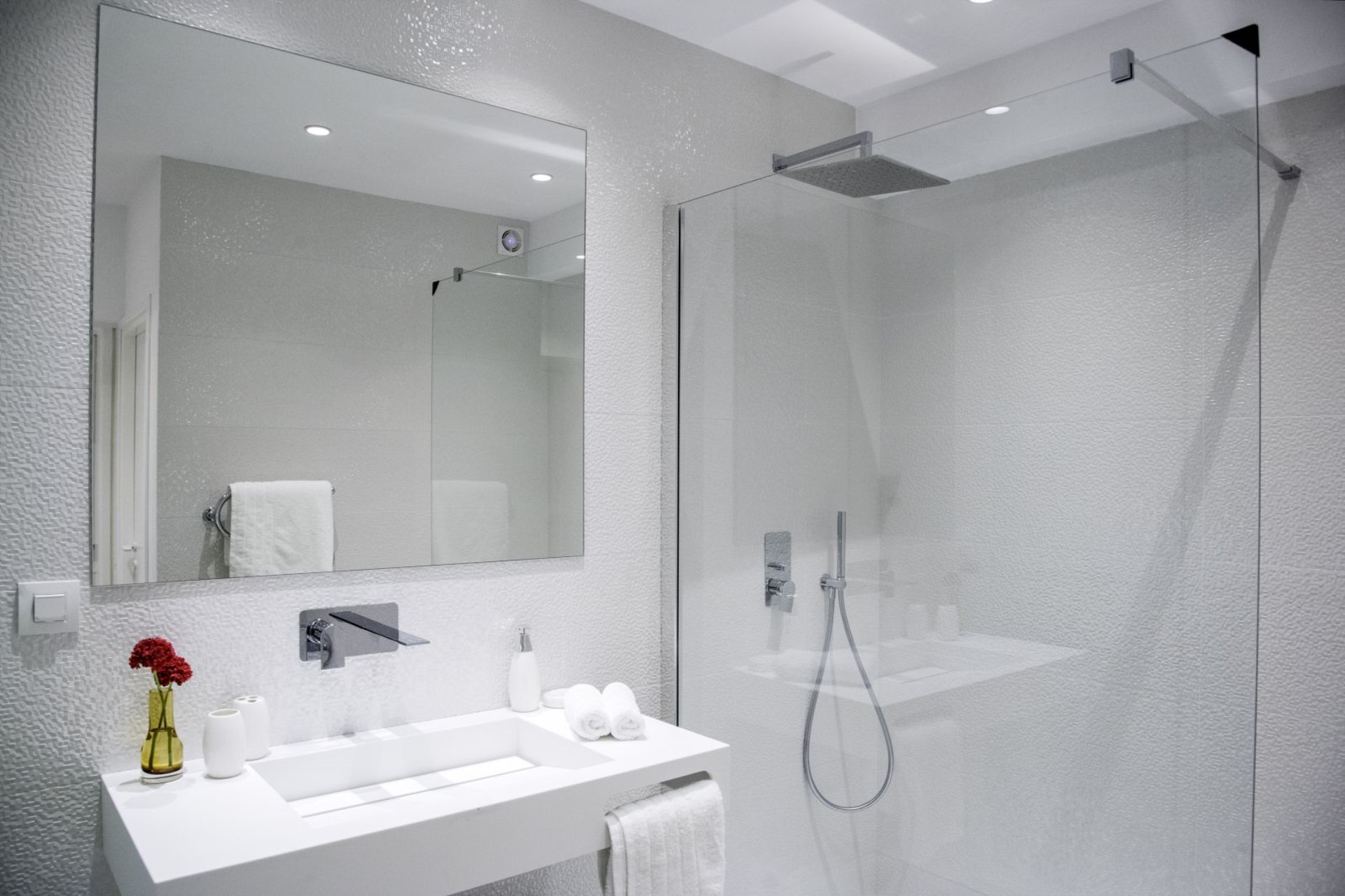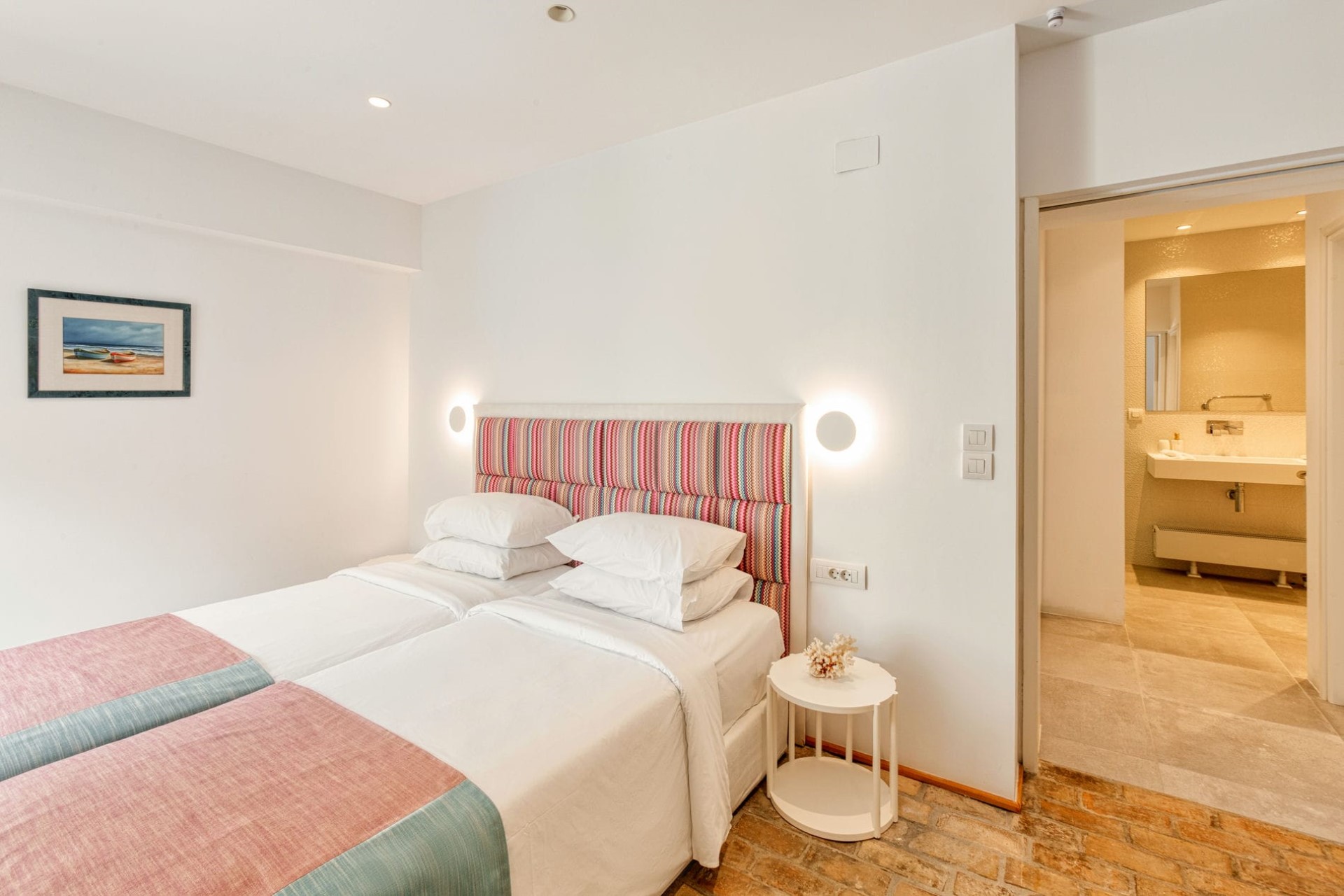 Bedroom 2 – twin beds (converted to king-size on request), private bathroom with walk-in rain shower, and sea views (interconnects with Bedroom 3)