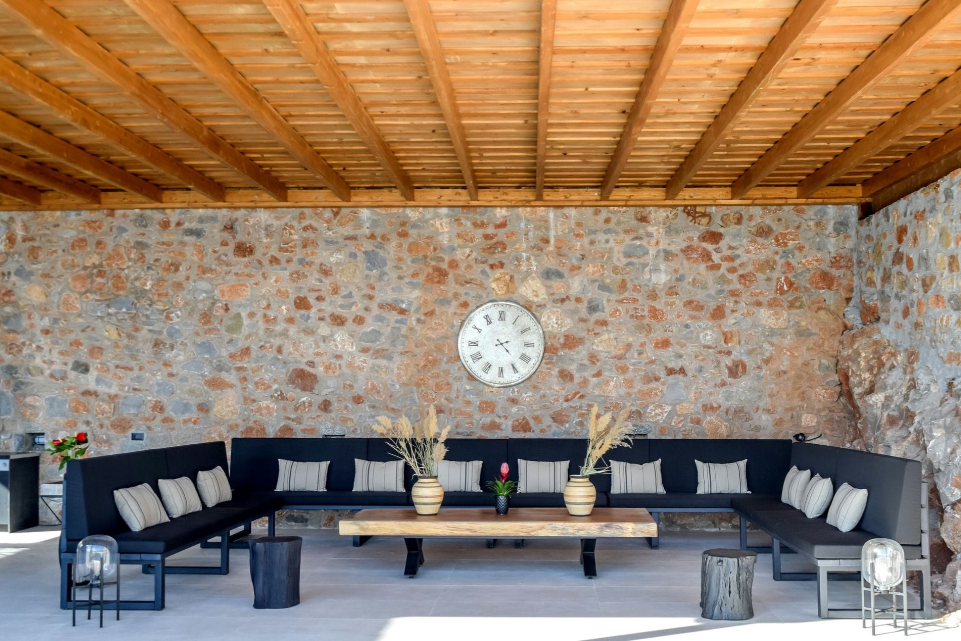 The villa itself is the perfect spot for a relaxing, sunny escape. The sun terrace offers ample space for every guest to enjoy the island sunshine by the pool, and behind the sun loungers, a generous outdoor lounge, dining and kitchen space is perfect for al fresco dining with loved ones or taking some time under the shade of the pergola in the heat of the day.