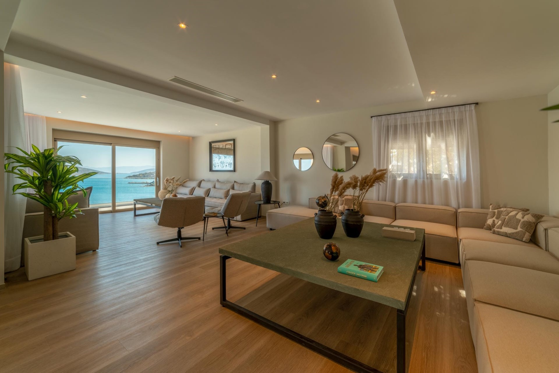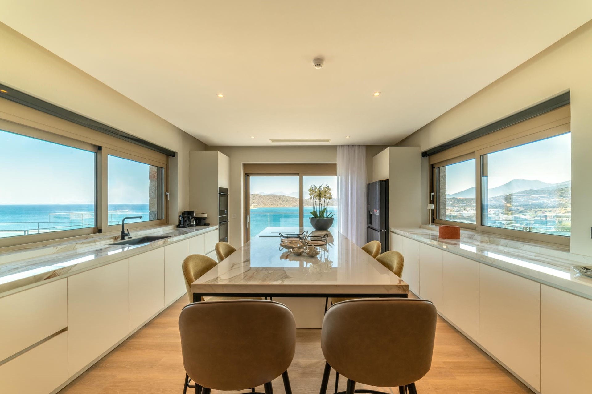 A clean and chic modern design gives the villa a light, bright feeling while letting the blue sea and sky be the main attraction through floor-to-ceiling glass doors and panoramic windows.