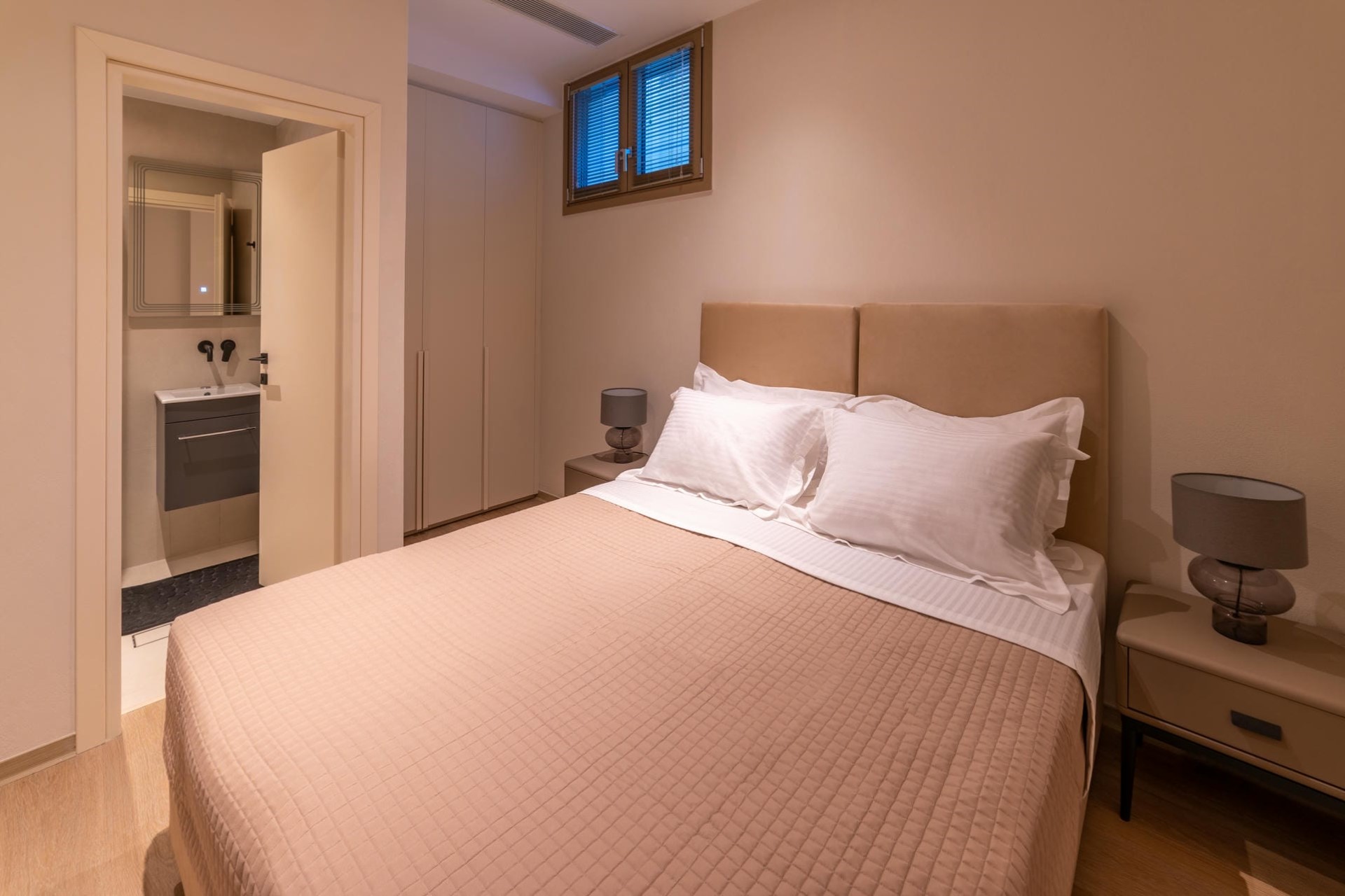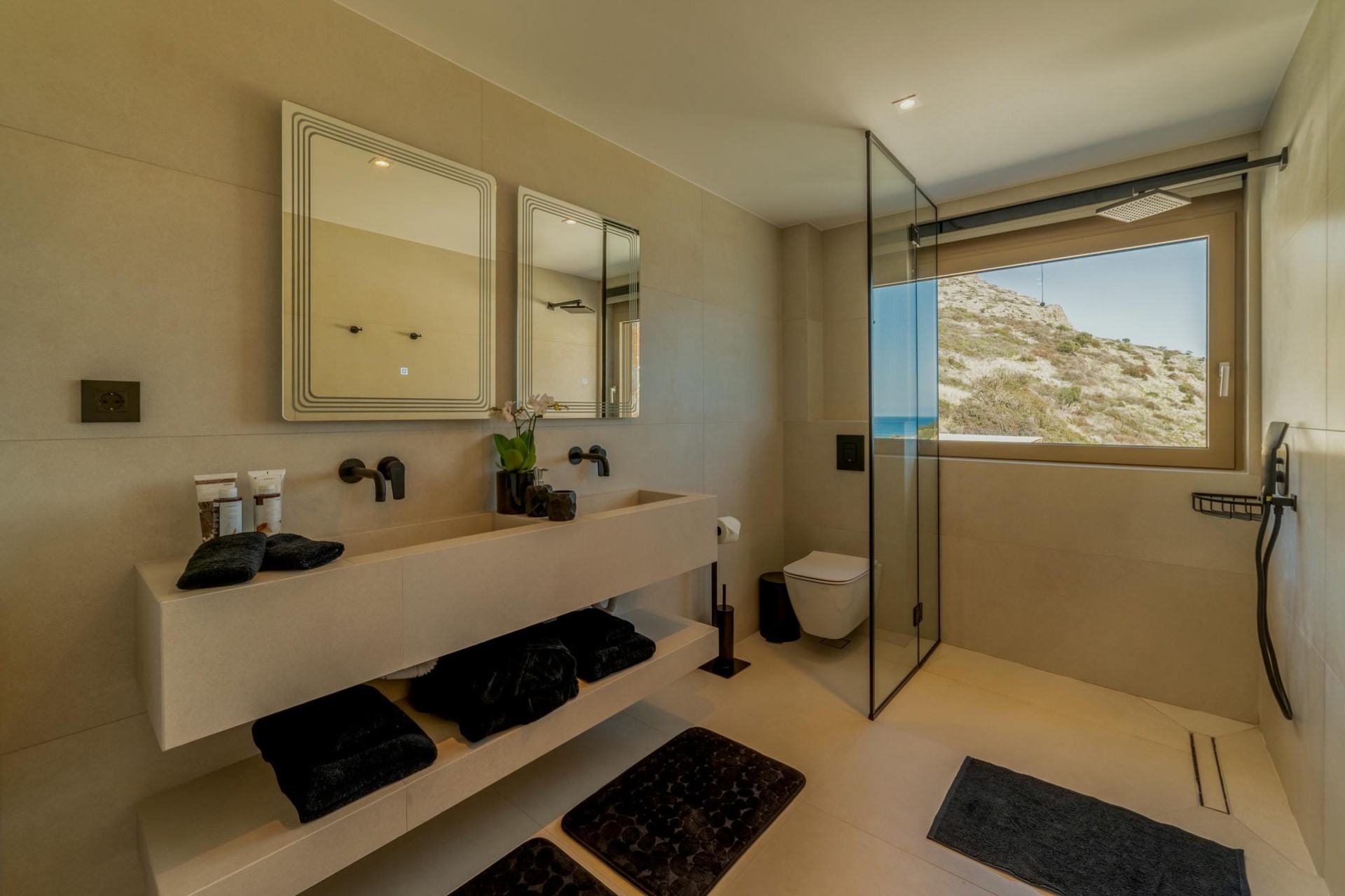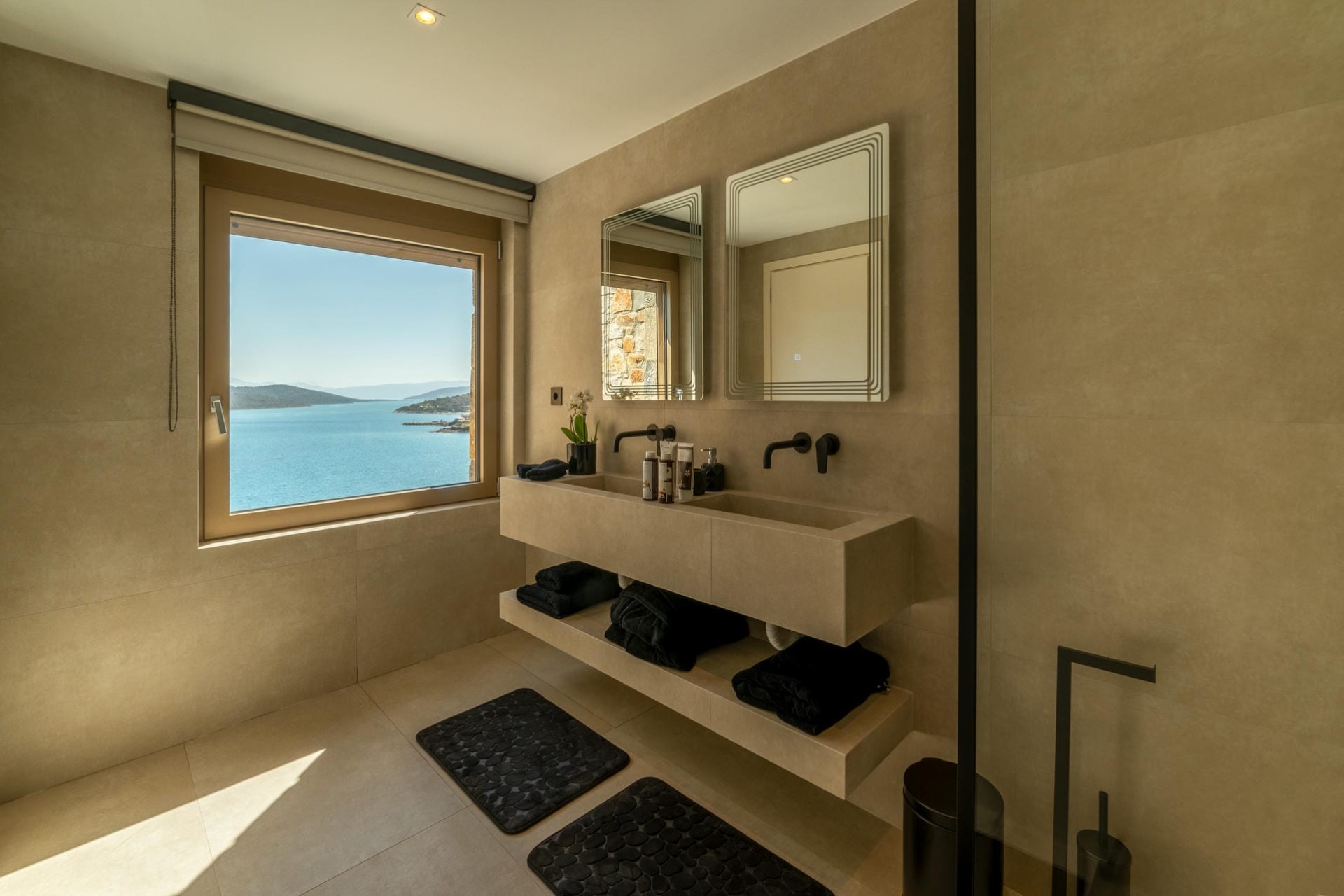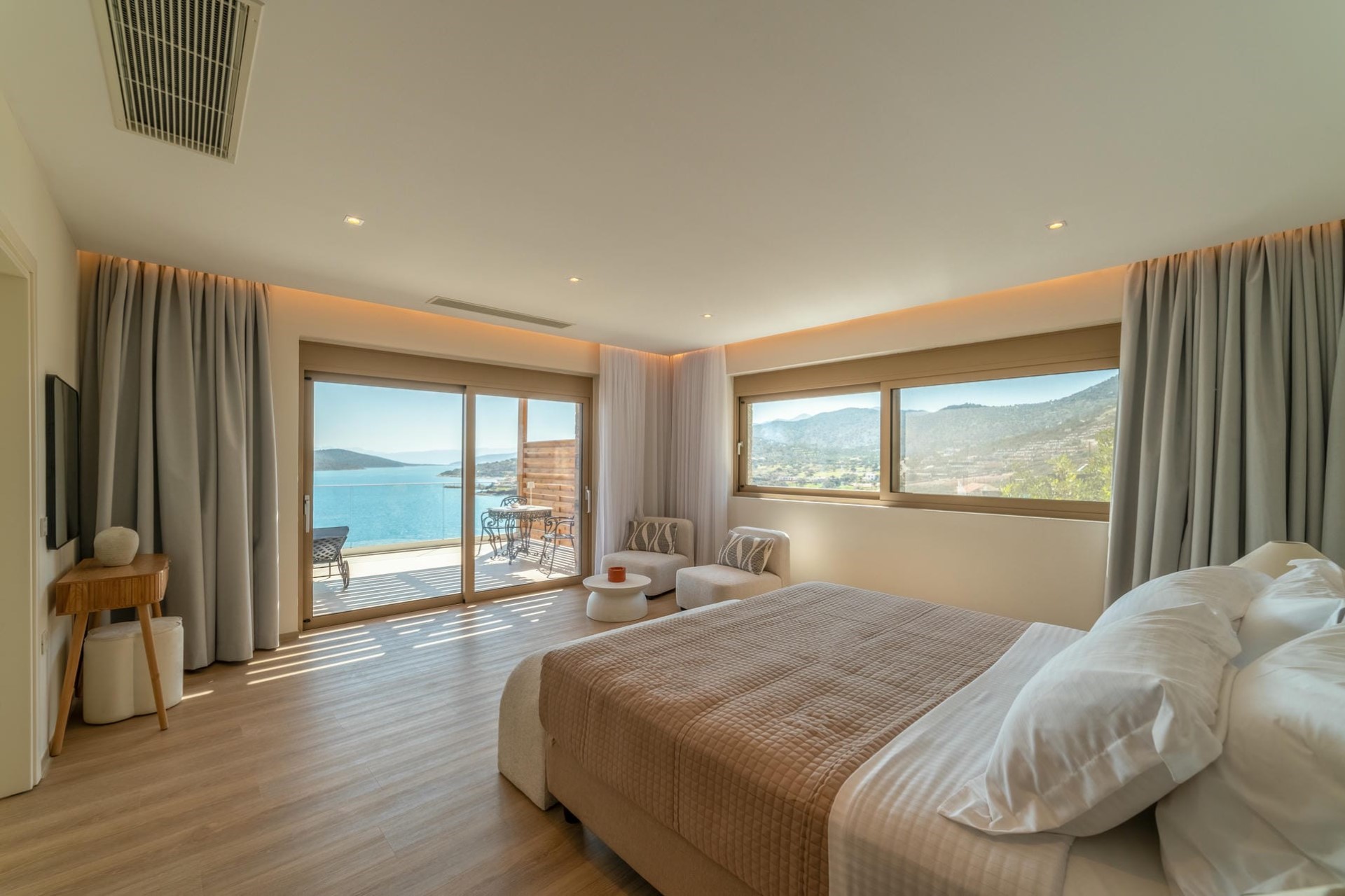 Bedroom 1 – king-size bed, en-suite bathroom with dual vanity & shower, private terrace, and sea views