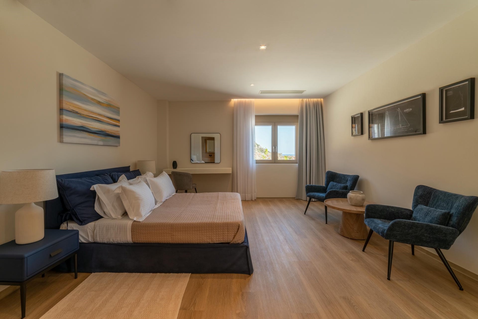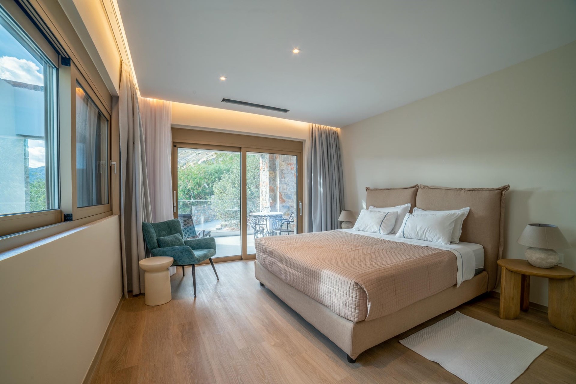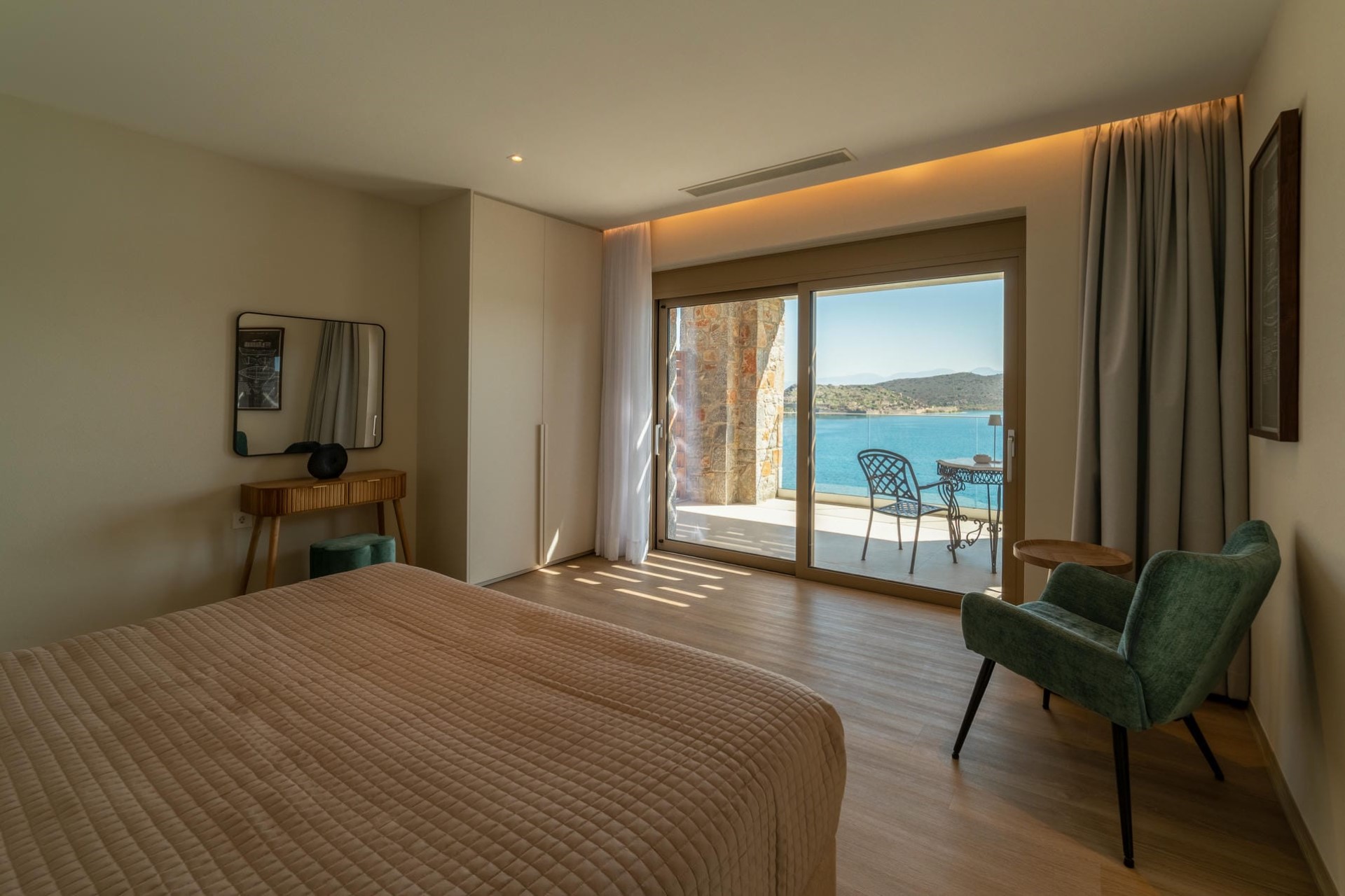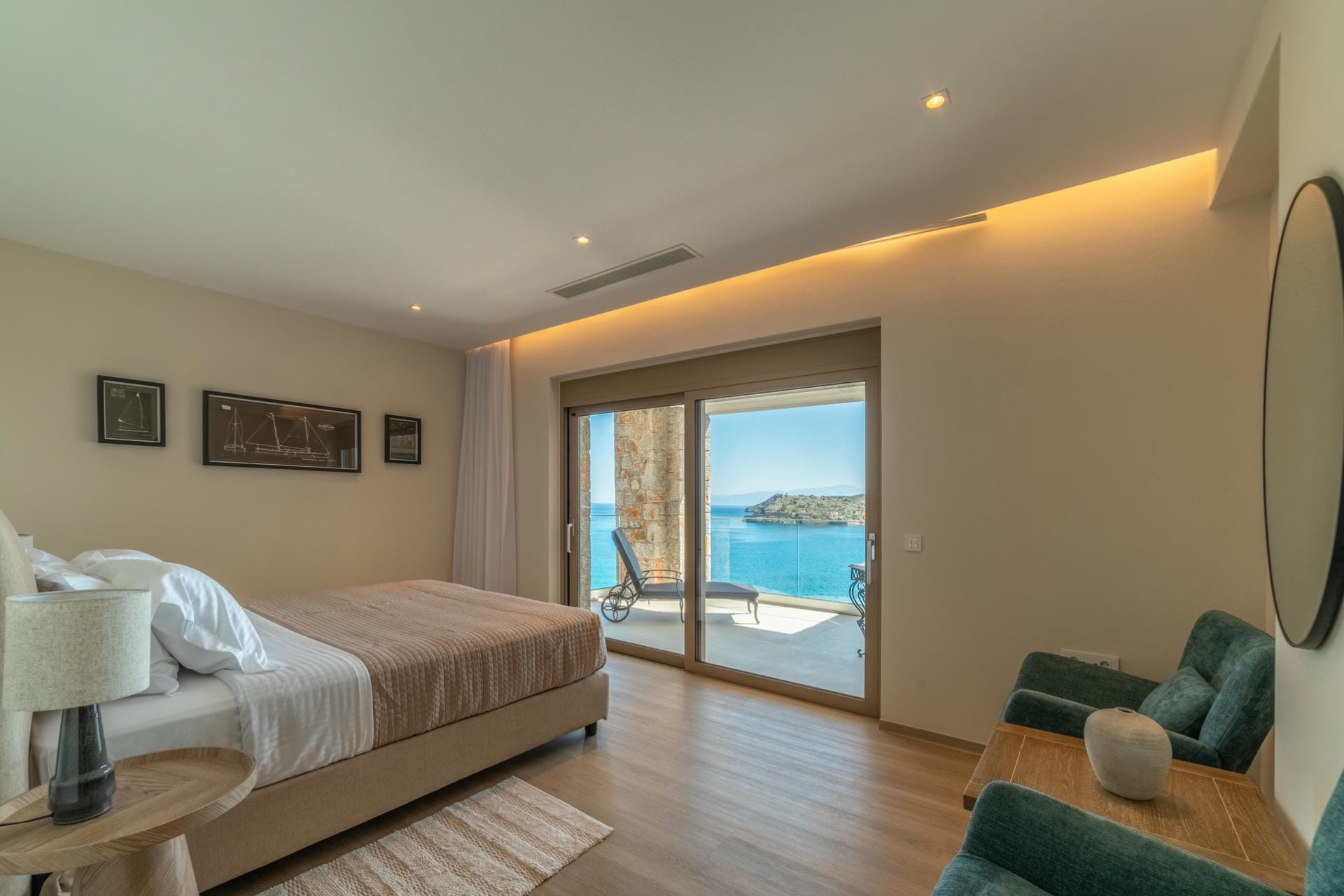 Bedroom 5 – king-size bed, sitting area, en-suite bathroom with dual vanity & shower, terrace access, and sea views
