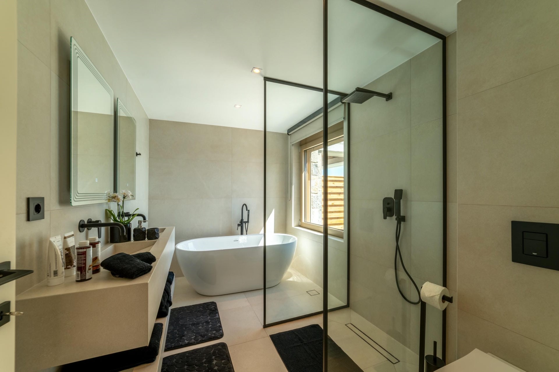 The villa’s 10 en-suite bedrooms are spread across its three levels. On the first floor, four rooms have private terraces where guests can drink in the seafront views, whether from bed or the shower. The master – and largest – bedroom on this level also enjoys a freestanding bathtub right next to a large window to continue highlighting the villa’s enviable seafront position. The ground floor is home to one en-suite bedroom with direct access to the main terrace and into the sunshine. The final five bedrooms are on the lower ground floor. Sat below the pool level, it’s perfect for guests seeking a little extra peace and privacy. Three rooms have direct access to the lower courtyard or the lush green garden space, while two are without direct outdoor access and are best suited to younger guests or personal staff.