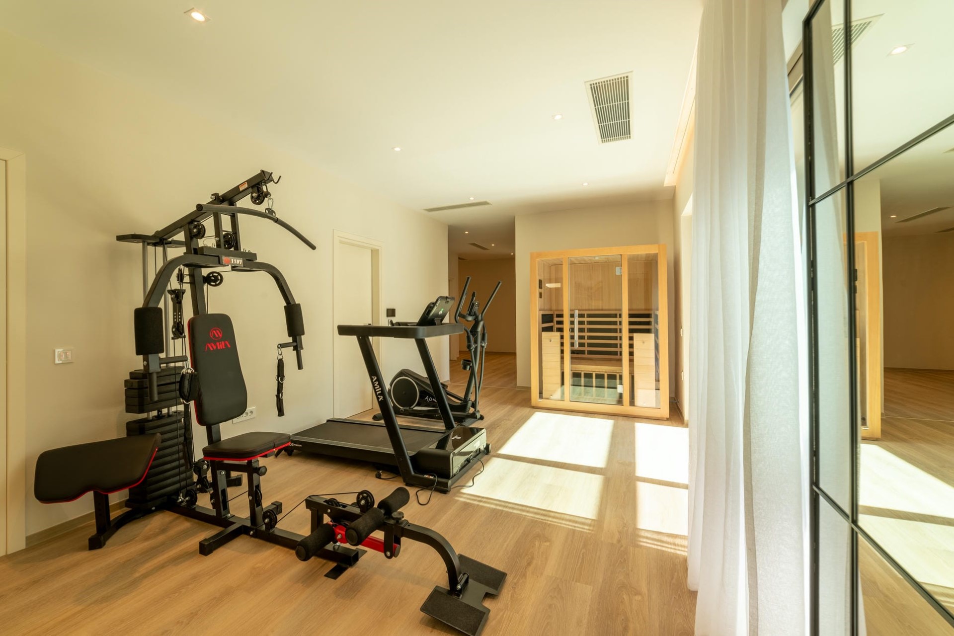Inside, guests can unwind in the villa’s hammam or dip into the Jacuzzi under a huge skylight window, which lets the sun flood the room. The villa’s gym is fully equipped for those looking to stay active. For those seeking a cosy night in, the villa also boasts a nine-seat cinema room.
