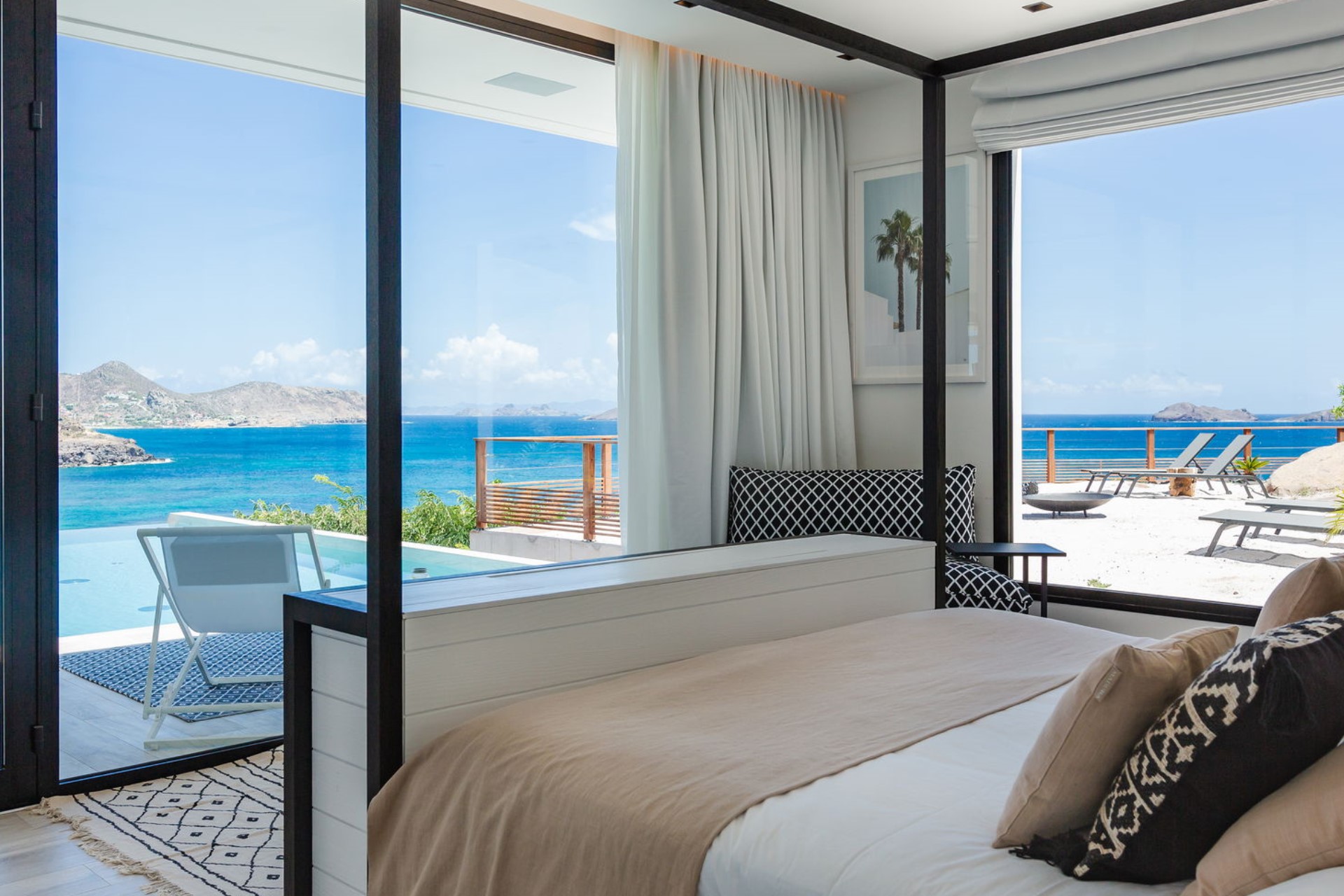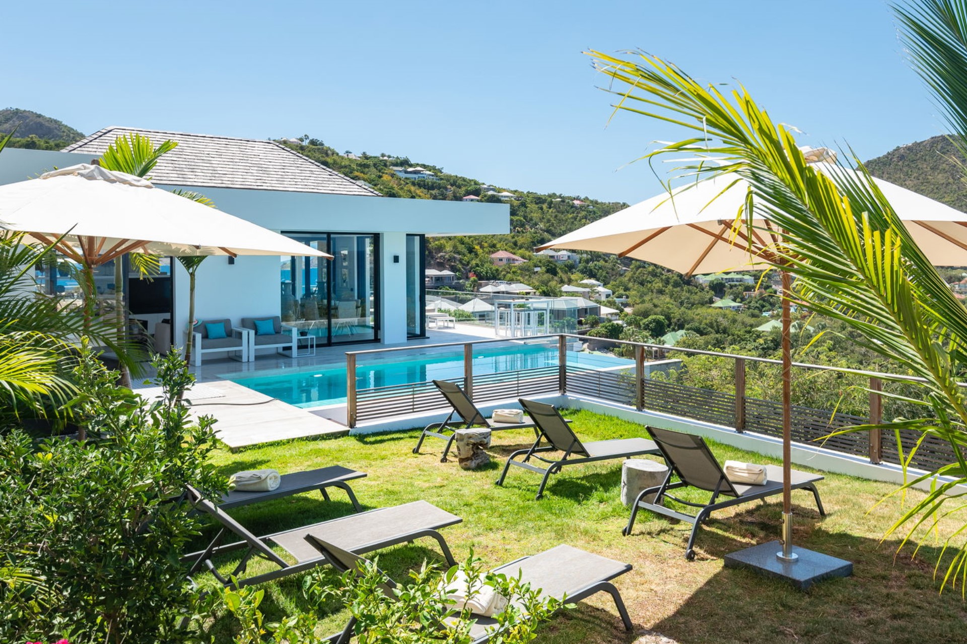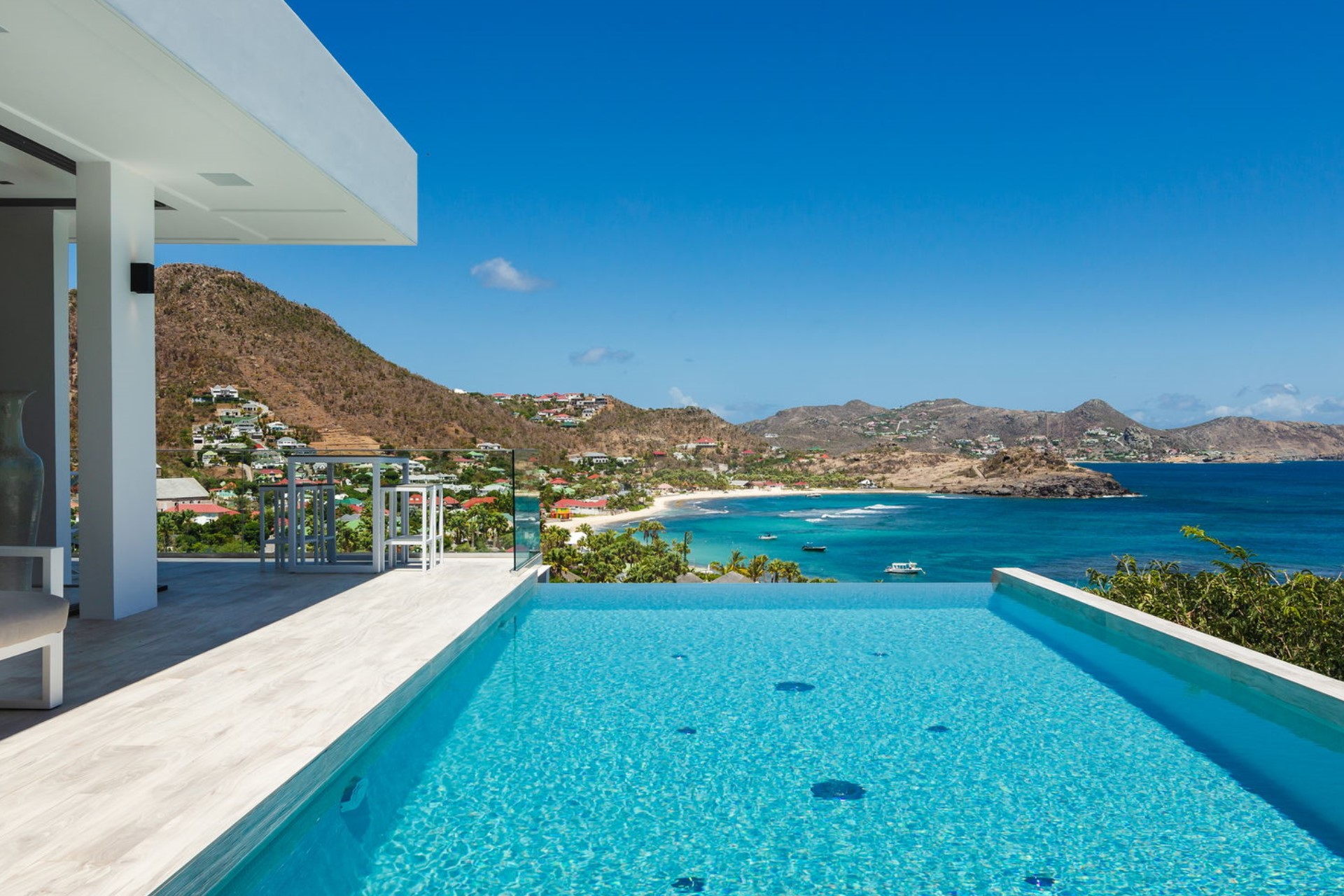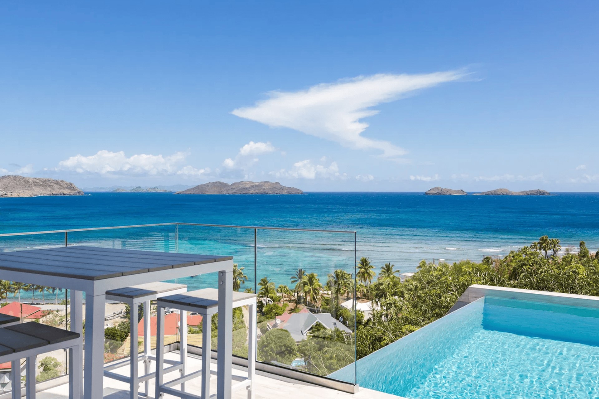 The expansive terrace is designed for relaxation and entertainment, overlooking the splendid Lorient Bay. A heated infinity swimming pool serves as the centrepiece, offering a serene spot to cool off while enjoying the spectacular ocean view. The outdoor lounge and sunbathing area are shaded by large parasols, creating perfect spaces to unwind. The gentle trade winds and rustling palm leaves enhance the tranquil atmosphere, making the terrace an idyllic retreat for guests.