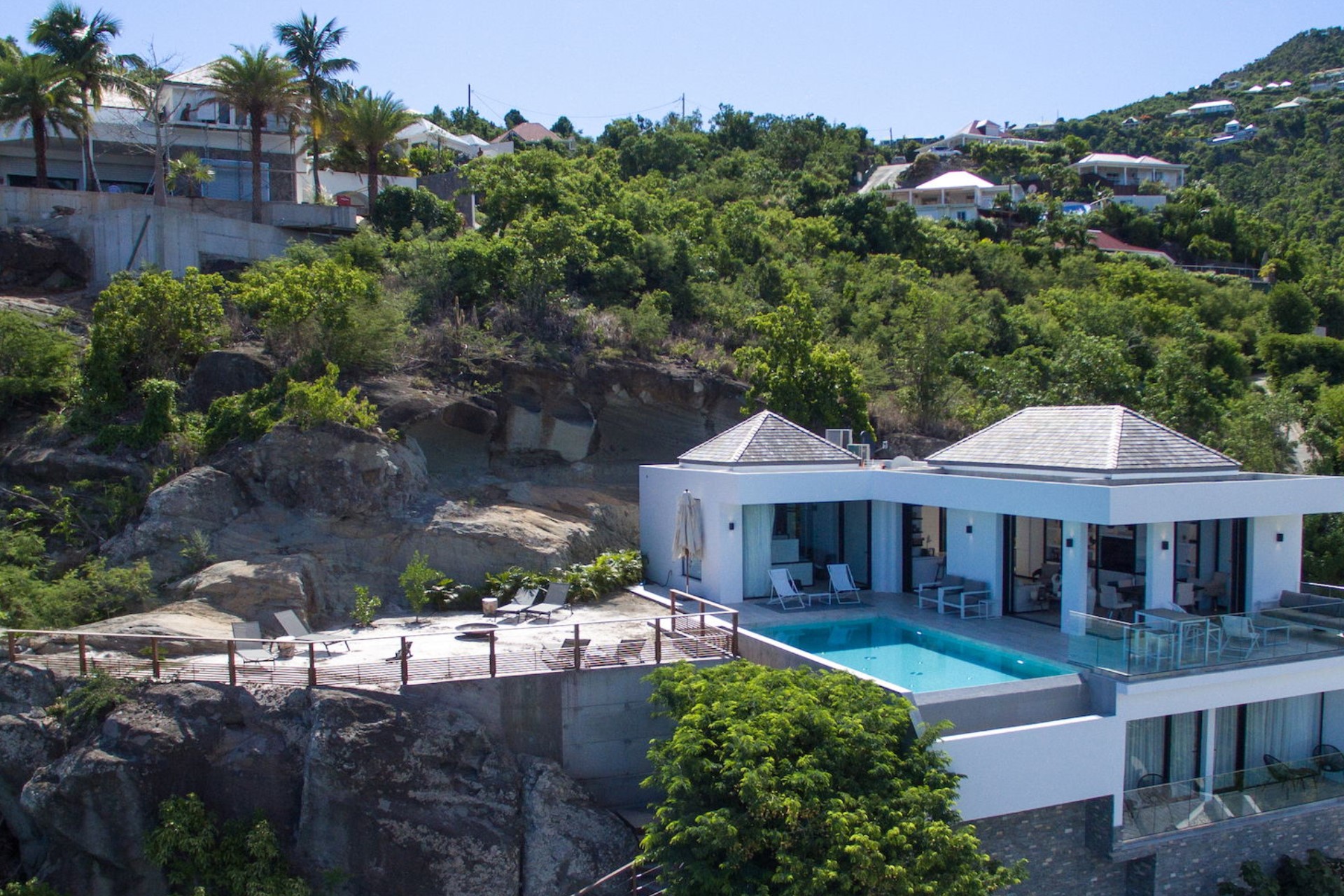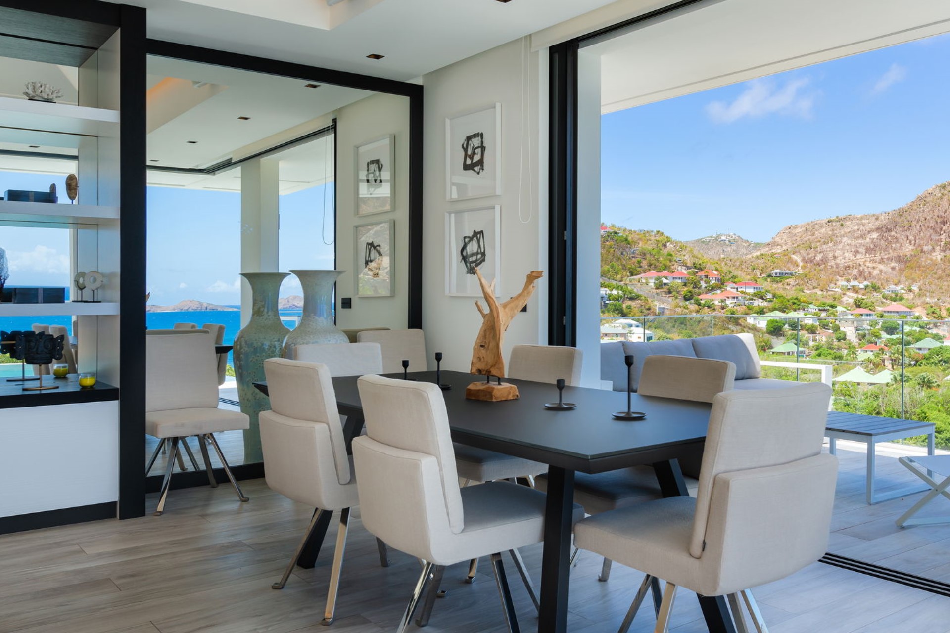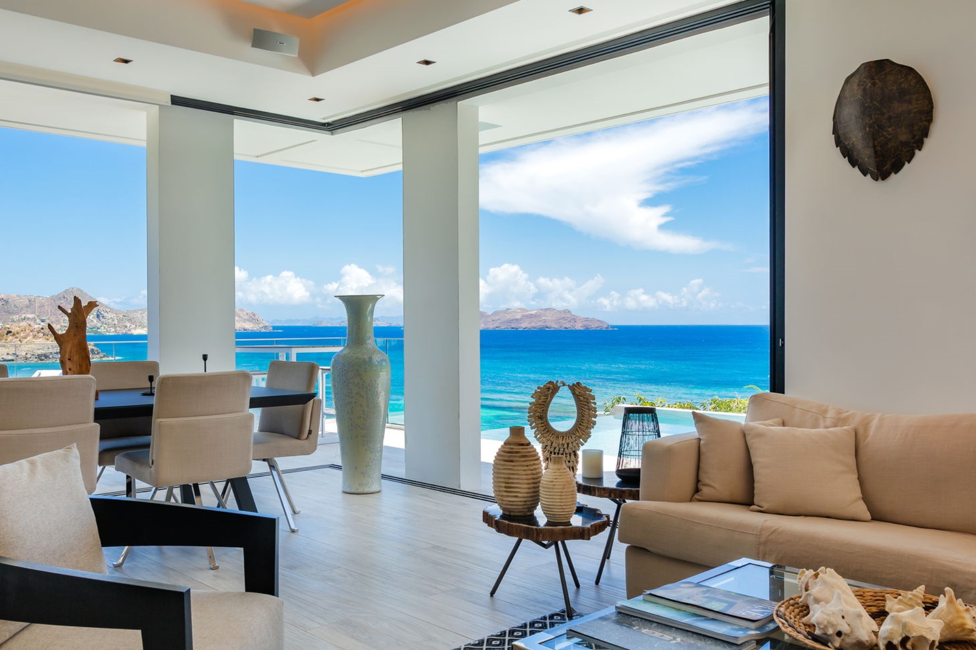 The expansive terrace is designed for relaxation and entertainment, overlooking the splendid Lorient Bay. A heated infinity swimming pool serves as the centrepiece, offering a serene spot to cool off while enjoying the spectacular ocean view. The outdoor lounge and sunbathing area are shaded by large parasols, creating perfect spaces to unwind. The gentle trade winds and rustling palm leaves enhance the tranquil atmosphere, making the terrace an idyllic retreat for guests.