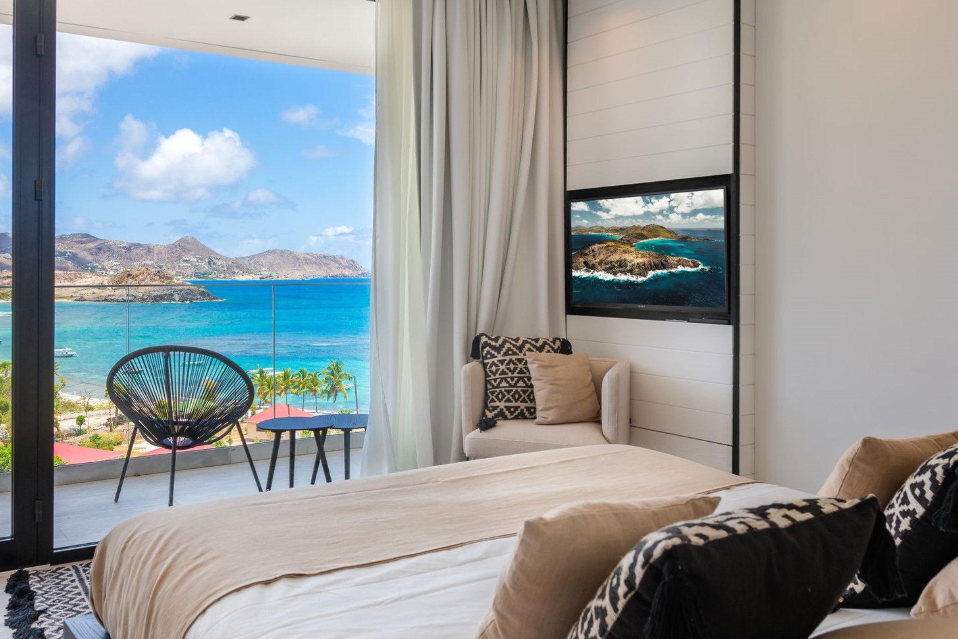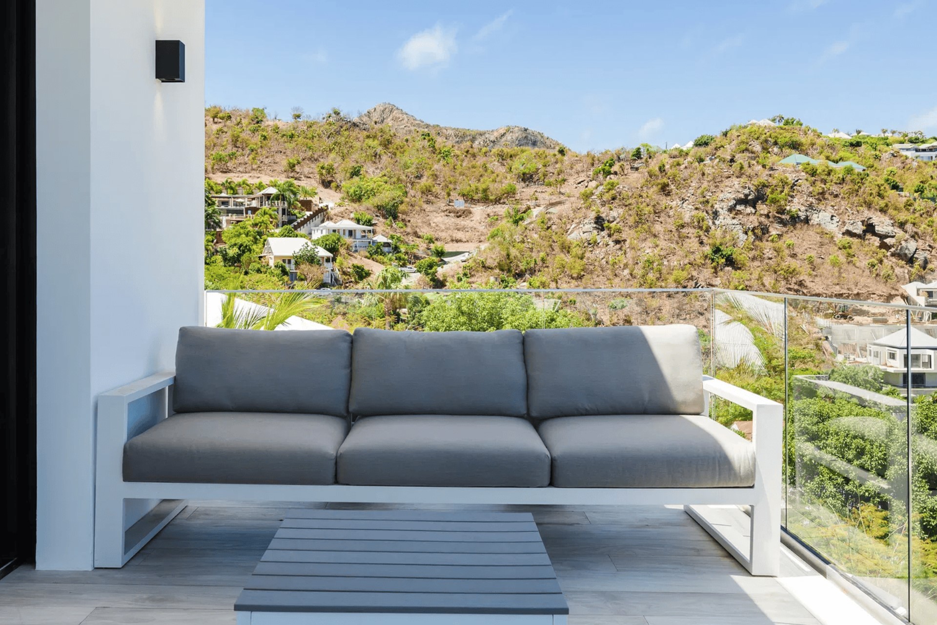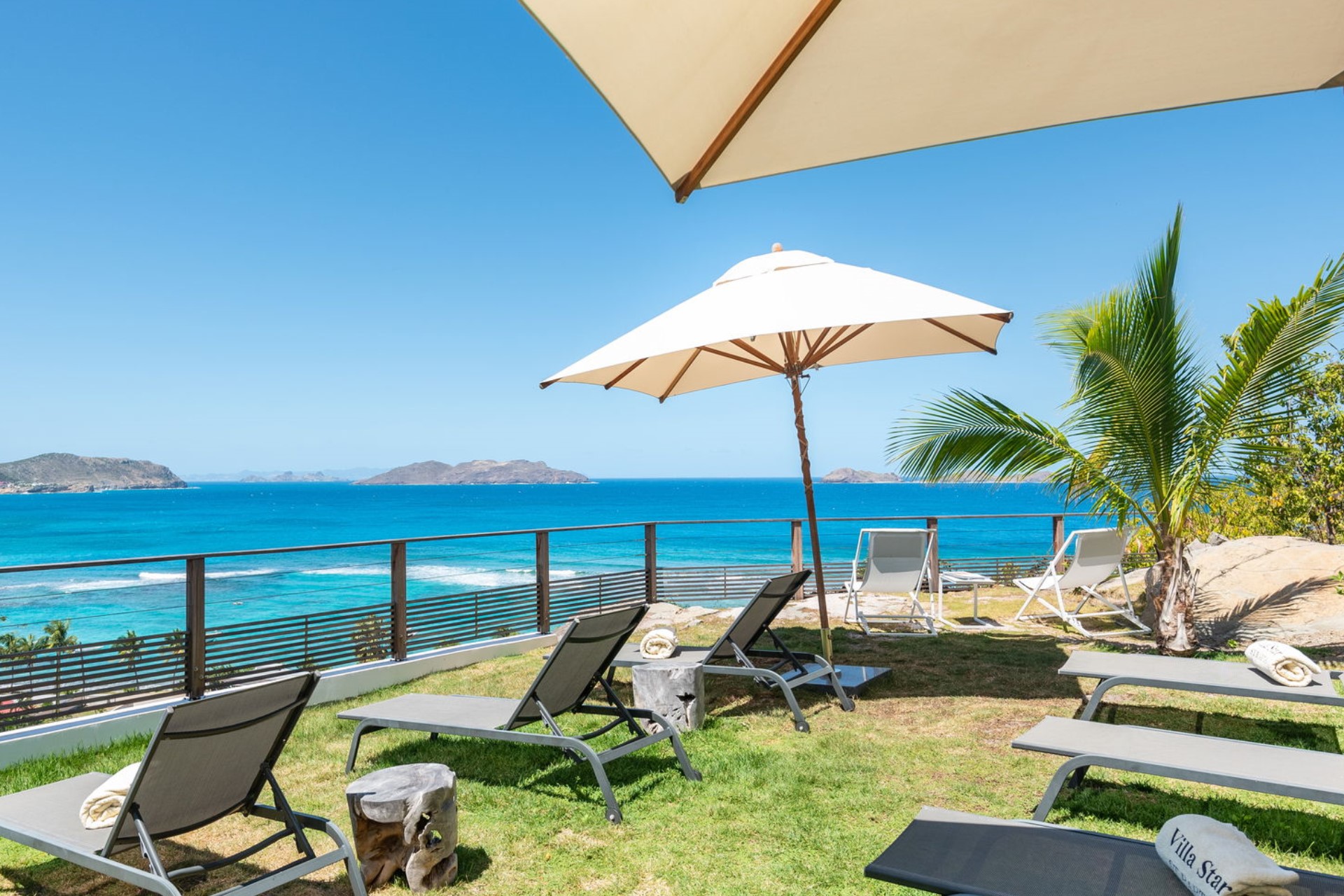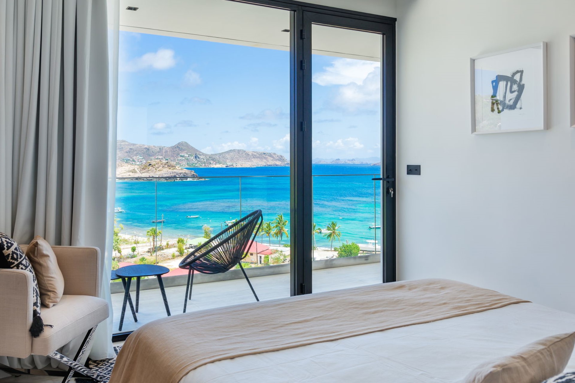 The expansive terrace is designed for relaxation and entertainment, overlooking the splendid Lorient Bay. A heated infinity swimming pool serves as the centrepiece, offering a serene spot to cool off while enjoying the spectacular ocean view. The outdoor lounge and sunbathing area are shaded by large parasols, creating perfect spaces to unwind. The gentle trade winds and rustling palm leaves enhance the tranquil atmosphere, making the terrace an idyllic retreat for guests.