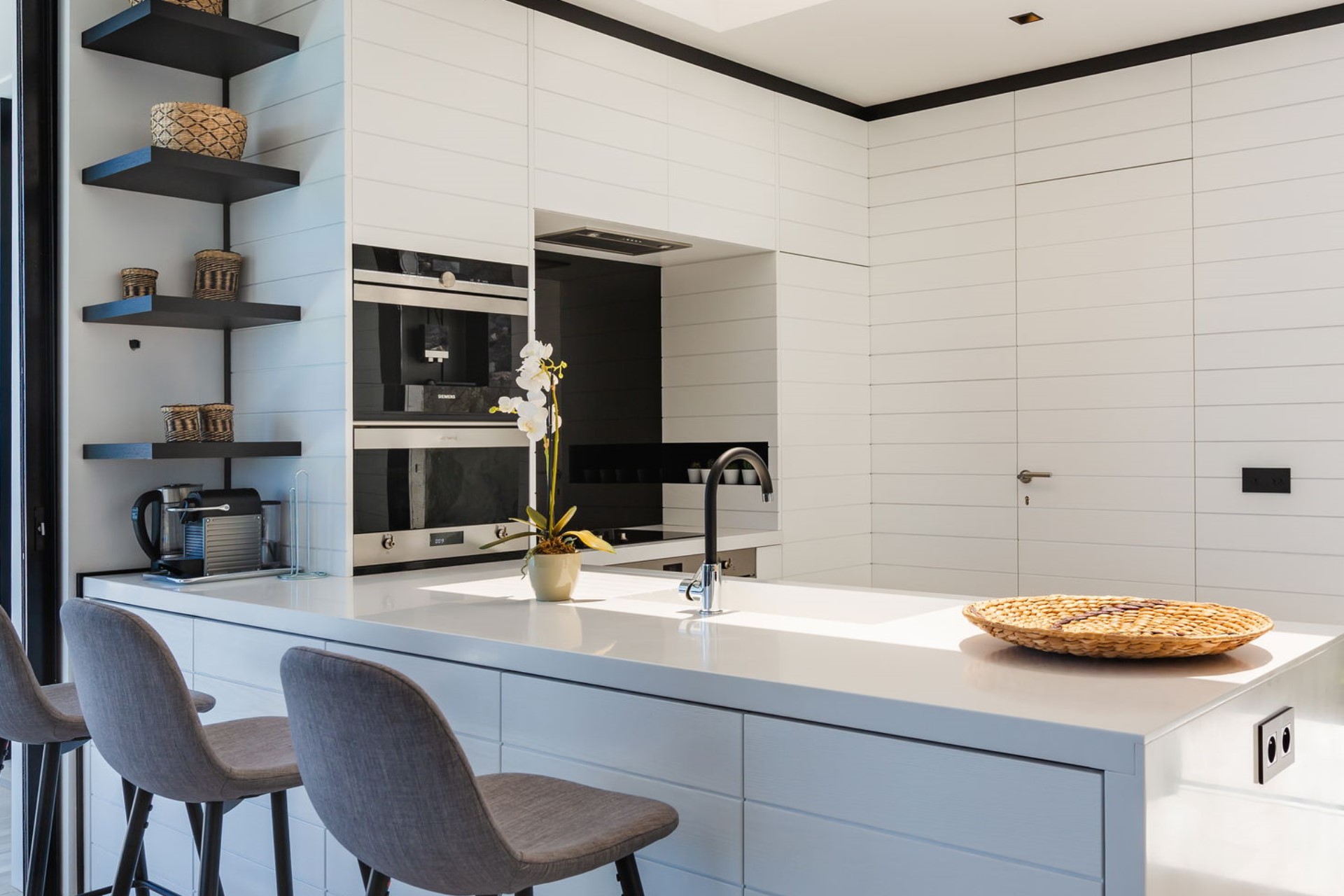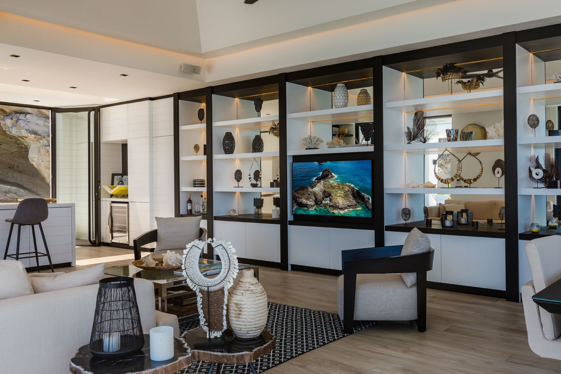 The villa’s main level features a beautiful air-conditioned living room that opens onto the deep blue waters of St Barths. Decorated in creamy white and natural tones, the indoor space is a relaxing and peaceful haven. High ceilings with contemporary lighting and driftwood-inspired accents enhance the refined ambiance. The dining room, positioned in front of a large opening, offers breathtaking ocean panoramas, creating an ideal gathering place. At the back, a well-equipped kitchen with a breakfast bar provides a welcoming space for both culinary creations and casual conversation.