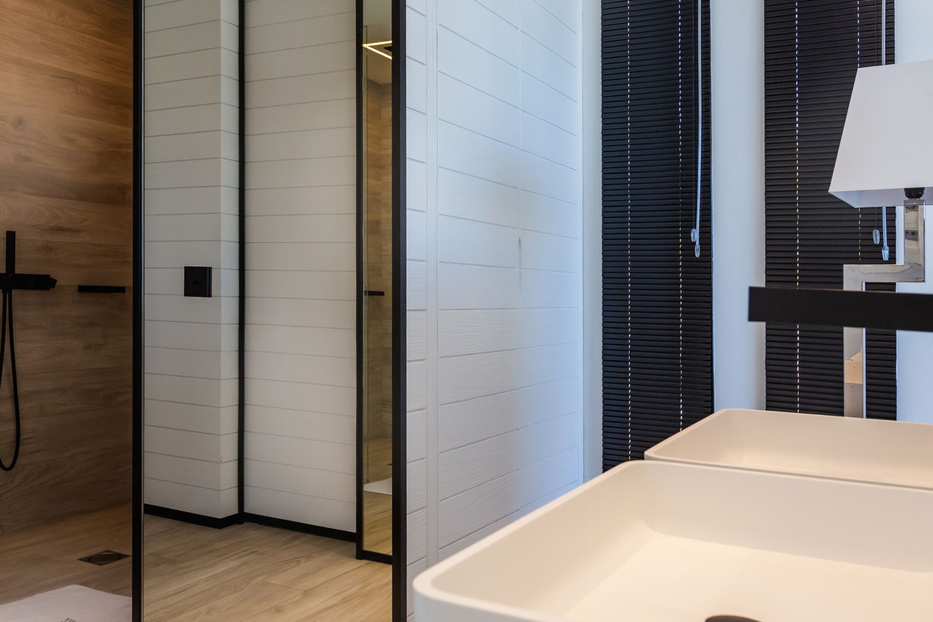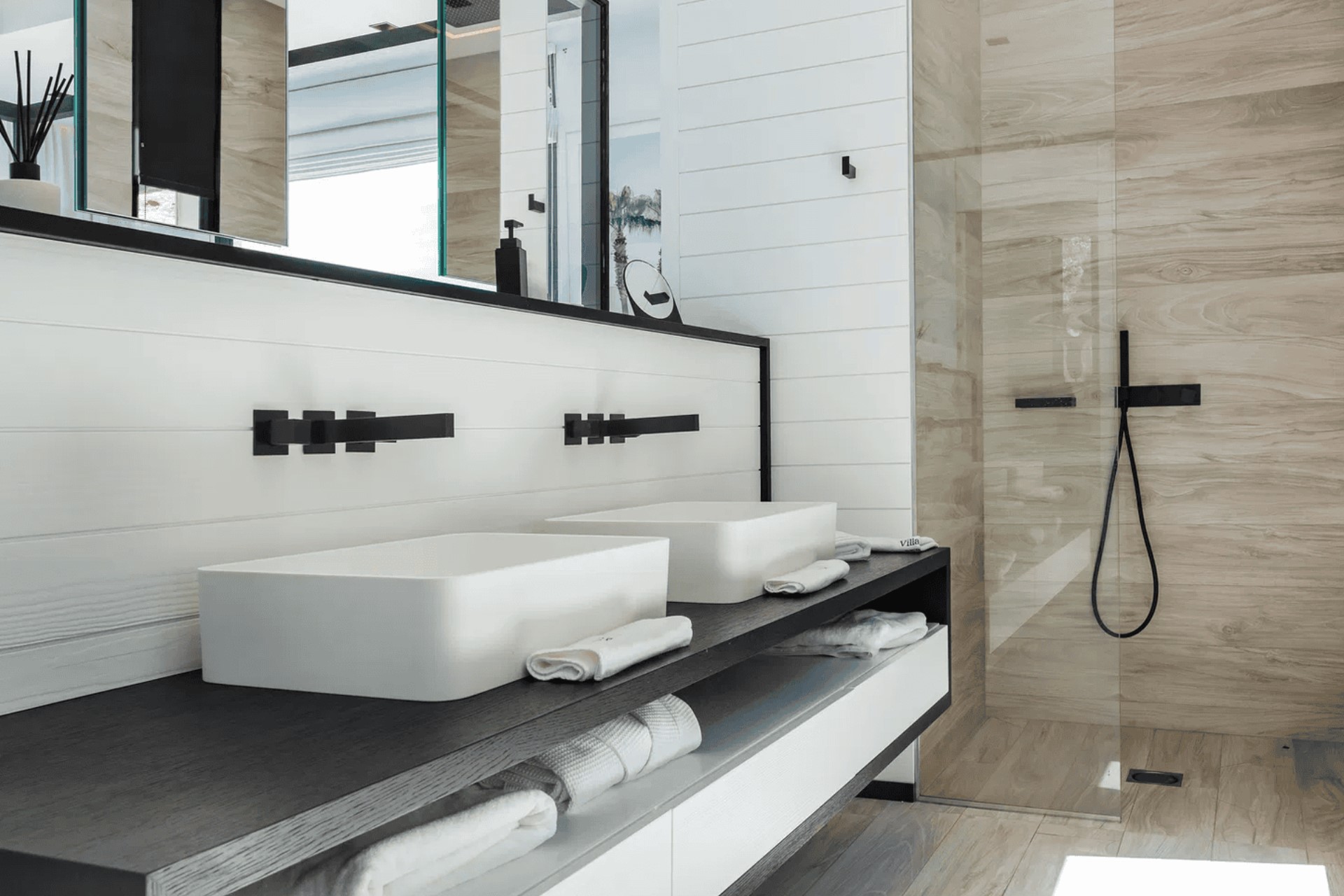 Bedroom 1 – king-size bed, en-suite bathroom with dual vanity and shower, terrace access with ocean view