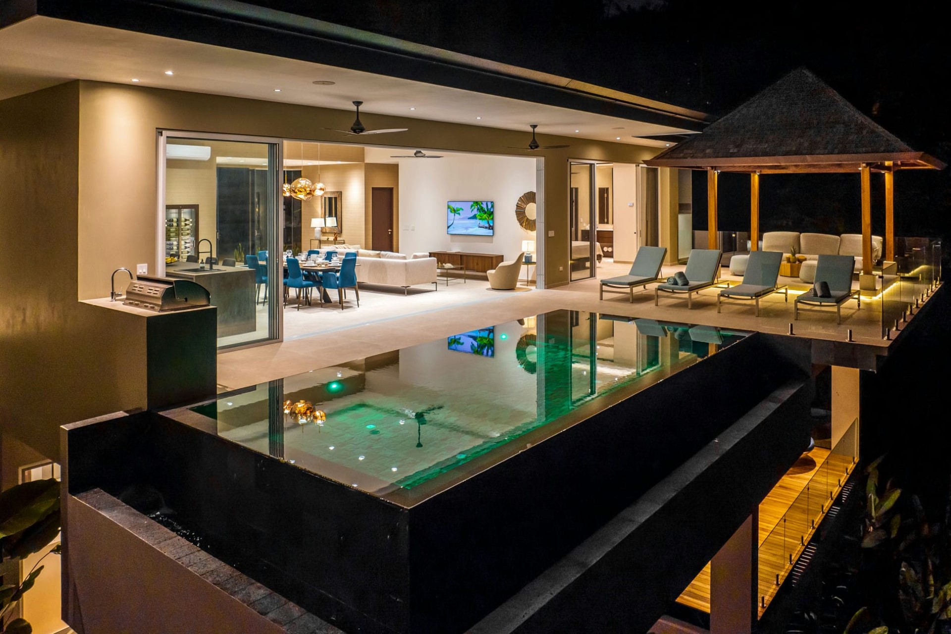 A sprawling terrace features a glassy infinity pool lined with sun loungers. A shaded lounge area at one end provides the perfect place to relax and take in the panorama with a drink in hand, whilst at the other, there is a barbecue area for preparing delicious al fresco meals.