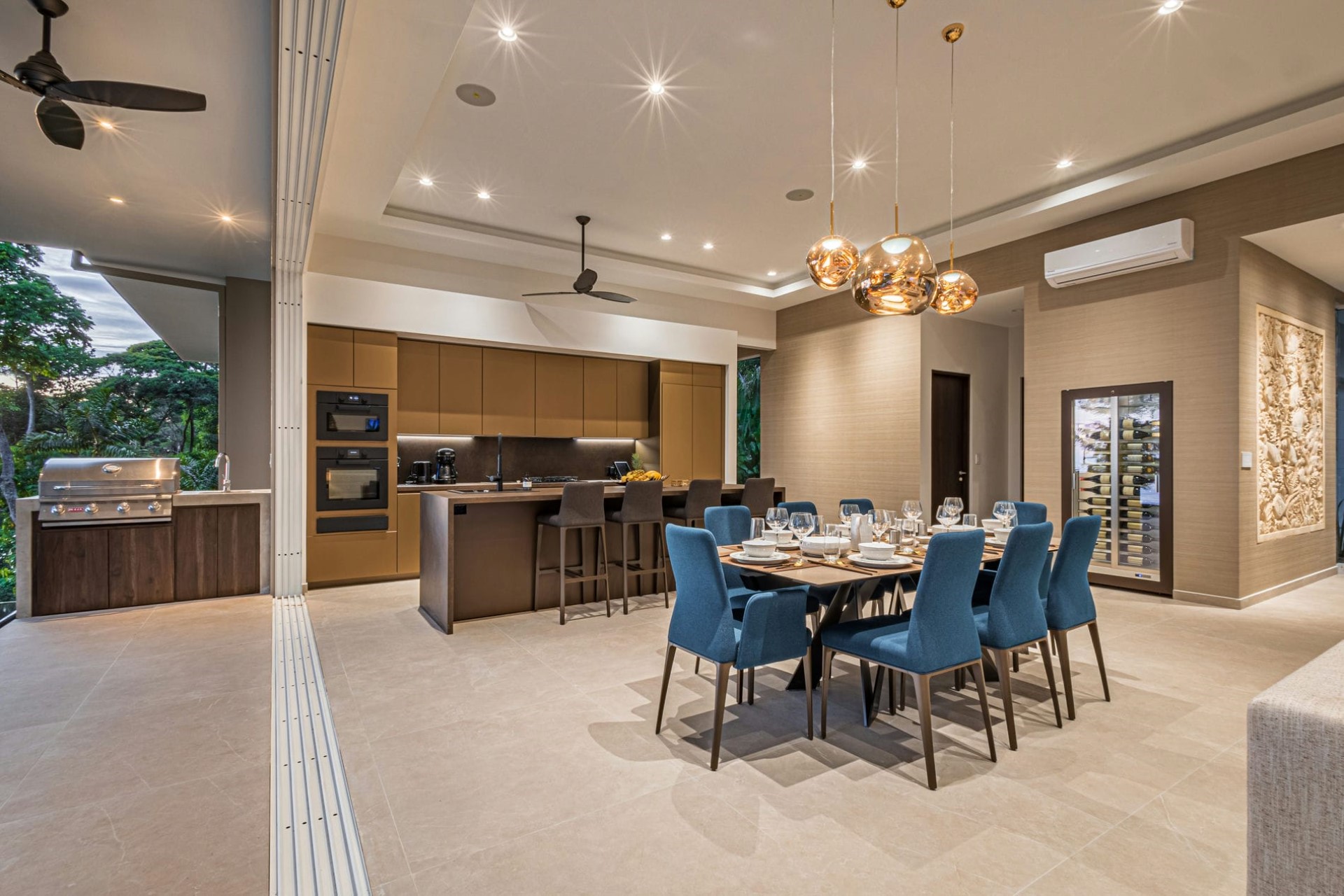 After a day of exploring local beaches or enjoying thrilling encounters with native wildlife, guests can relax in front of a film in the lounge area or enjoy elegant dinner parties at the central dining table, which overlooks the pool, the forest, and the ocean beyond. The fully equipped chef’s kitchen also offers bar seating for more relaxed meals and drinks.