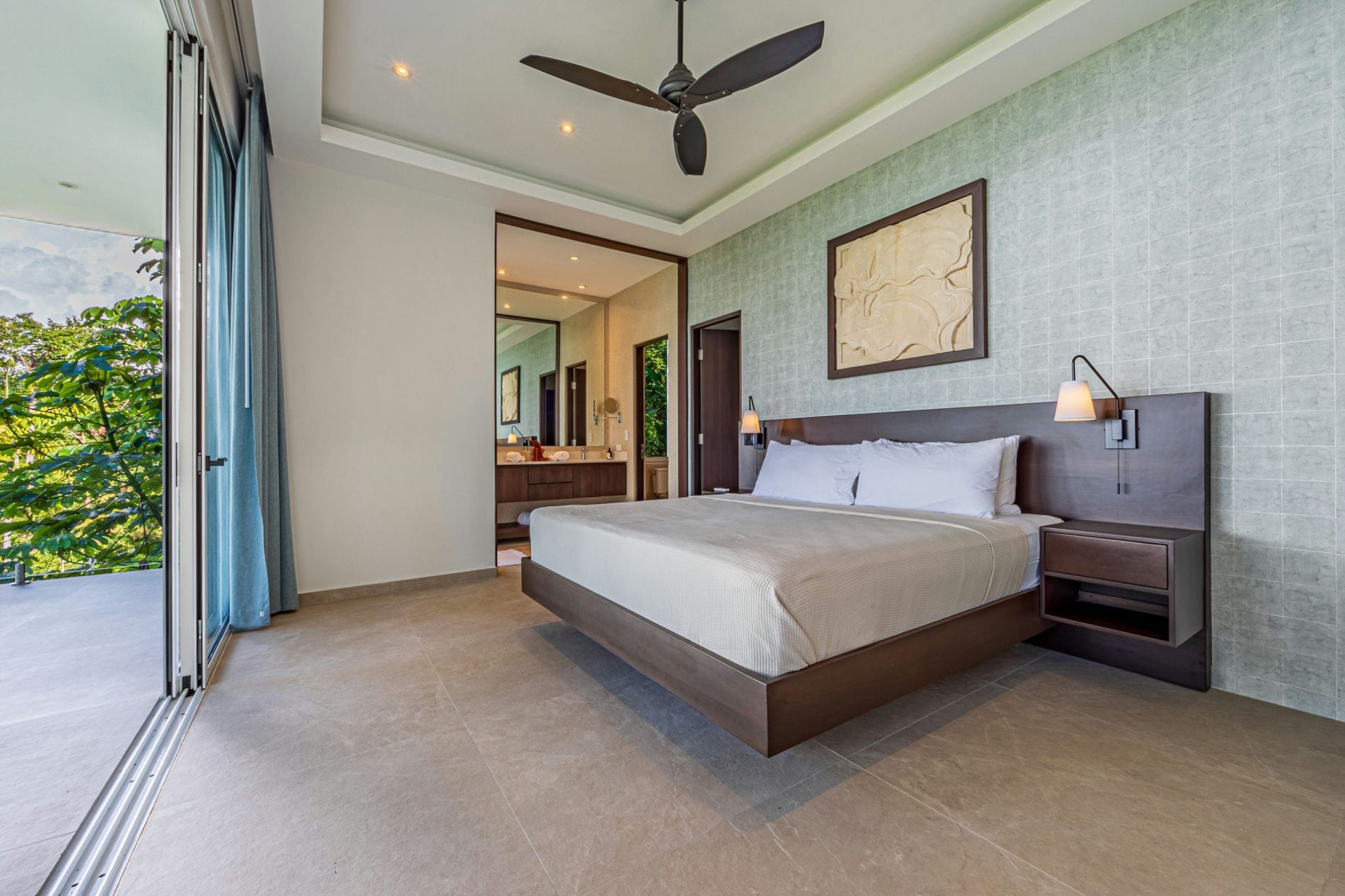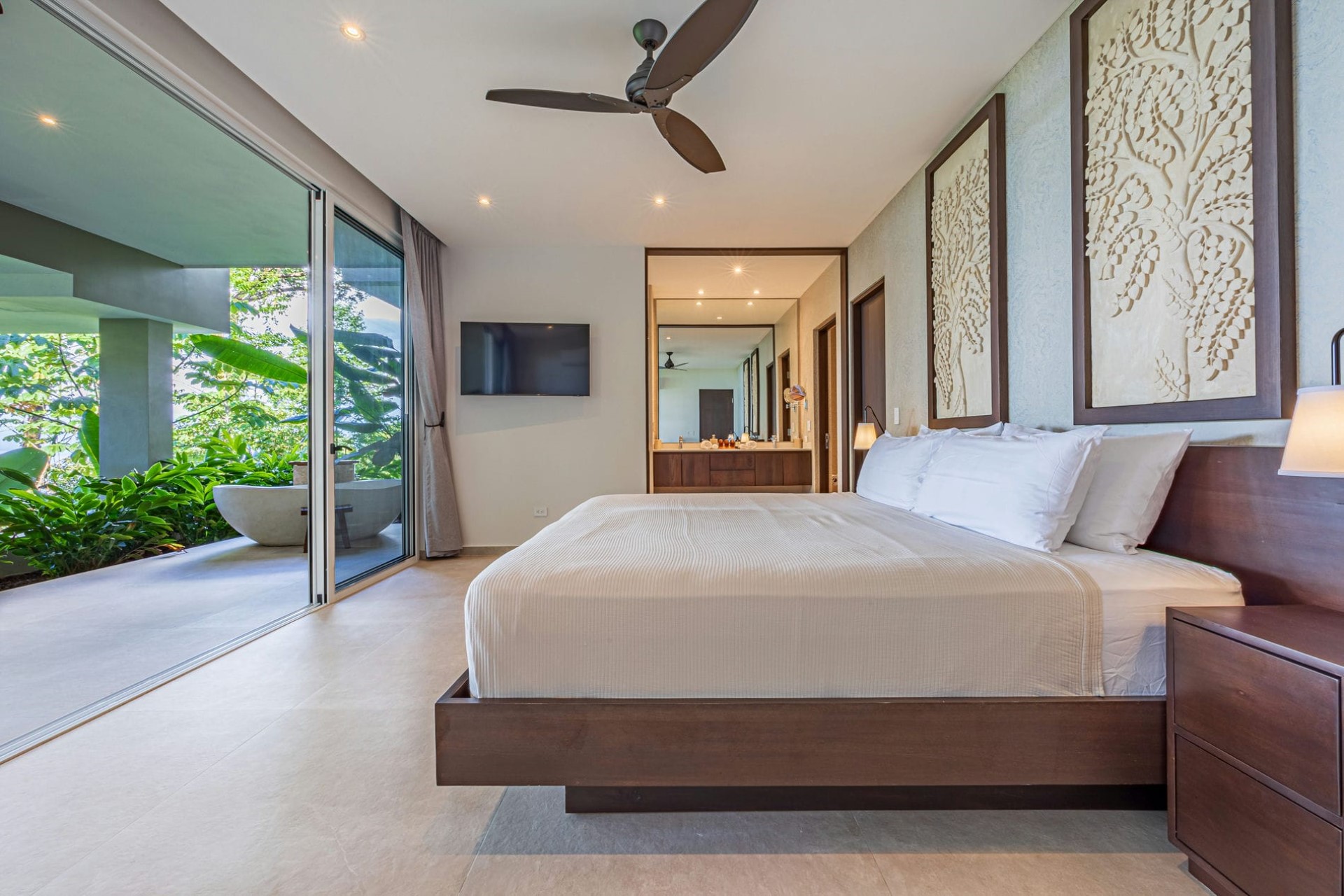 Bedroom 2 – king-size bed, dressing room, en-suite bathroom with shower, pool terrace access, and ocean & jungle views