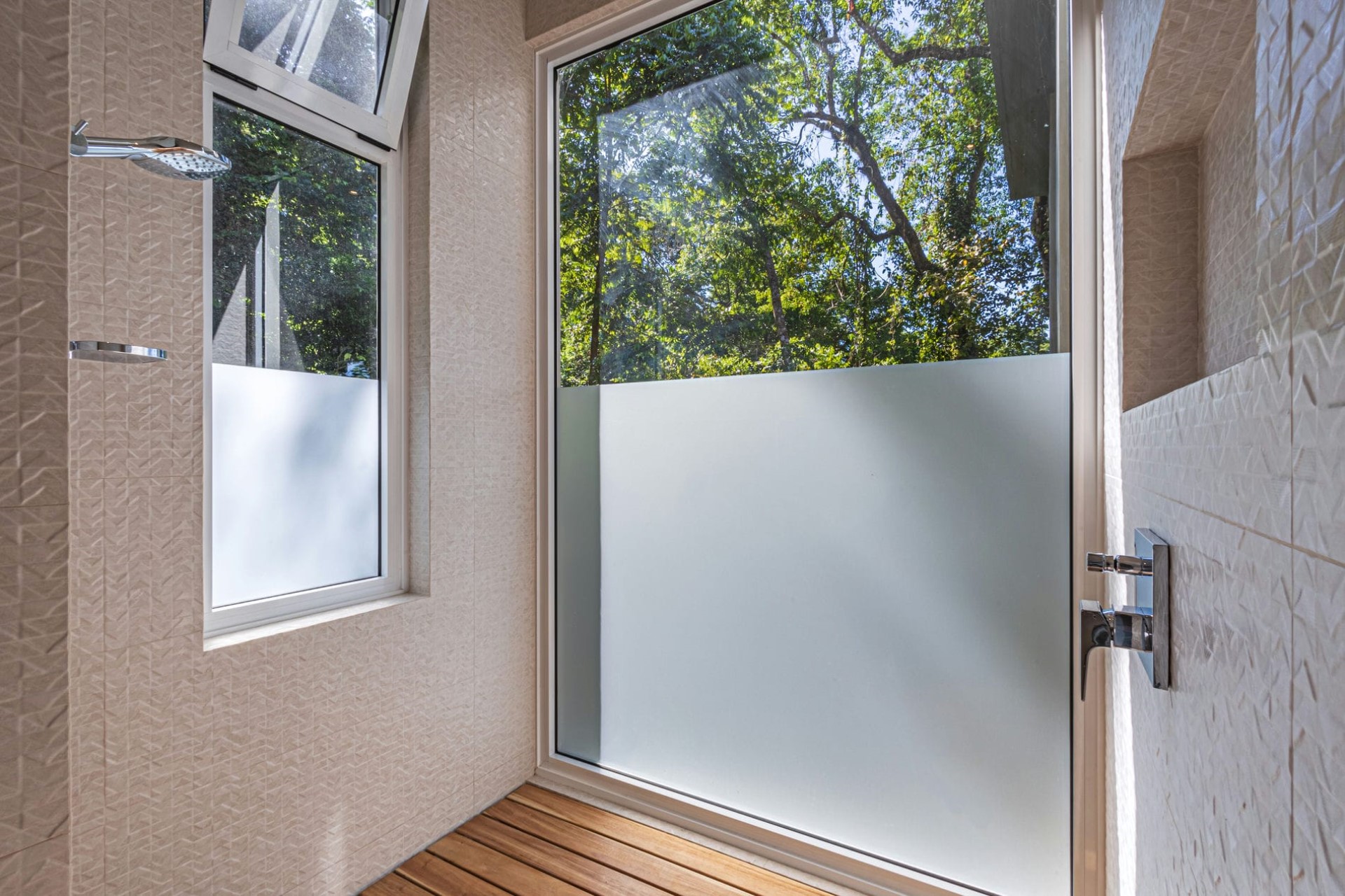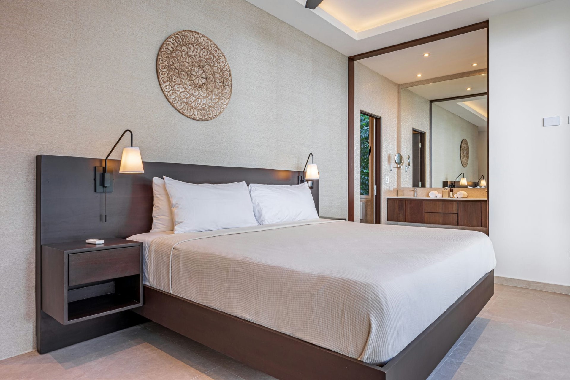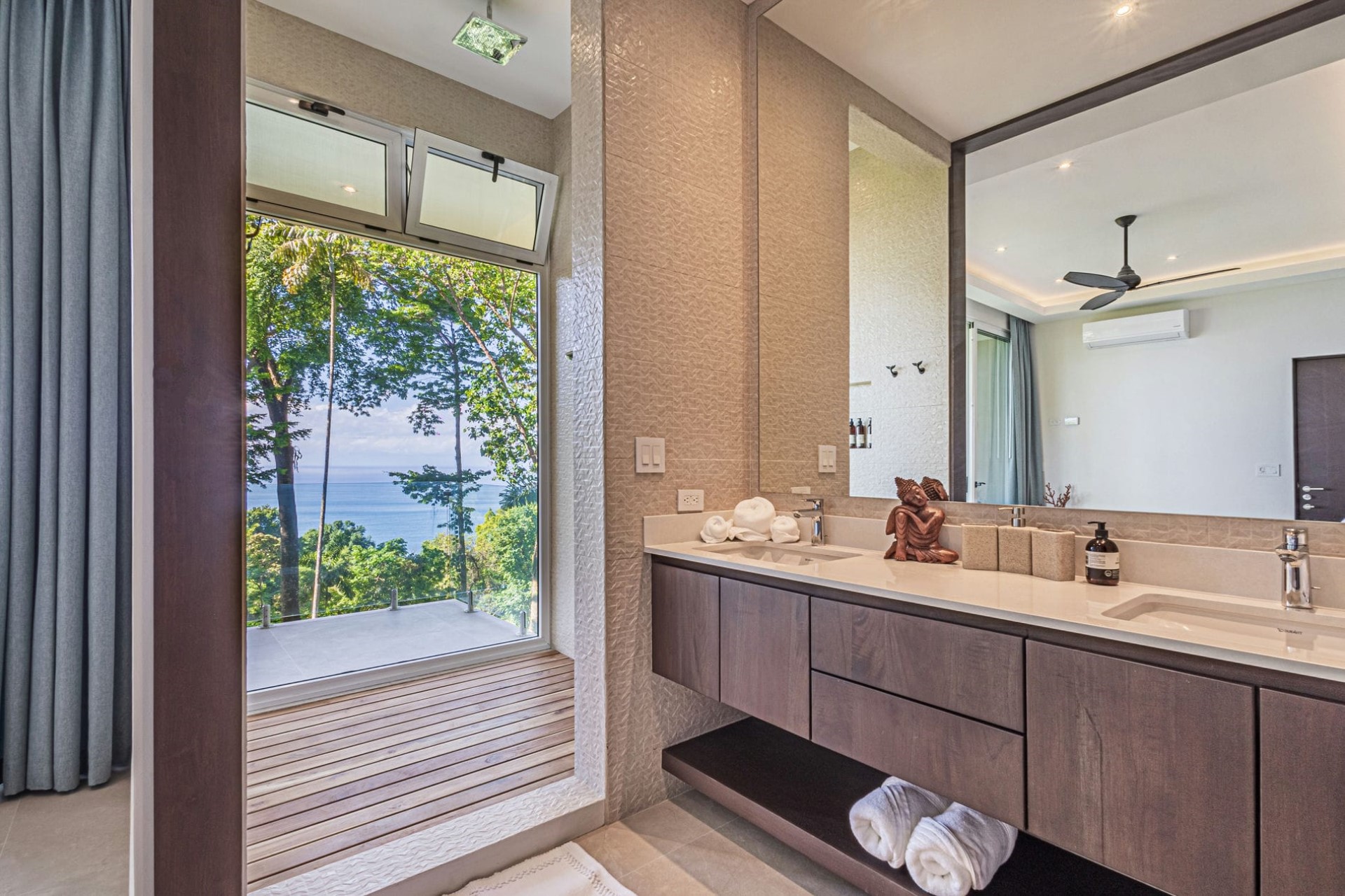 Four ocean-facing suites are set across the villa’s two floors. Each features en-suite facilities and most have spacious private terraces furnished with outdoor seating where guests can enjoy their morning coffee in peace, with only the tropical birds in the surrounding trees for company. One bedroom also boasts a luxurious outdoor bathtub for the ultimate soak in nature.