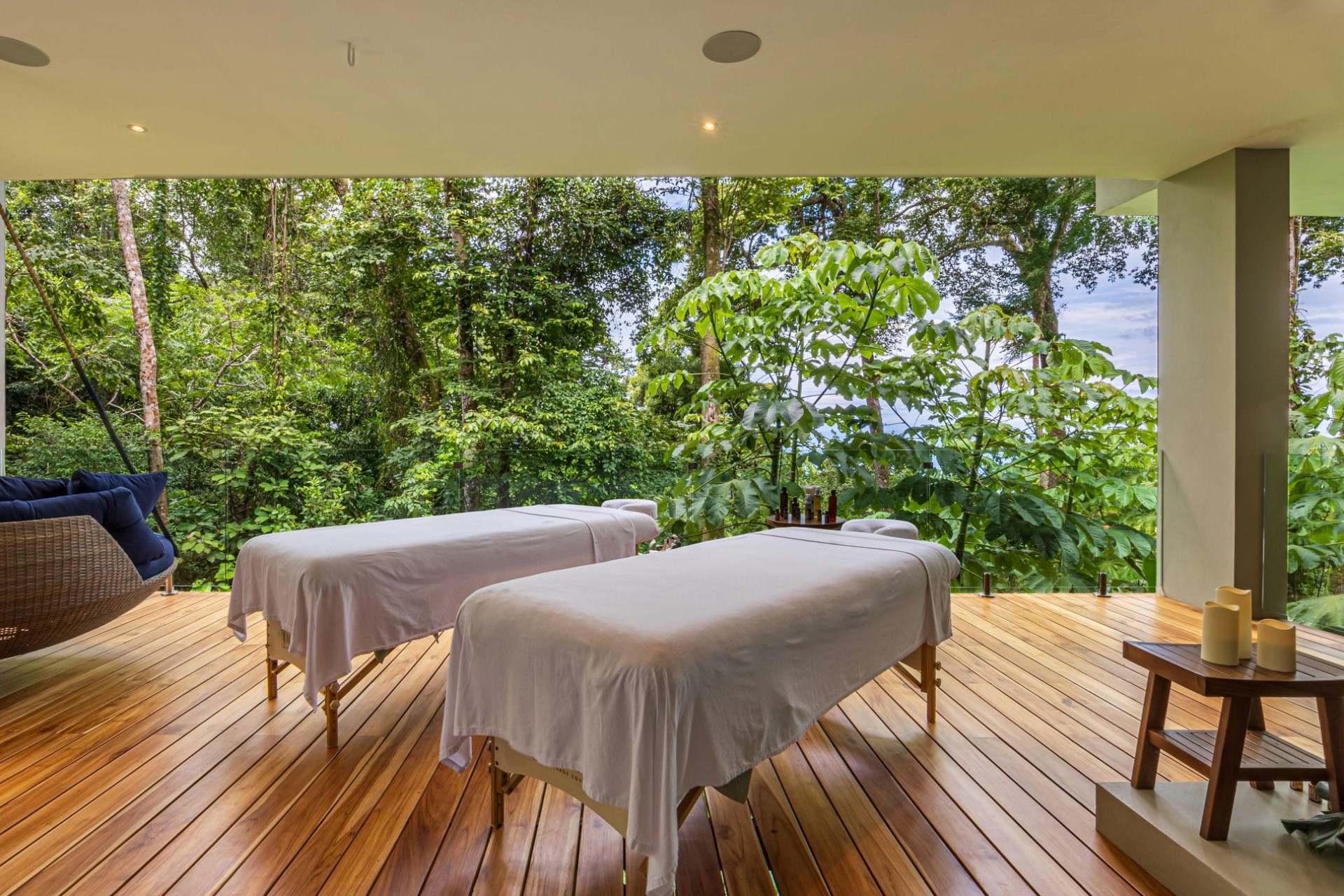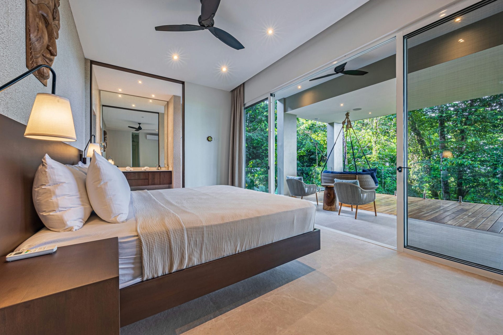 Bedroom 3 – king-size bed, dressing room, en-suite bathroom with shower, large private terrace with sitting area & swing seat, and ocean & jungle views