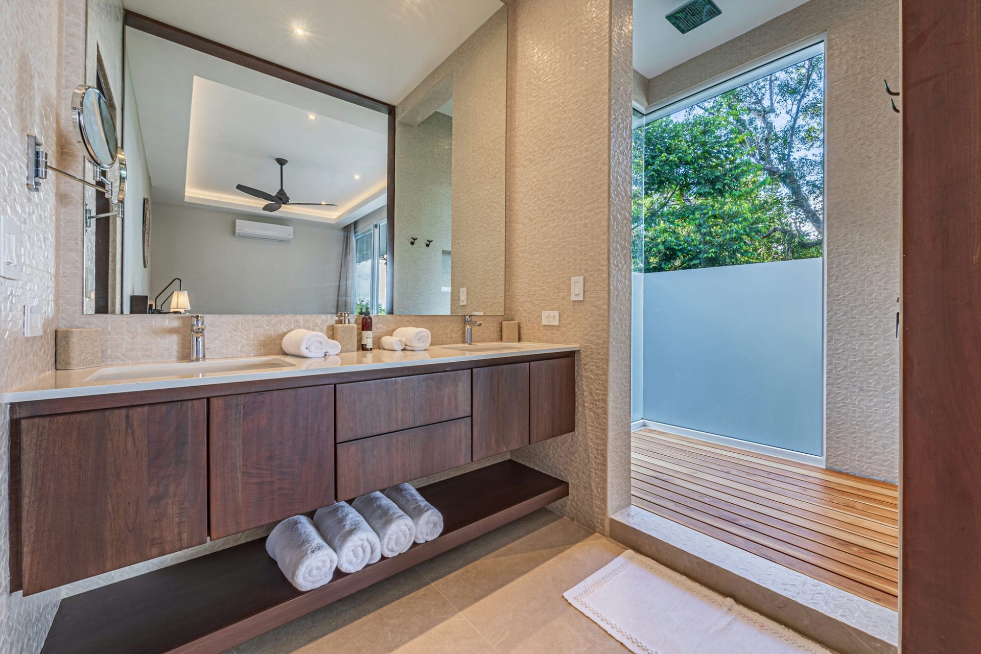 Bedroom 4 – twin beds (converted to king-size on request), dressing room, en-suite bathroom with shower, private terrace with outdoor bathtub & sitting area, and ocean & jungle views