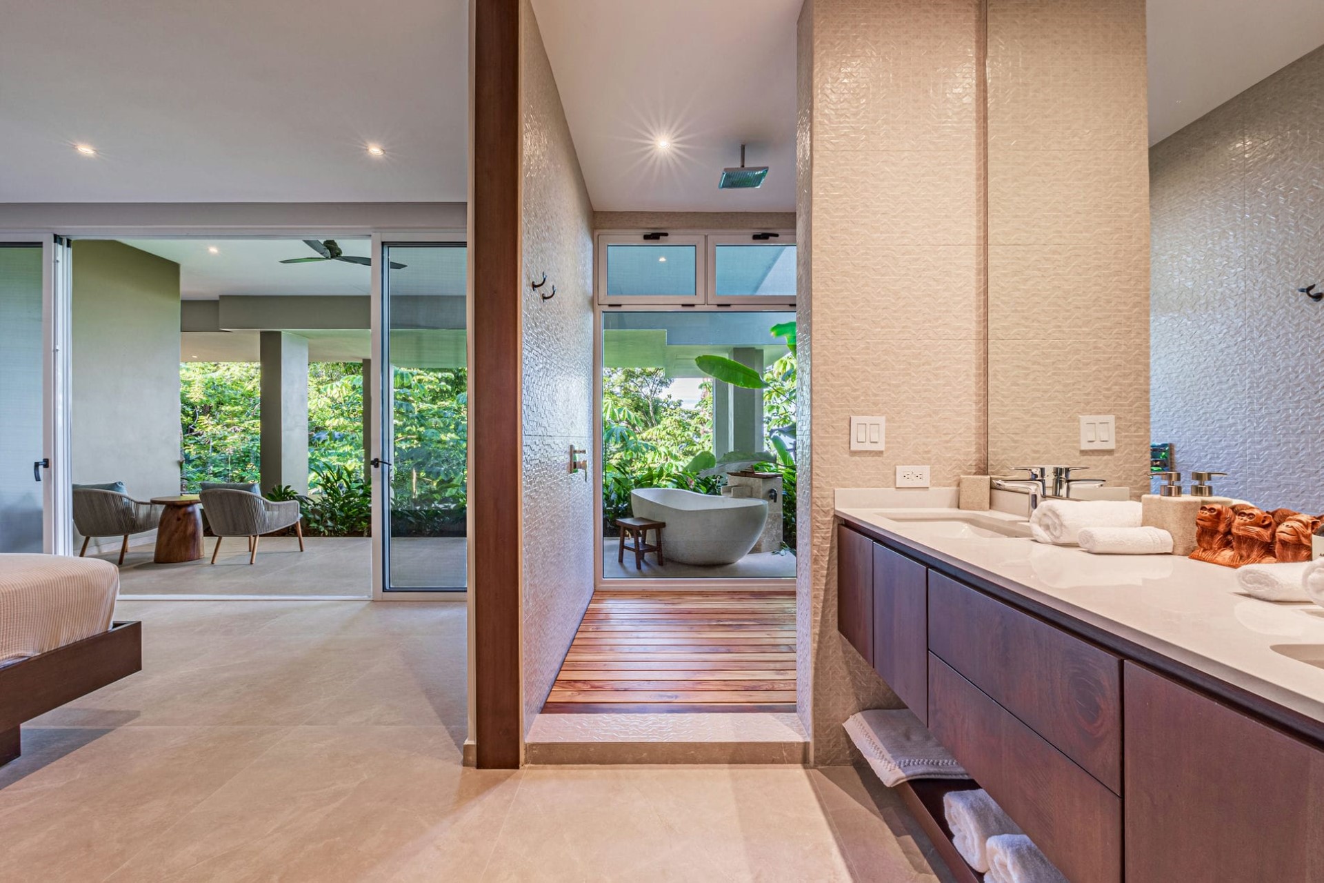 Bedroom 1 – king-size bed, dressing room, en-suite bathroom with shower, private terrace with sitting area, and ocean & jungle views