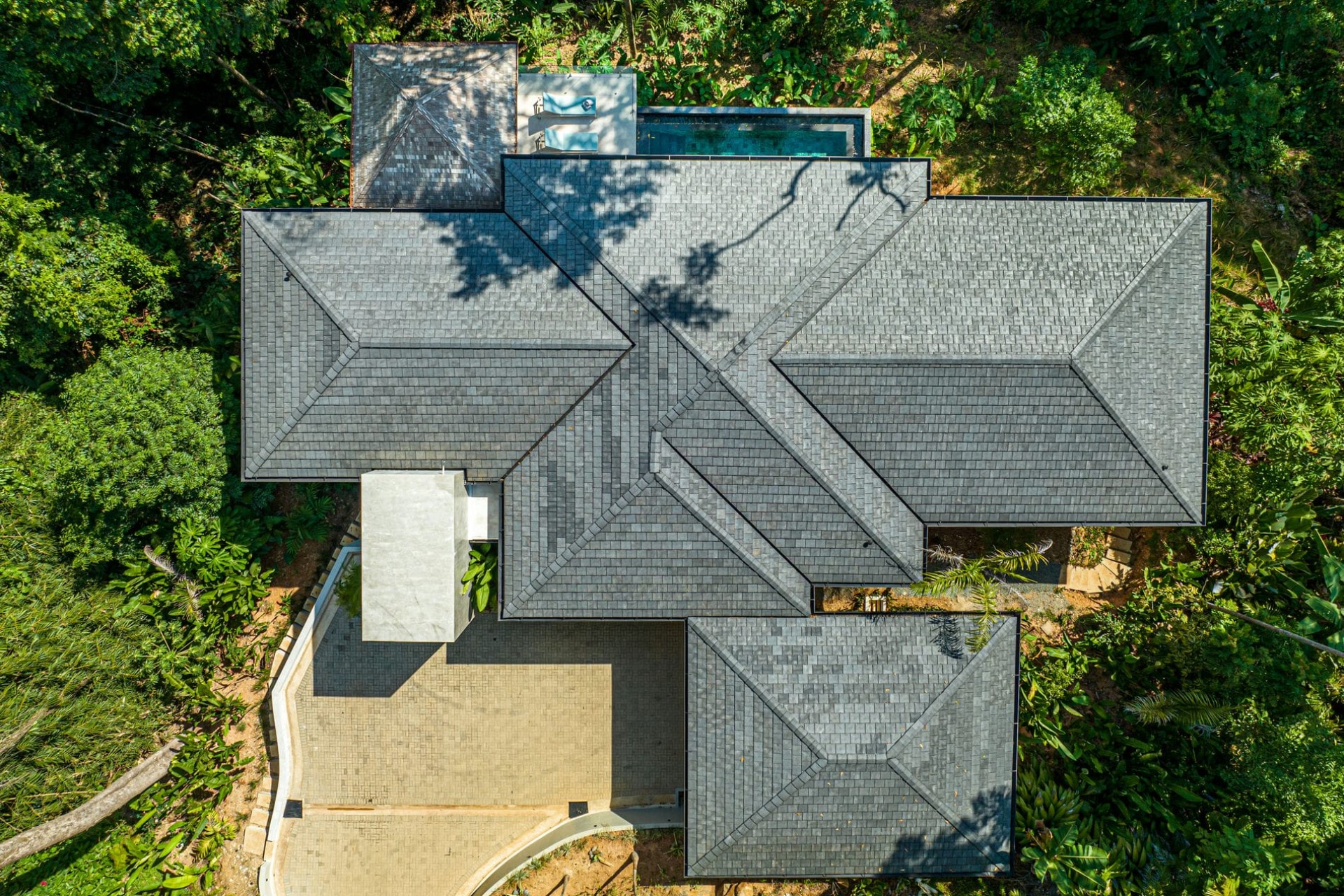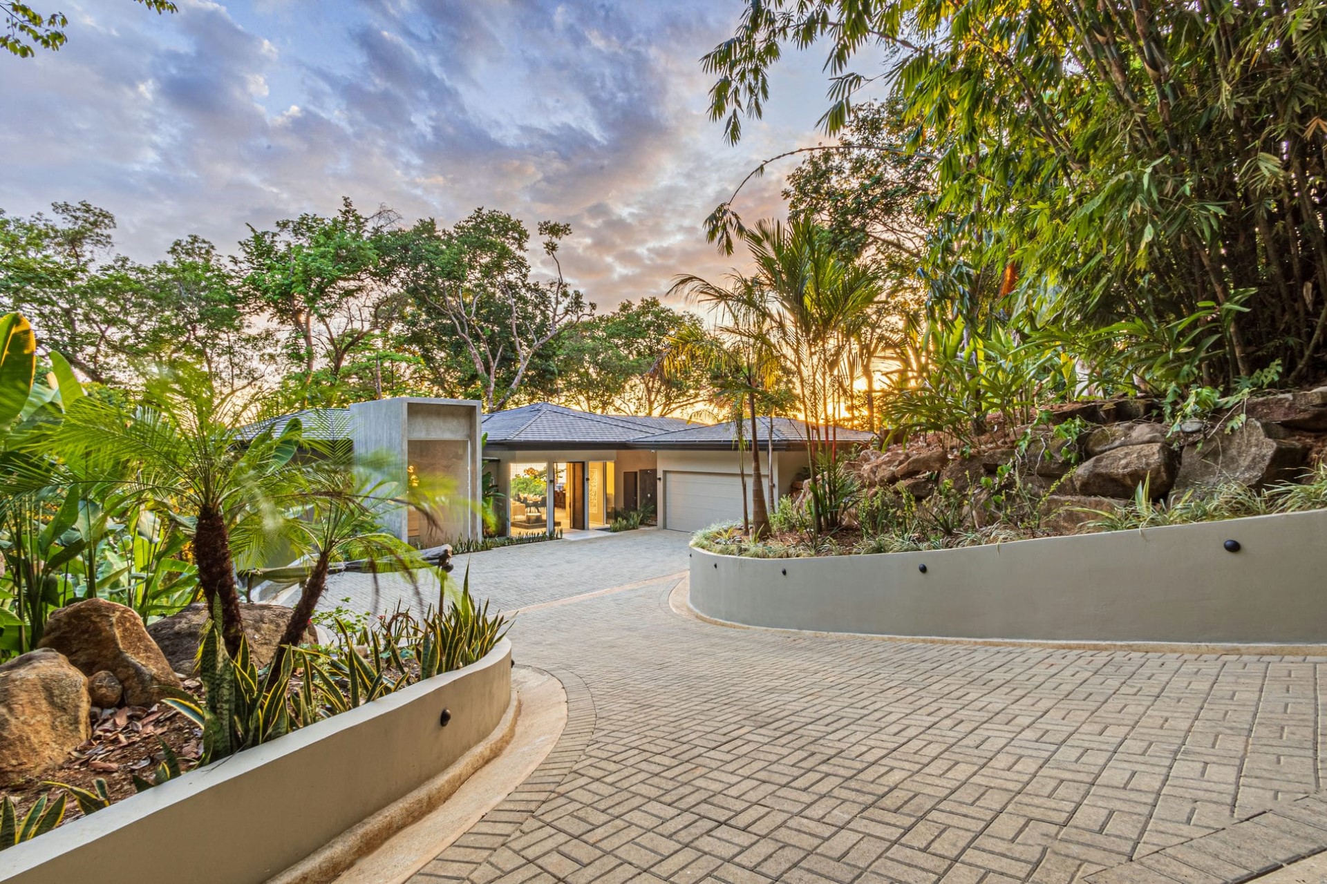 Landscaped gardens envelop the villa, filled with verdant tropical plants and fruit trees, which blend seamlessly into the surrounding forest.