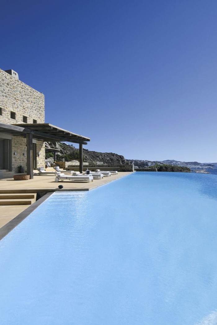Behind the main house, guests will find an incredible 180-degree view over the sea and island, as well as views of the historic town of Mykonos. The sprawling infinity pool is the perfect place to soak up the views before relaxing on a poolside lounger or in the large shaded lounge and dining area.