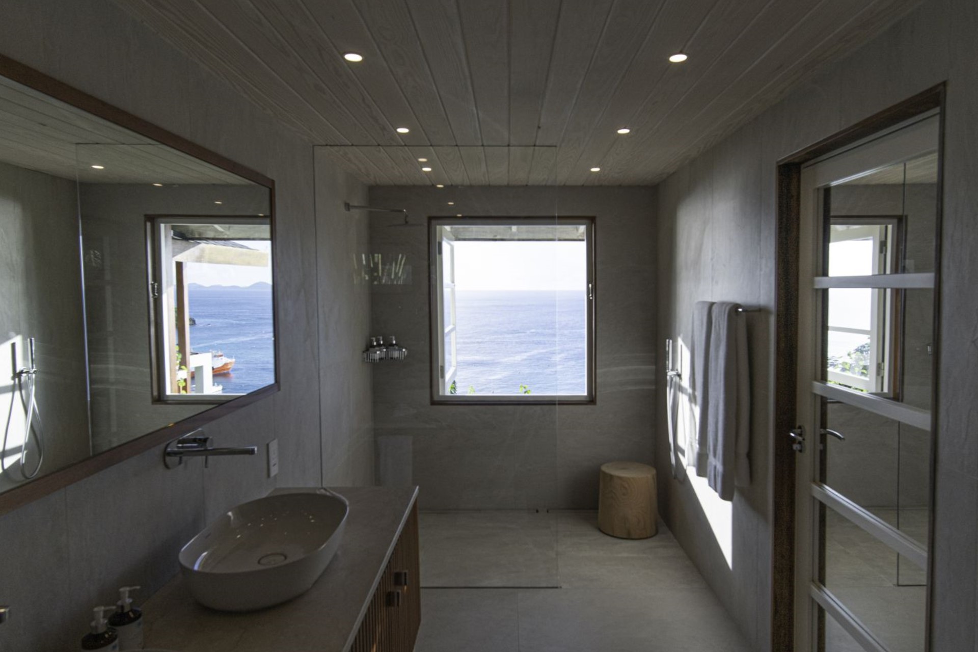 Bedroom 5 – queen-size bed, en-suite bathroom with shower, terrace access, and sea views
