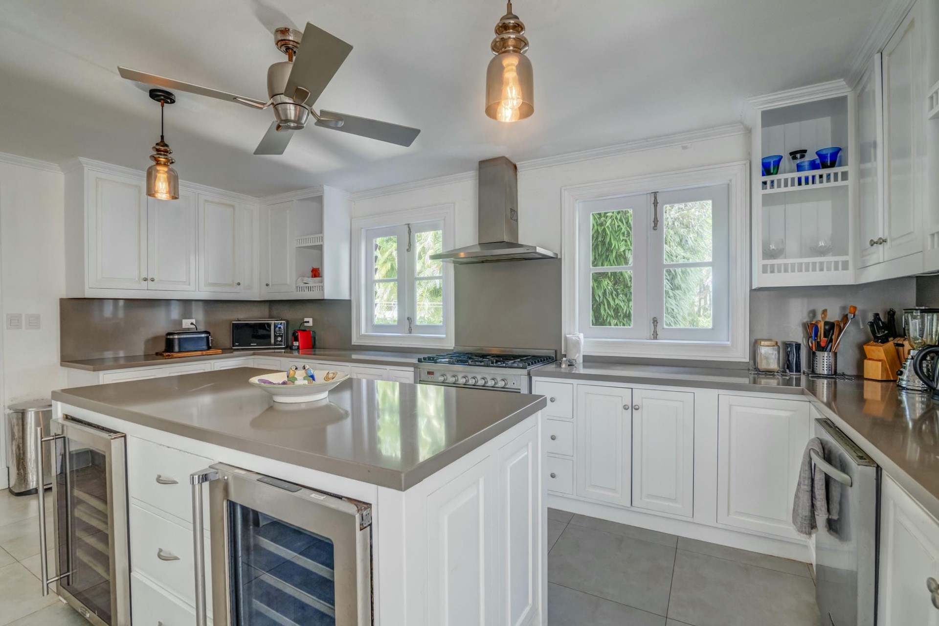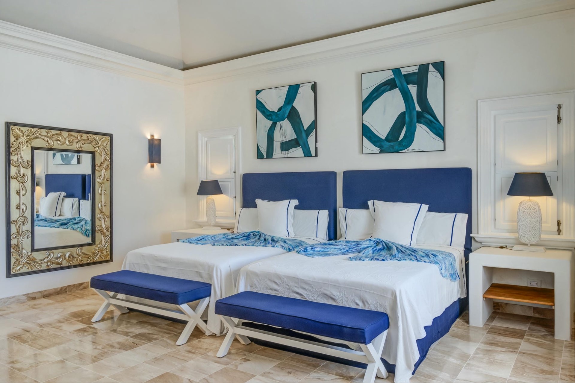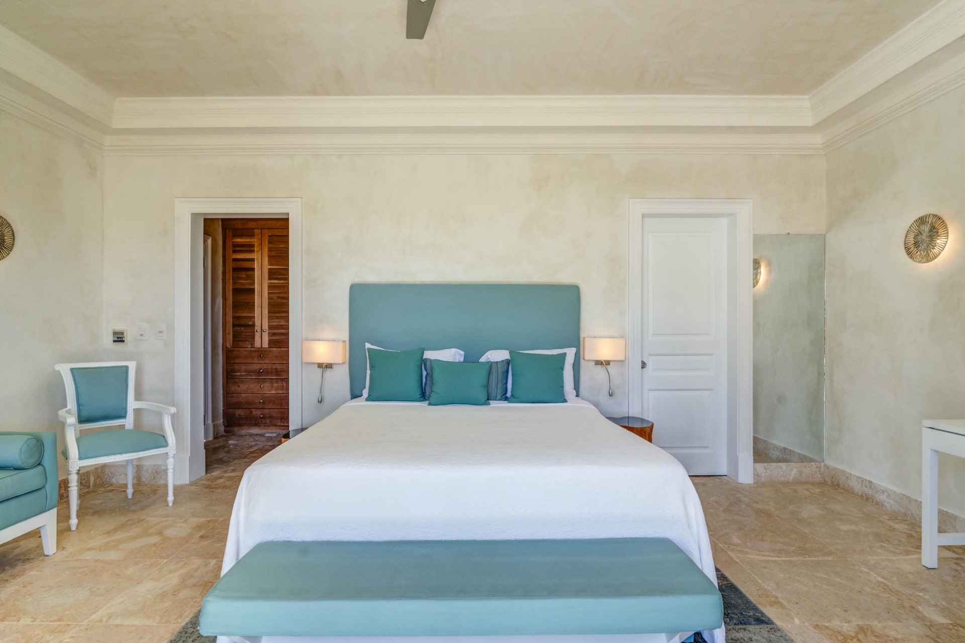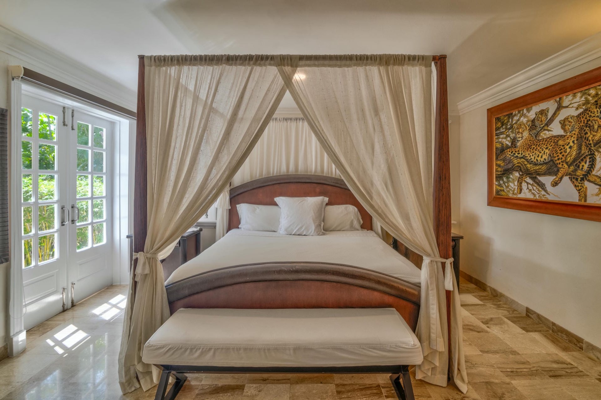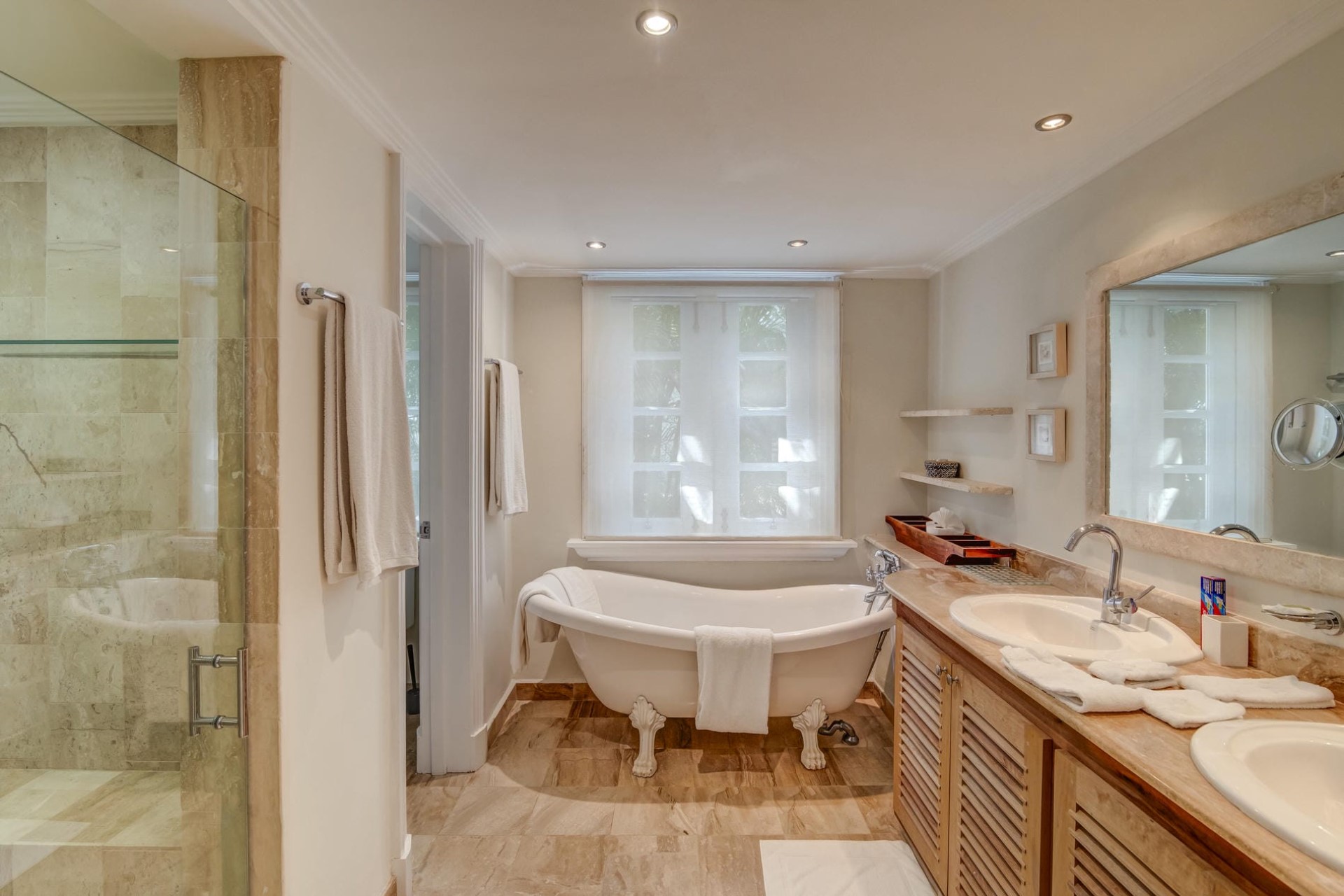 In the main villa, three en-suite bedrooms—one downstairs and two upstairs—offer great views of the gardens. The ground-floor king-size room enjoys the luxury of a claw-foot bathtub and a walk-in shower, while the upstairs rooms both include two queen-size beds perfect for sharing and benefit from elevated ocean views.