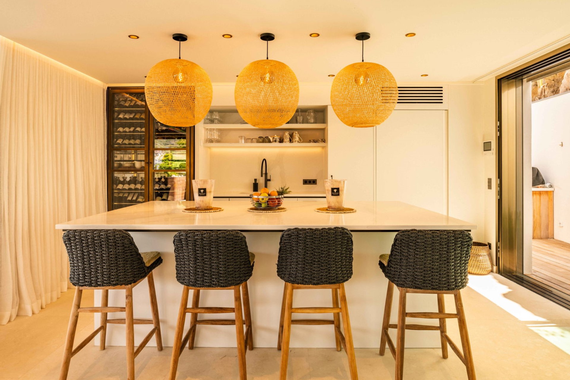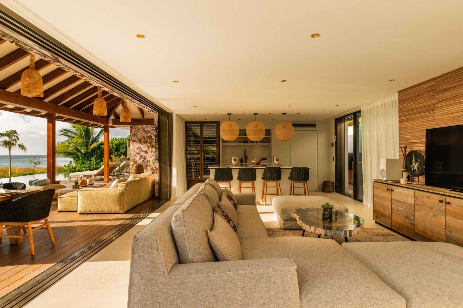 Inside, the villa boasts bright and open living areas, allowing natural light to flood the space while framing the stunning lagoon views. The modern kitchen is fully equipped with high-end appliances, providing an ideal space for preparing meals to be enjoyed in the elegant dining area or alfresco on the terrace. The open-plan layout enhances the villa’s airy and welcoming atmosphere.