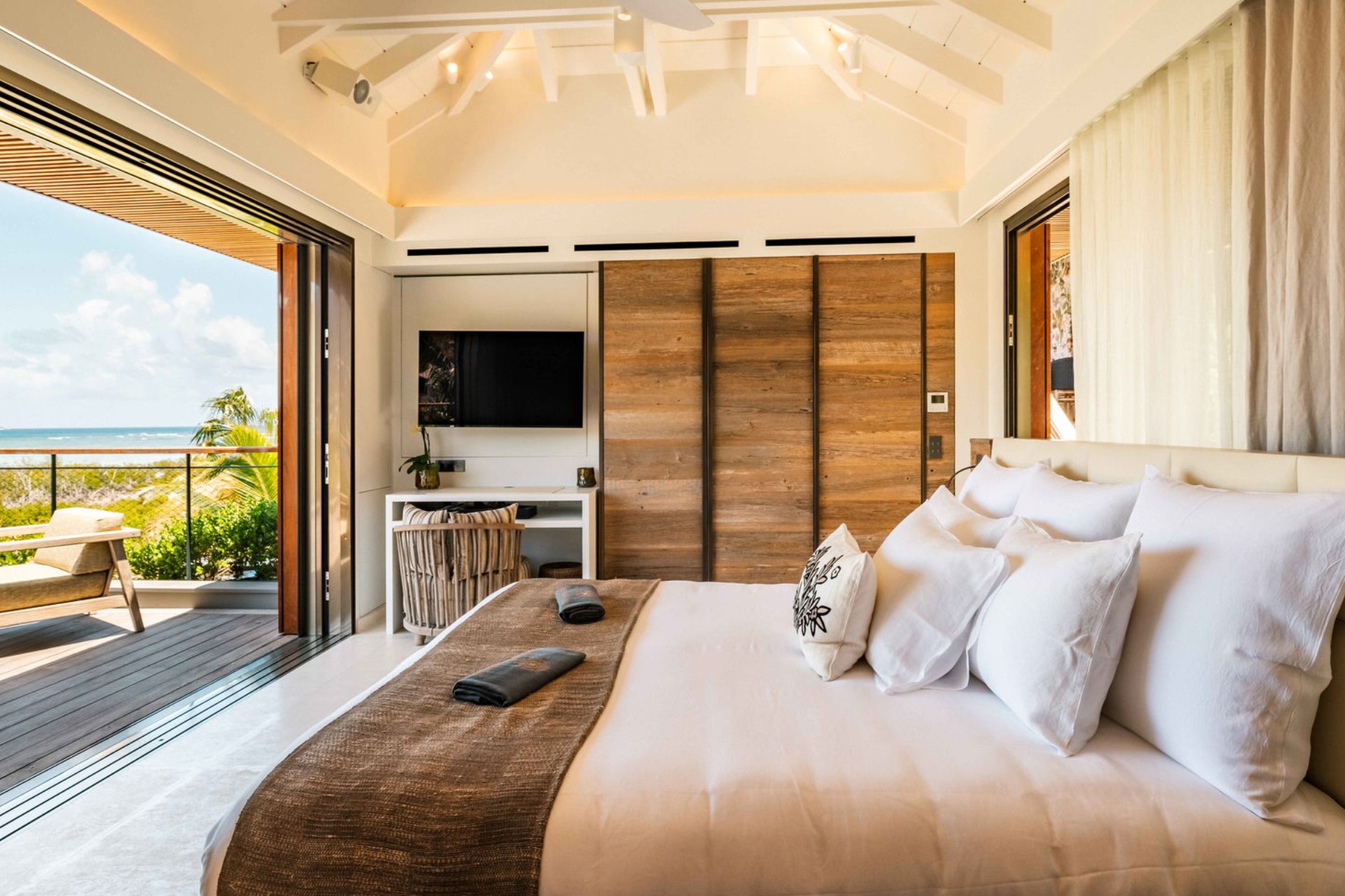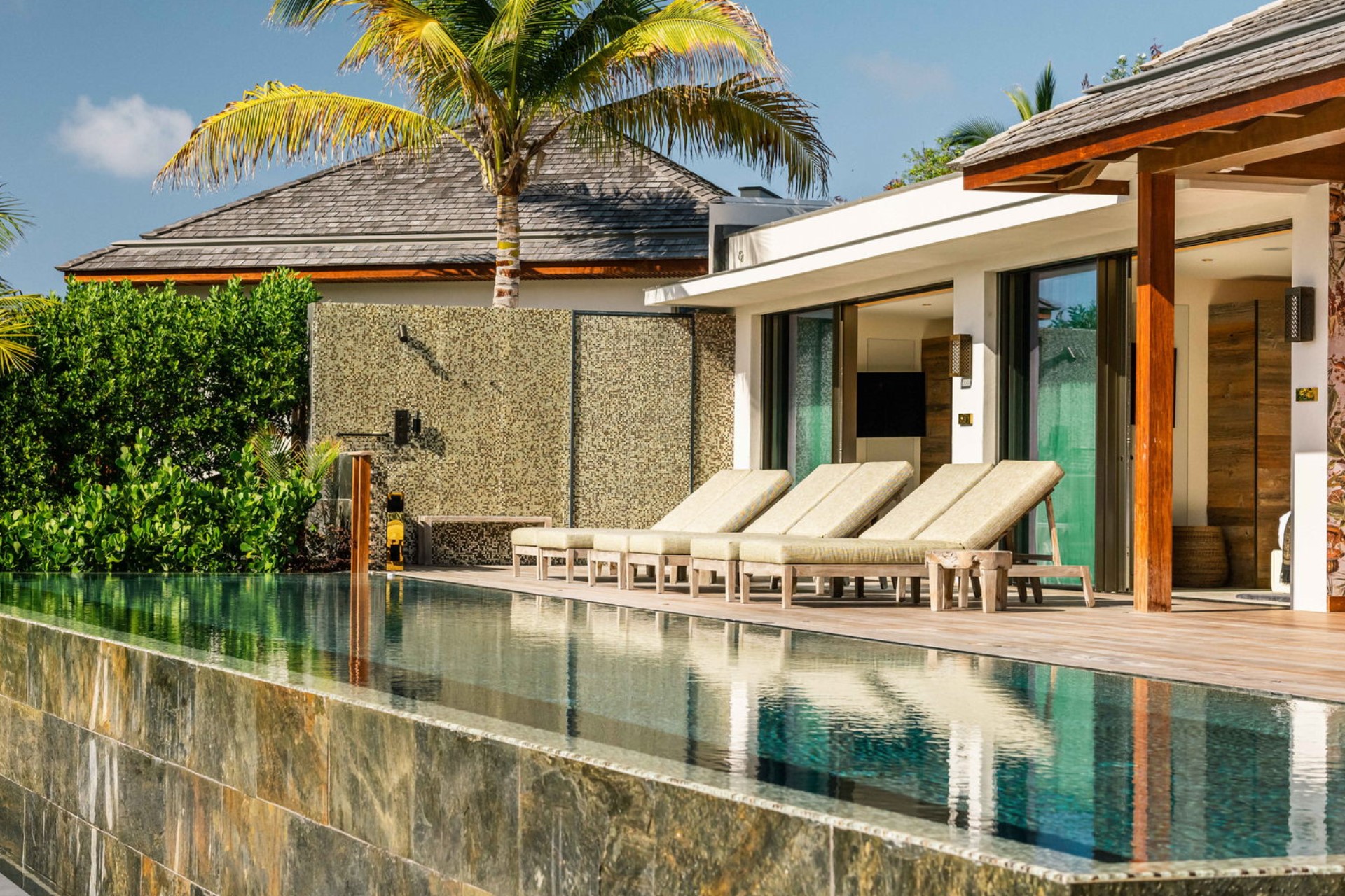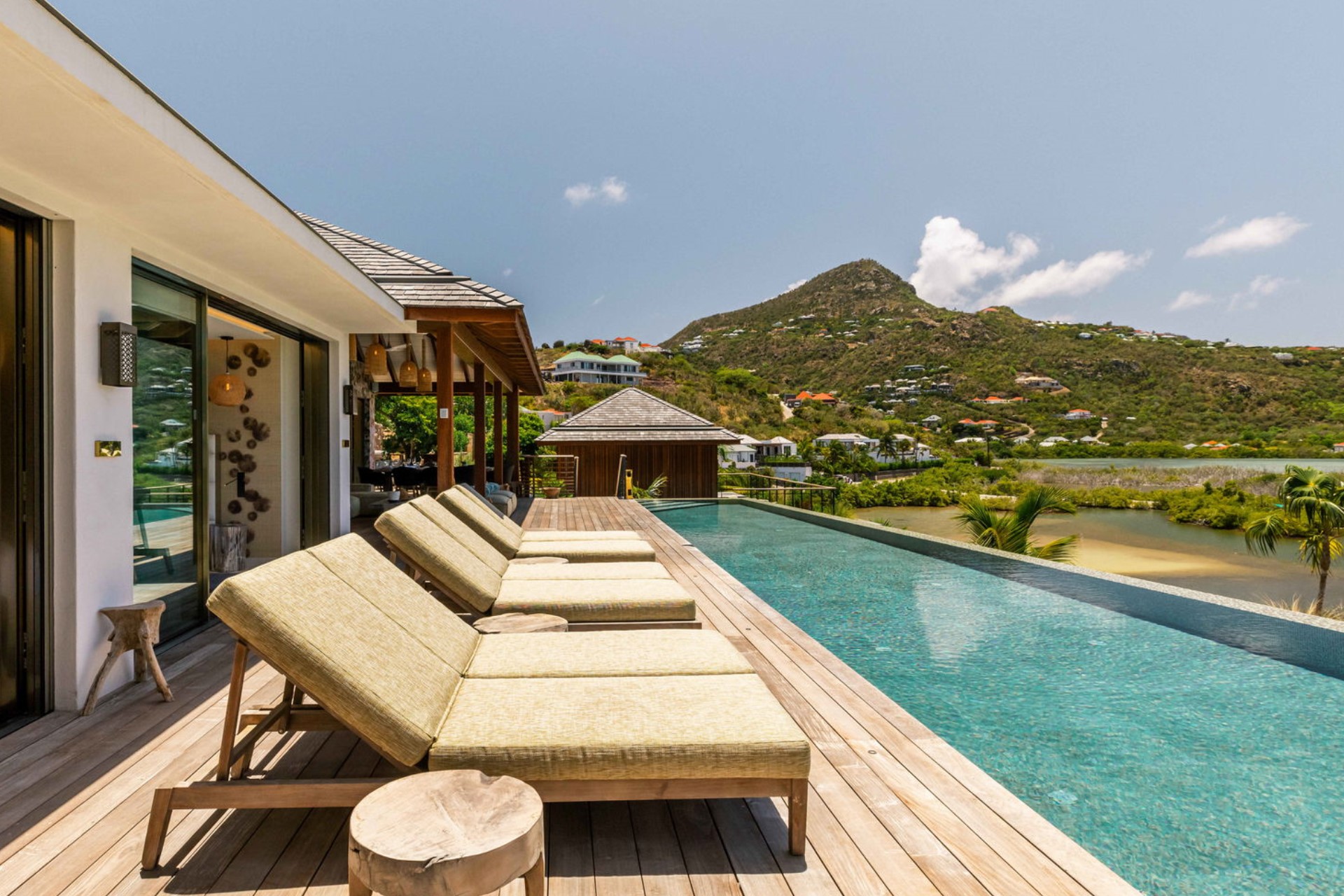 The villa’s outdoor spaces are designed for relaxation and enjoyment, featuring a heated swimming pool surrounded by a sun-drenched terrace with comfortable loungers. Guests can unwind by the pool while soaking in the Caribbean sun and admiring the beautiful lagoon views. A shaded seating area and the lush tropical garden further enhance the villa’s peaceful ambience, providing a harmonious connection to nature.