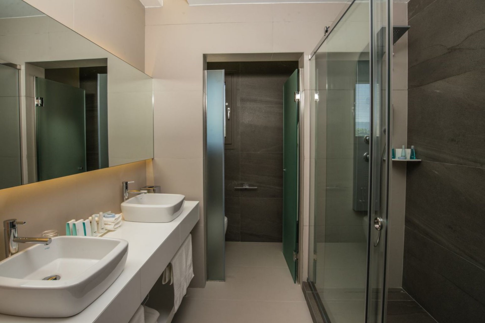 Bedroom 1 (Master) – double bed, lounge area, dressing room, ensuite bathroom with shower, and private balcony with sea views