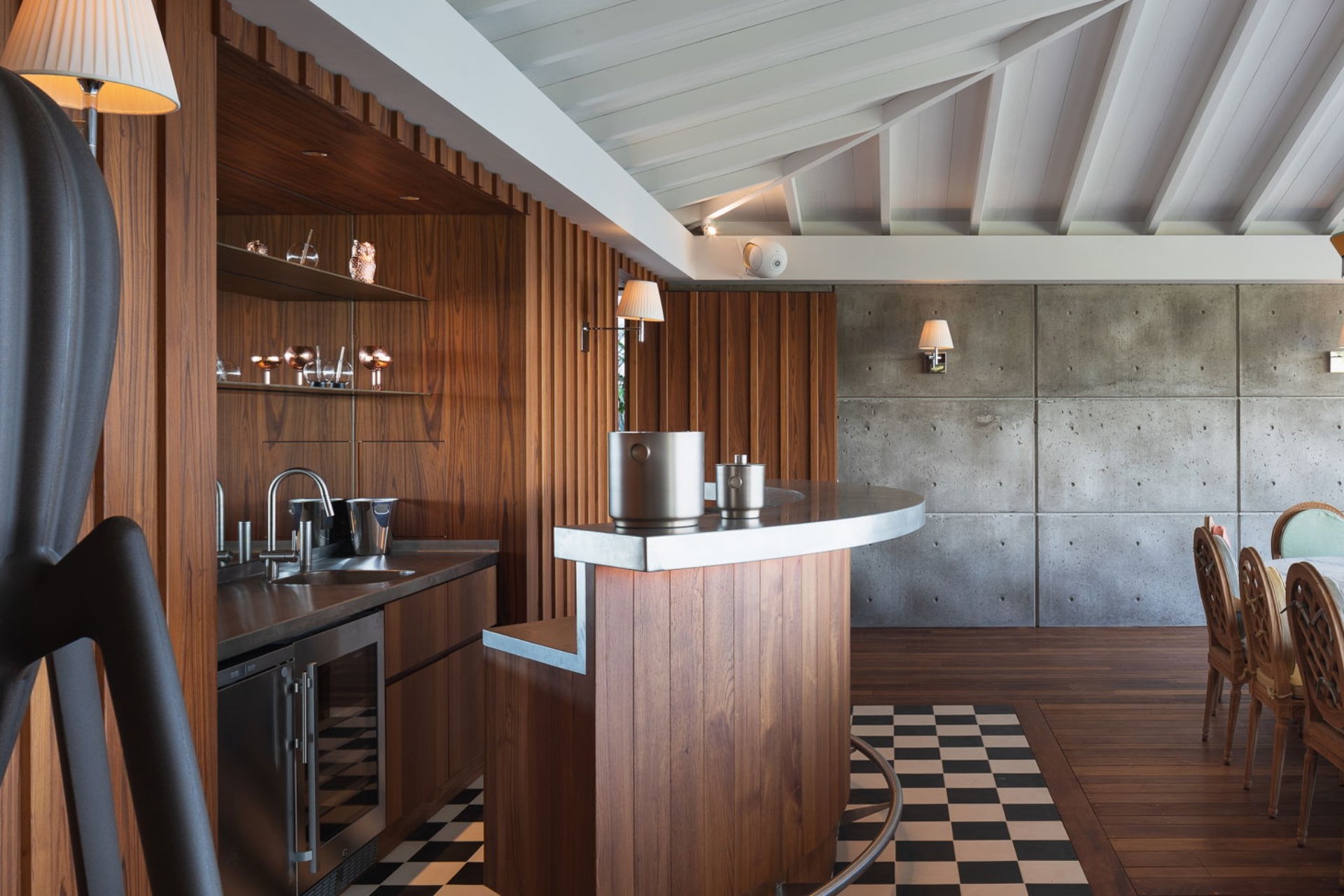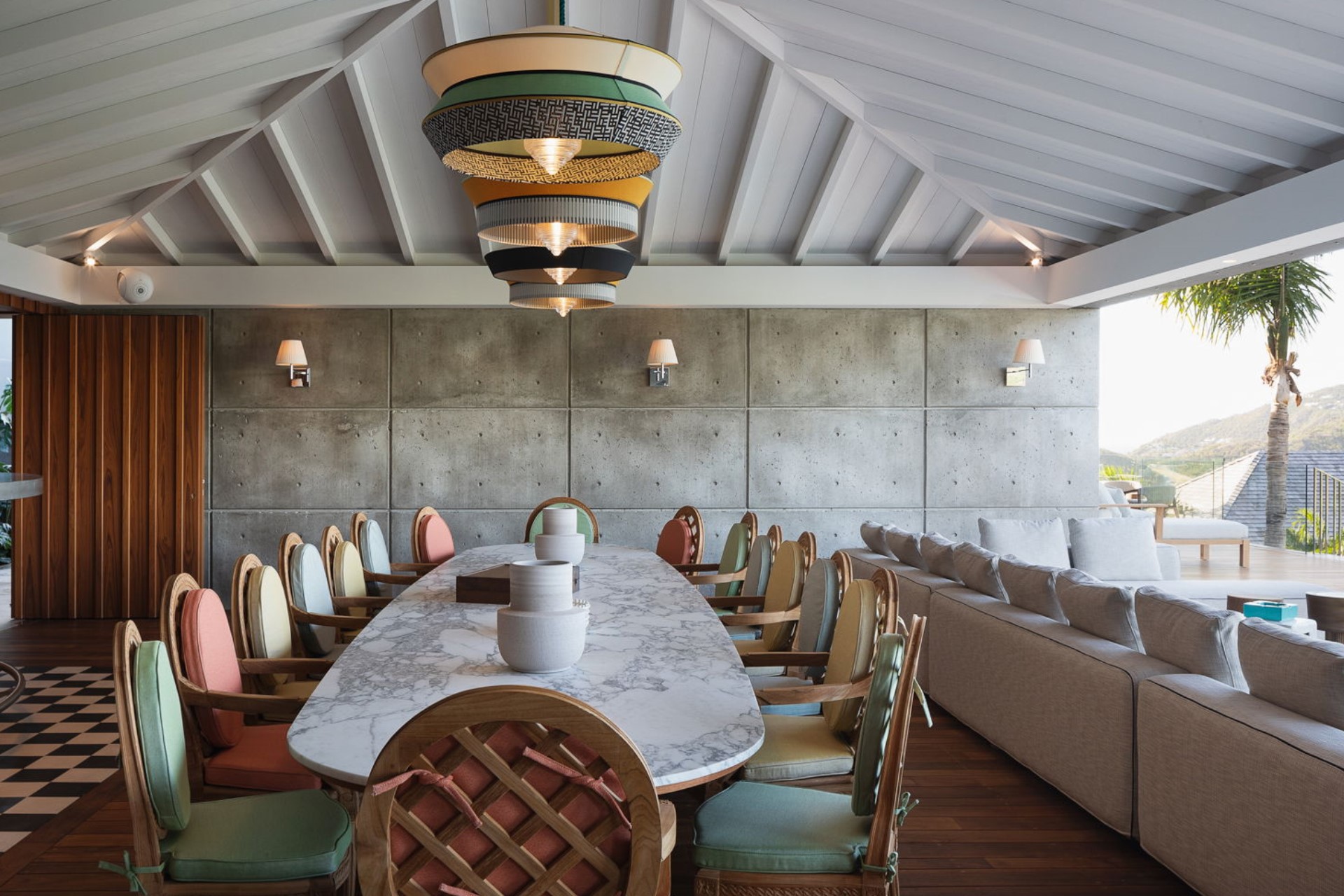 The villa’s outdoor area is a masterpiece of luxury and relaxation, centred around a 20-metre heated infinity pool that appears to merge seamlessly with the ocean. The expansive terrace is furnished with sunbeds, outdoor lounges, and coffee tables, creating an idyllic spot for soaking in the serene surroundings. A mosaic-covered Jacuzzi sits under the shade of palm trees, providing a perfect space for unwinding in absolute comfort. The covered alfresco dining area, featuring pastel-coloured chairs and seating for up to sixteen guests, is complemented by a cocktail bar, ideal for hosting gatherings with panoramic views.