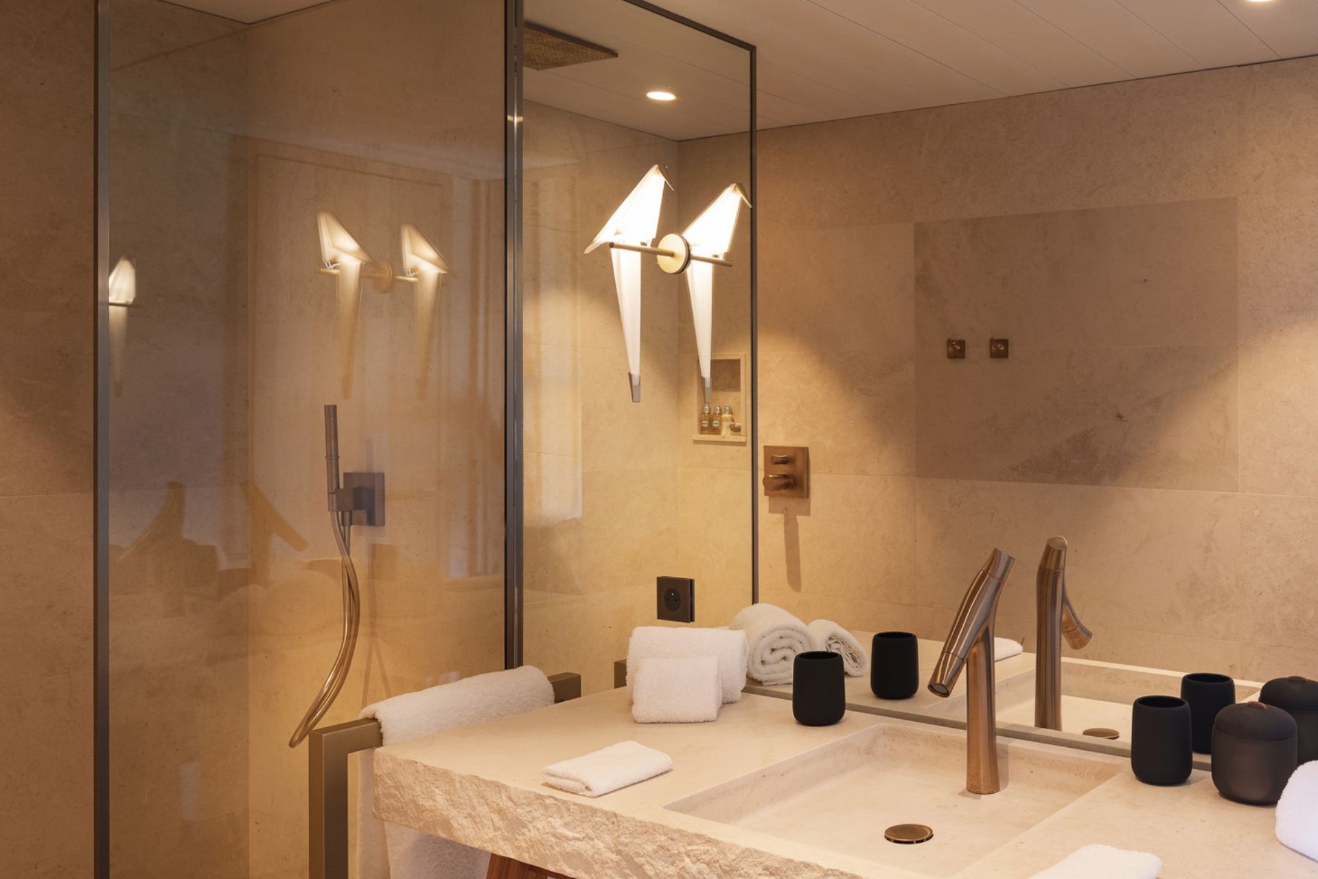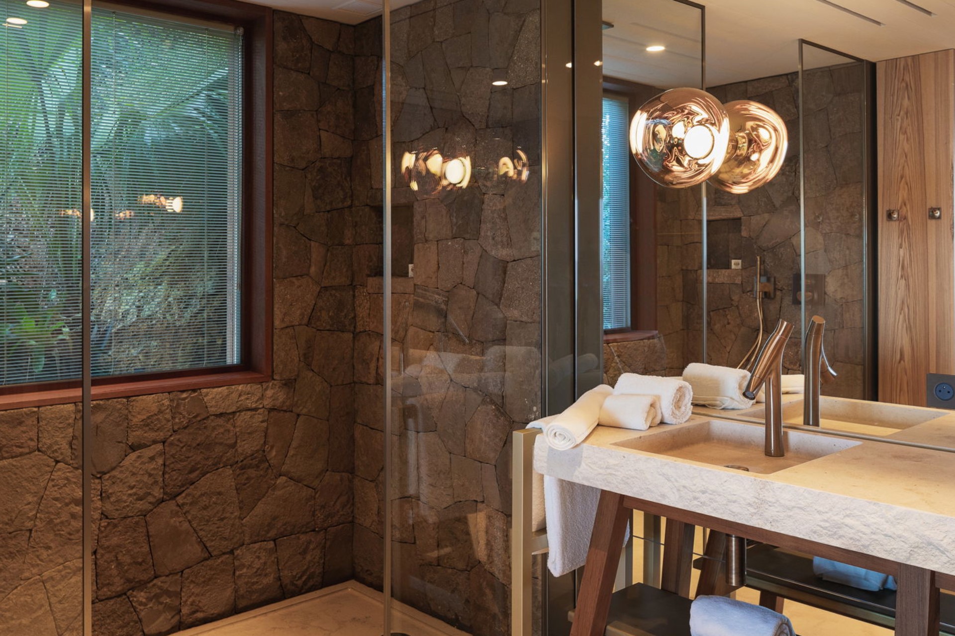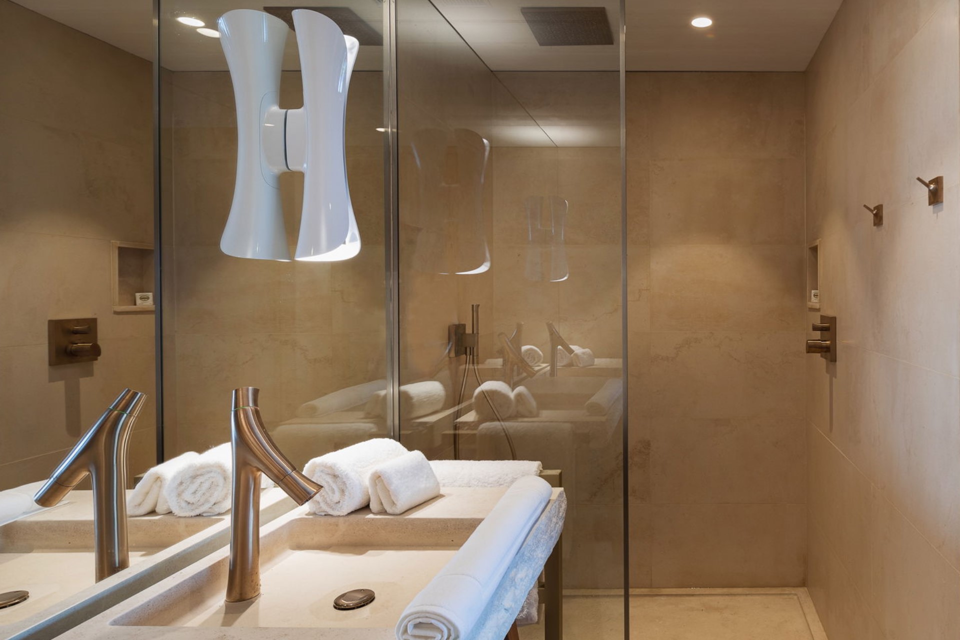 Bedroom 2 – king-size bed, en-suite bathroom with dual vanity and shower, pool terrace access