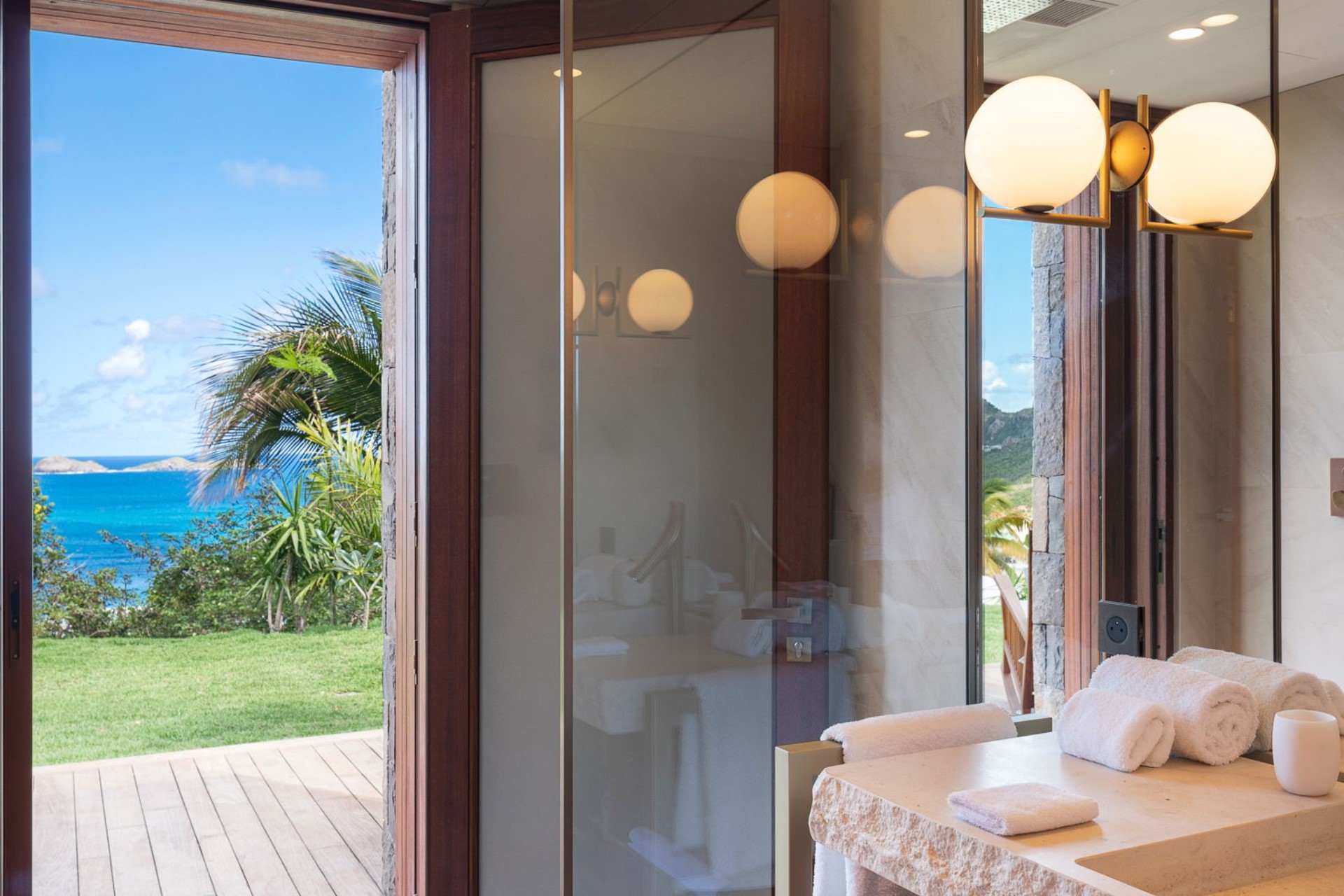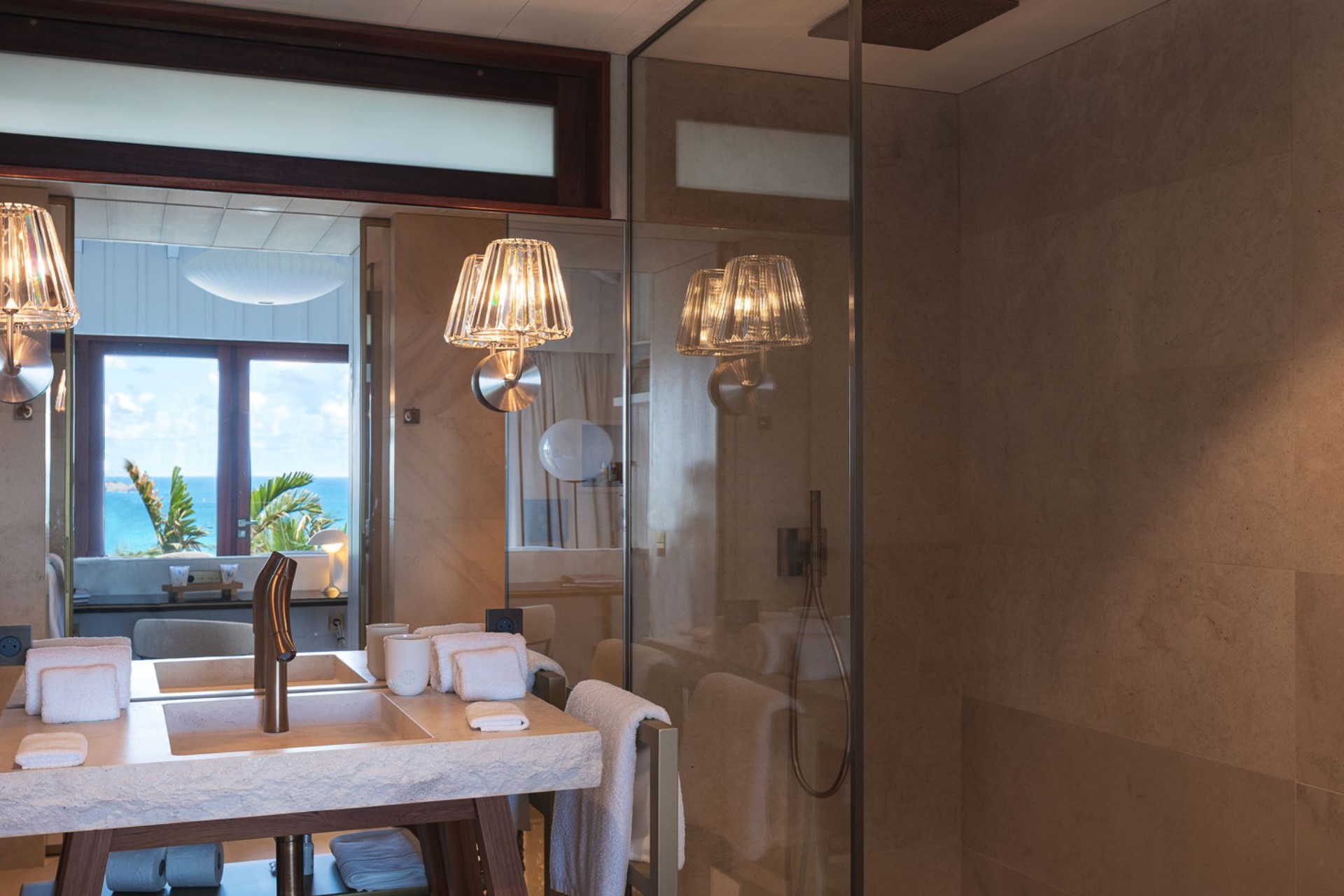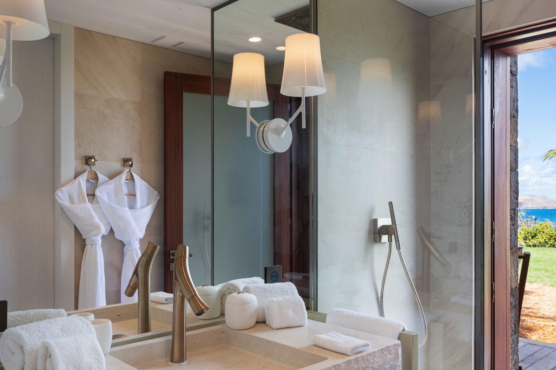 Bedroom 1 – king-size bed, en-suite bathroom with dual vanity and shower, terrace access with ocean view