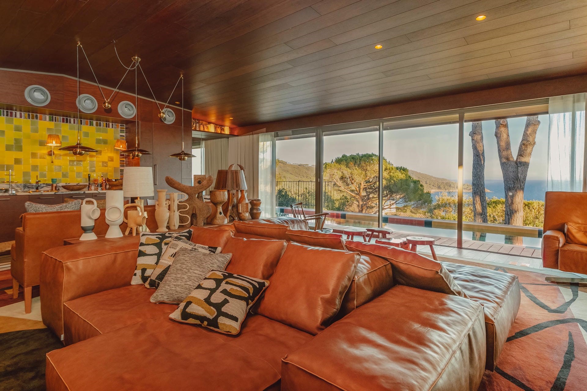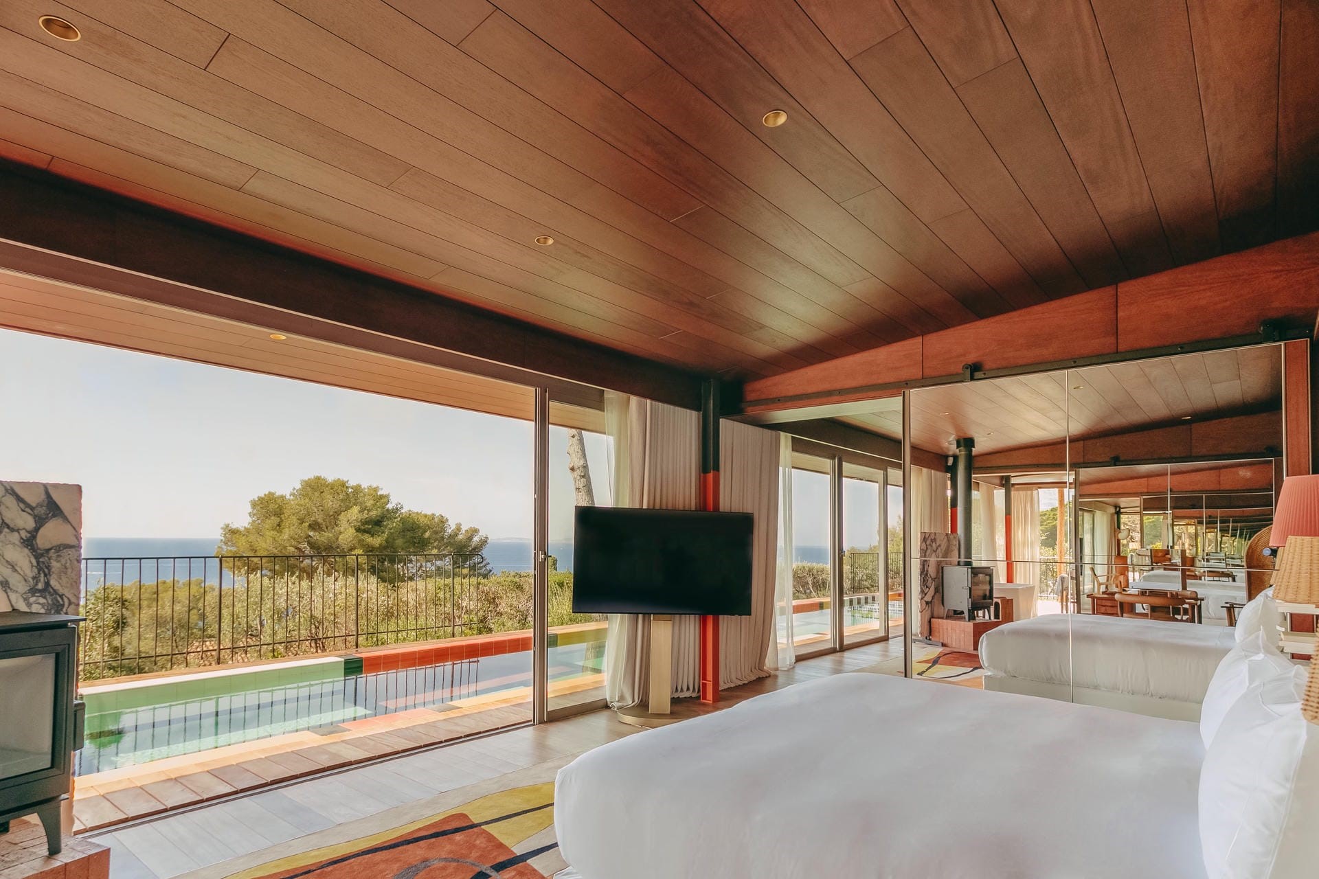 Inside, Villa W is spacious and distinctive, with custom furnishings and a retro-inspired contemporary design. The upper floor features the main living area – a wide, open-plan space with clean lines, warm wood accents, and a sculptural fireplace. A fully equipped kitchen sits just behind, and full-height glass doors lead out to the main terrace. The interiors reflect Starck’s signature style, from curved walls to design-led lighting, yet still feel relaxed and comfortable.