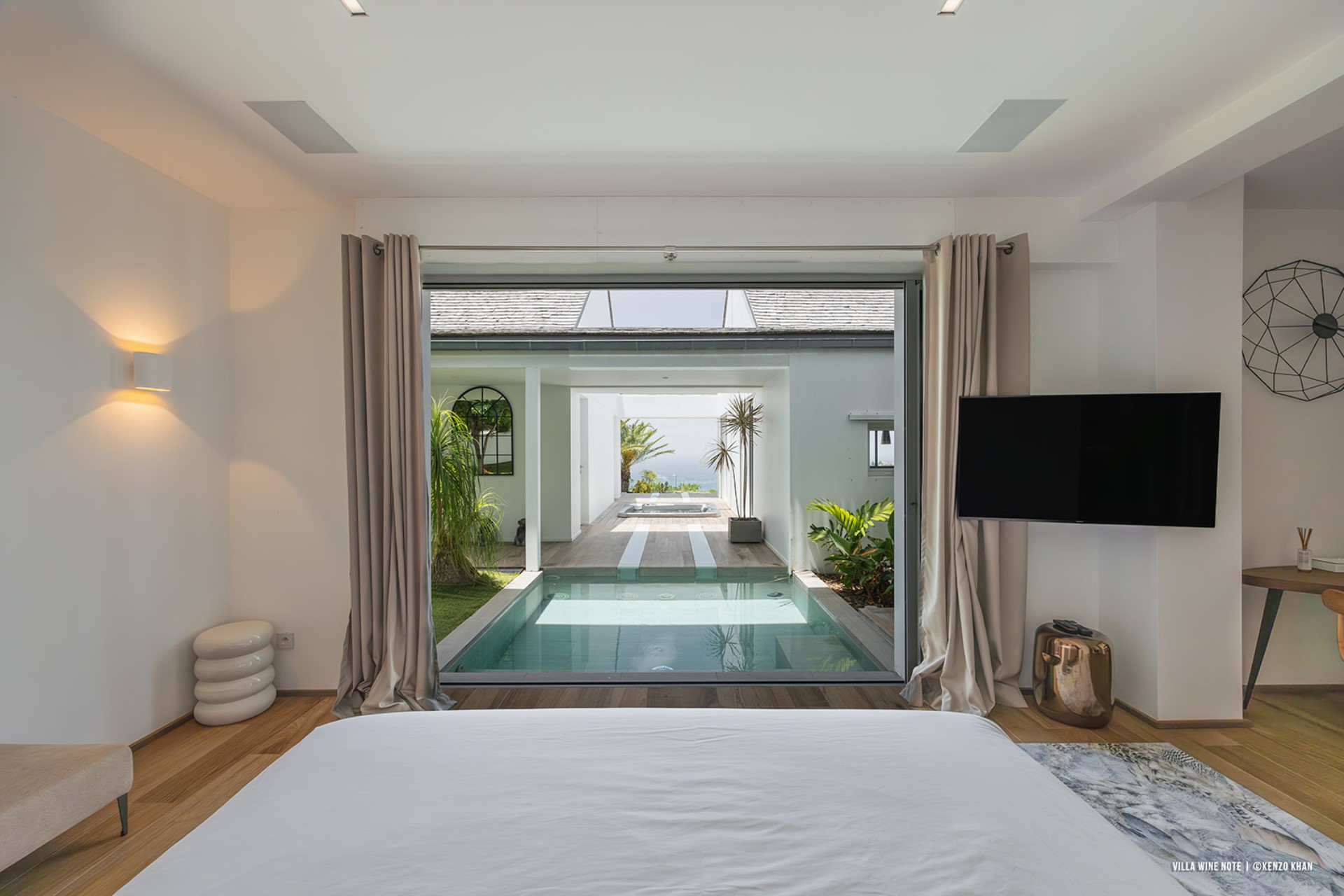 Bedroom 2 (Master) – king-size bed, en-suite bathroom with shower, and terrace access with reflecting pool and sea views