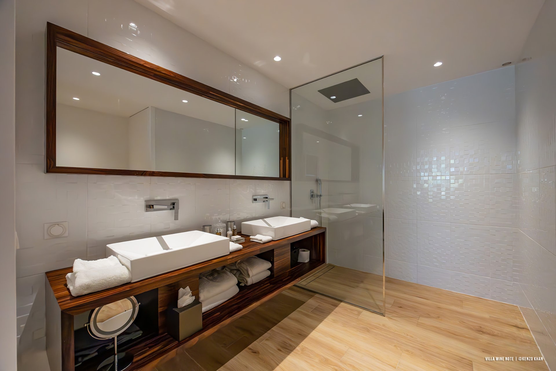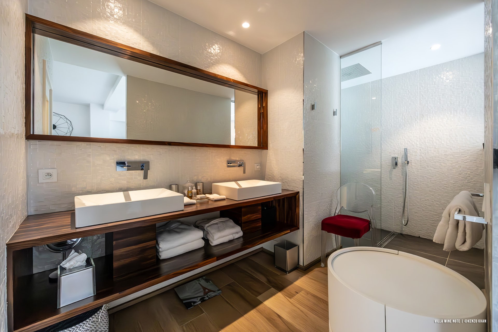 Indoors, the living room is very spacious and can be opened up to enjoy the views. Next to it lies the fully-equipped kitchen. Between the two, there is a large wine display, with a collection of rare wines with more than 1000 Grands Crus for discerning connoisseurs.